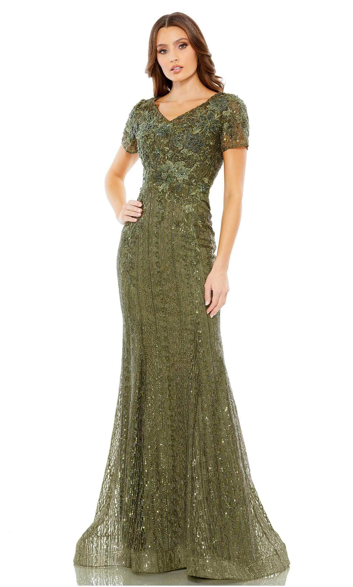 Be elegant on your next upcoming special event as you wear this fabulous creation from Mac Duggal 20282. This stunning masterpiece is made with embroidery and embellished with beads and sequins that feature a V-neckline on a bodice perfectly framed with short sleeves. The back has a center zipper closure for a great fit. It parades a trumpet silhouette that flares on the bottom of the dress. Wear this Mac Duggal 20282 to look absolutely gorgeous. Model is wearing Dark Grey color.