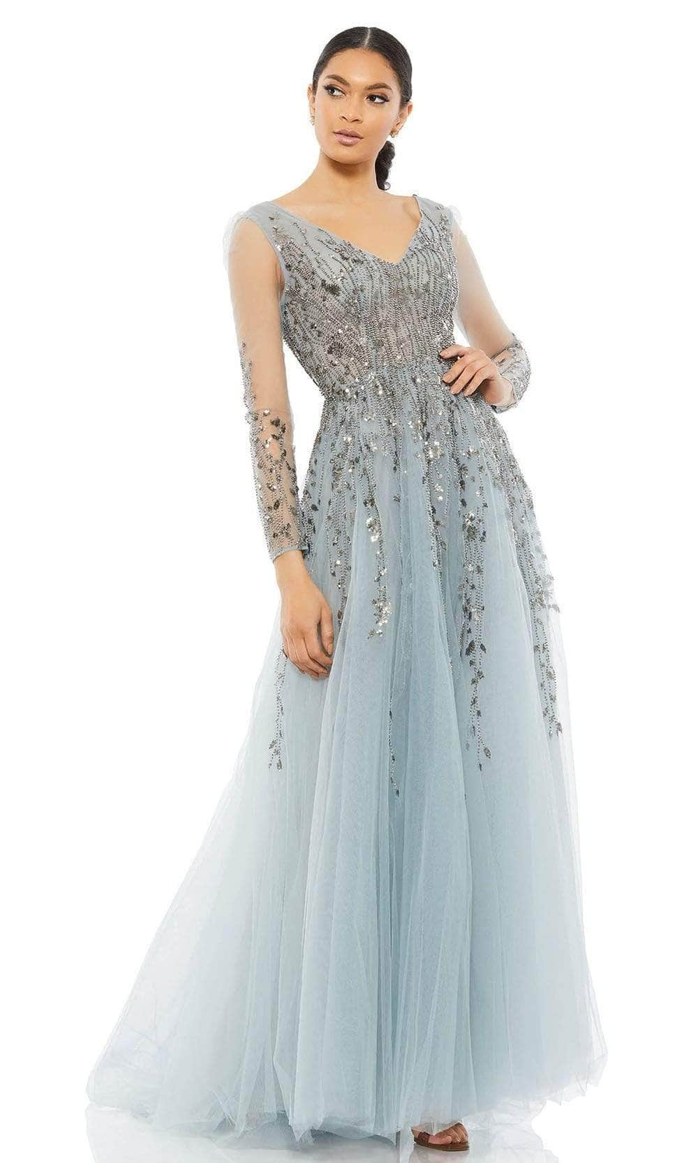 Be the lady of the night in this Mac Duggal 20295 creation. Beaded appliques beautify the whole dress as the fitted bodice features a V neckline and slender sheer long sleeves while the back flaunts a low V-shaped open cut enclosed with a center zipper closure. The skirt reveals a flowy A-line skirt and runs at full length hem with a sweep train finish. This Mac Duggal design is a classic look that works for many special occasions.