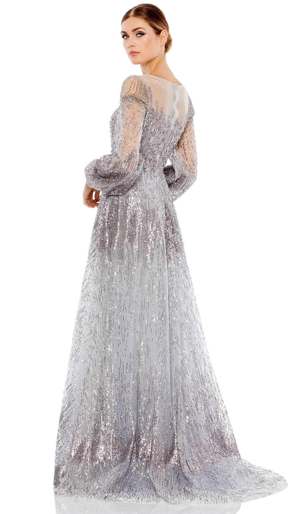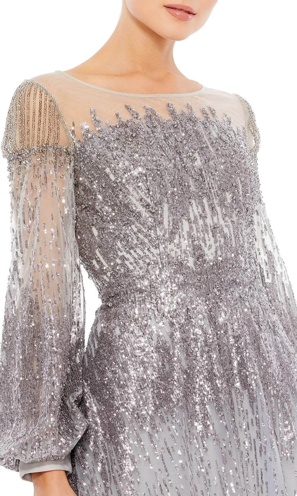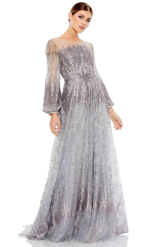 Clothe yourself in a creative couture with this mellifluous Mac Duggal 20307 masterpiece. Adorned with reflective foliage sequins which will leave you shimmering all night long. This dress flaunts a modest fashionable style with its illusion high neckline and back, paired with classic long bishop sleeves. Finished with a zipper at the back and an A-line skirt that cascades to a brush of train, this dress is captivating. Turn heads while glowing with beauty in this enchanting Mac Duggal masterpiece. Models are wearing Platinum, and Black colors.