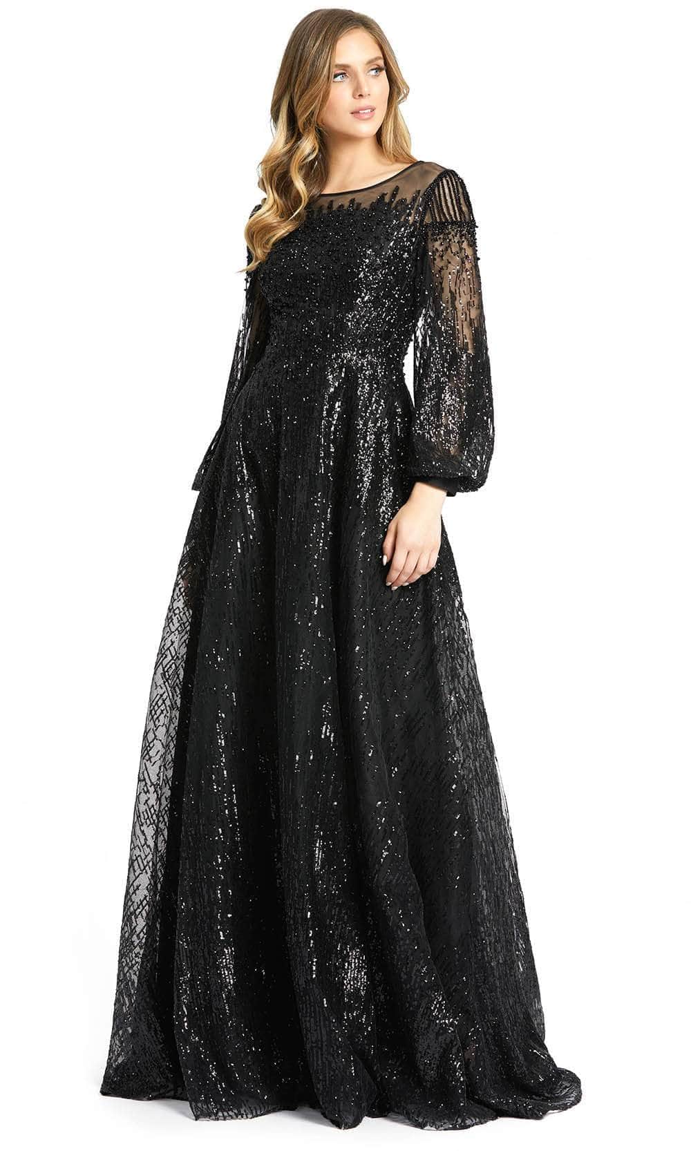 Clothe yourself in a creative couture with this mellifluous Mac Duggal 20307 masterpiece. Adorned with reflective foliage sequins which will leave you shimmering all night long. This dress flaunts a modest fashionable style with its illusion high neckline and back, paired with classic long bishop sleeves. Finished with a zipper at the back and an A-line skirt that cascades to a brush of train, this dress is captivating. Turn heads while glowing with beauty in this enchanting Mac Duggal masterpiece. Models are wearing Platinum, and Black colors.