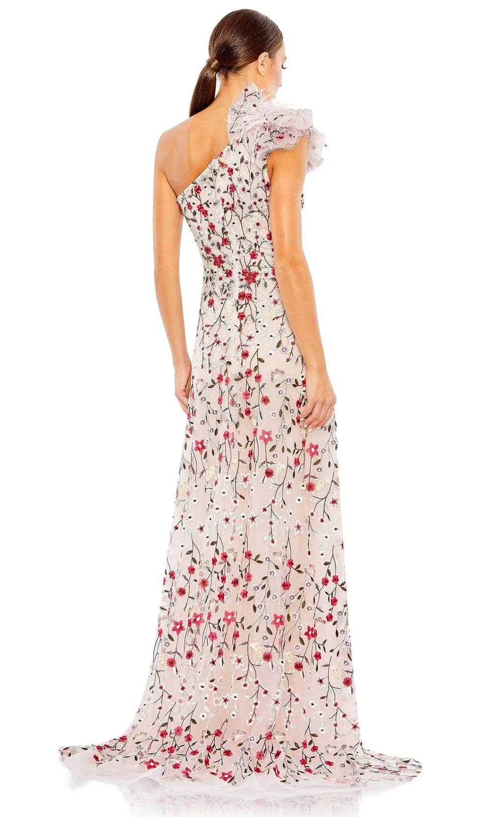Glow with exquisite elegance in this Mac Duggal 20331 masterpiece. This girly dress is fashioned from embroidered tulle in flowery garden motif, and it features an asymmetrical neckline fashioned with a delicate ruffled layers that are appliqued on top of the shoulder. From your natural waist, an A-line skirt streams to the floor with a thigh-high leg slit exposing your sexy legs, and a sweep train finish. The back zipper holding the bodice ensures a perfect fit. All eyes will be on you in this elegant evening gown by Mac Duggal. Models are wearing Rose Multi, and Black Multi colors.