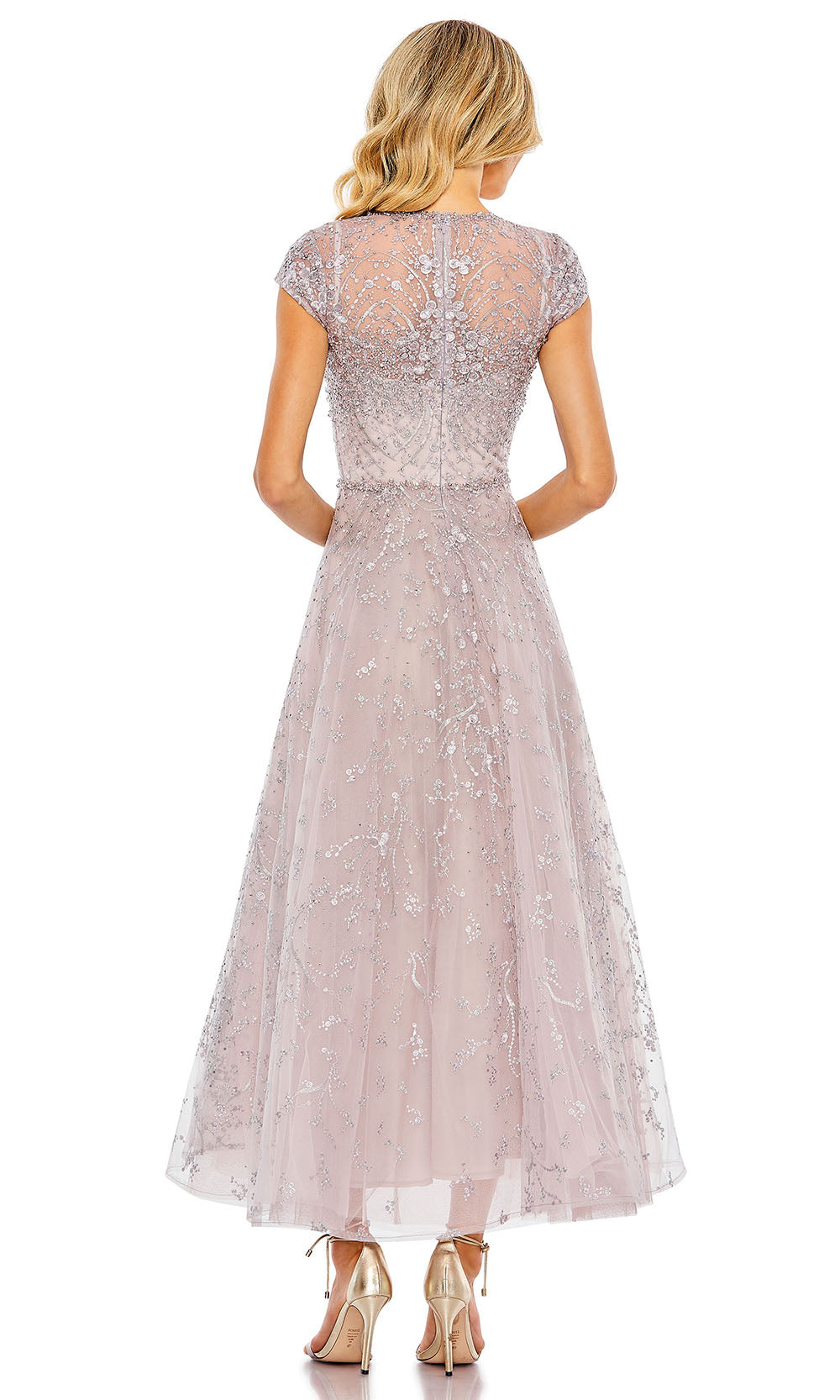 Refinement and intricate detail define this Mac Duggal 20338 tea-length dress that captures the essence of graceful femininity. The ensemble is framed with a jewel illusion neckline and soft cap sleeves, accenting the fully embellished bodice. Intricate beaded embroidery adds sparkle while remaining delicately understated. The natural waistline flows into a layered A-line skirt that drapes elegantly to tea-length hem, offering both volume and movement. Ideal for upscale occasions, Mac Duggal 20338 dress delivers beauty, structure, and soft shimmer in one unforgettable piece. Model is wearing Lilac color.
