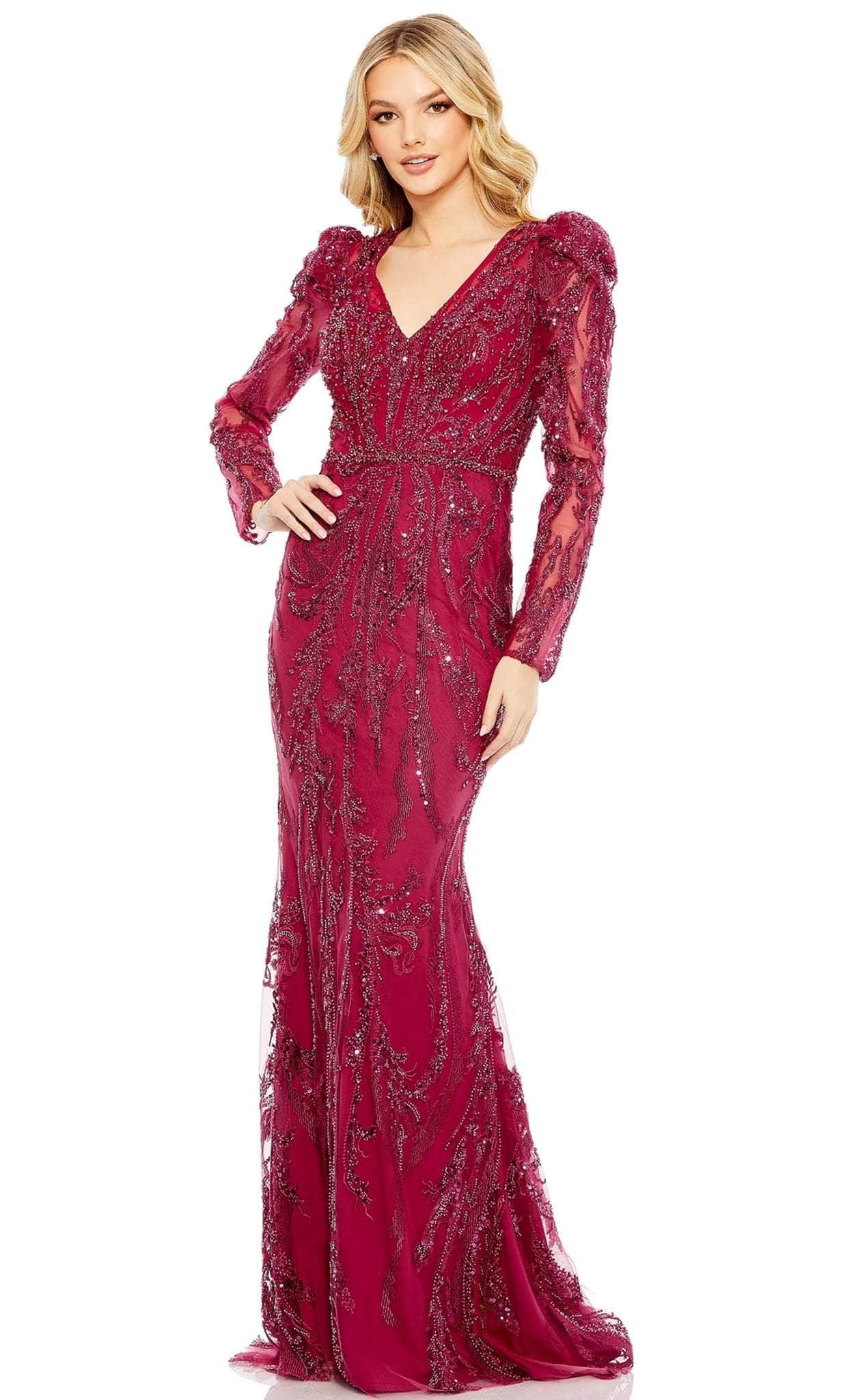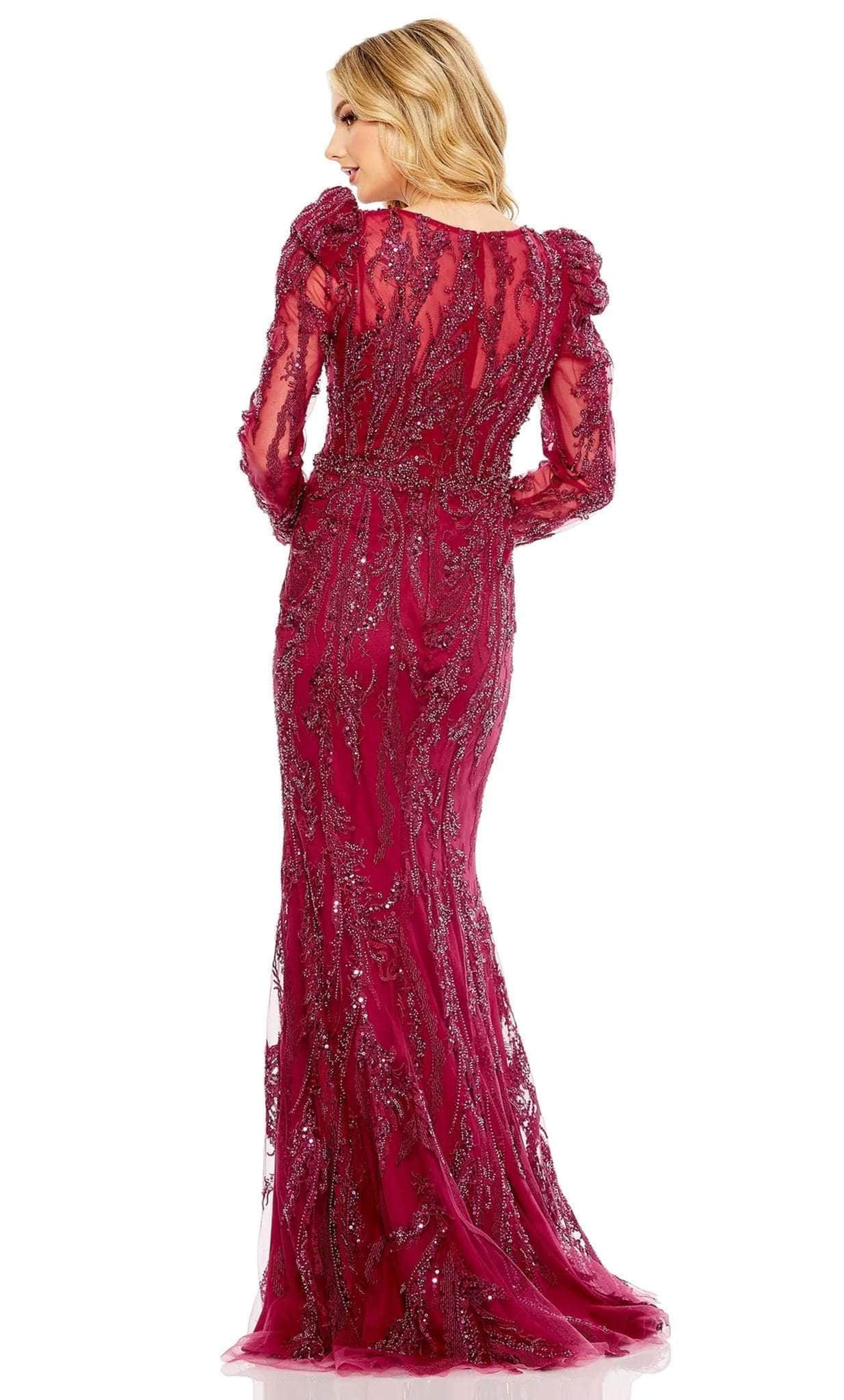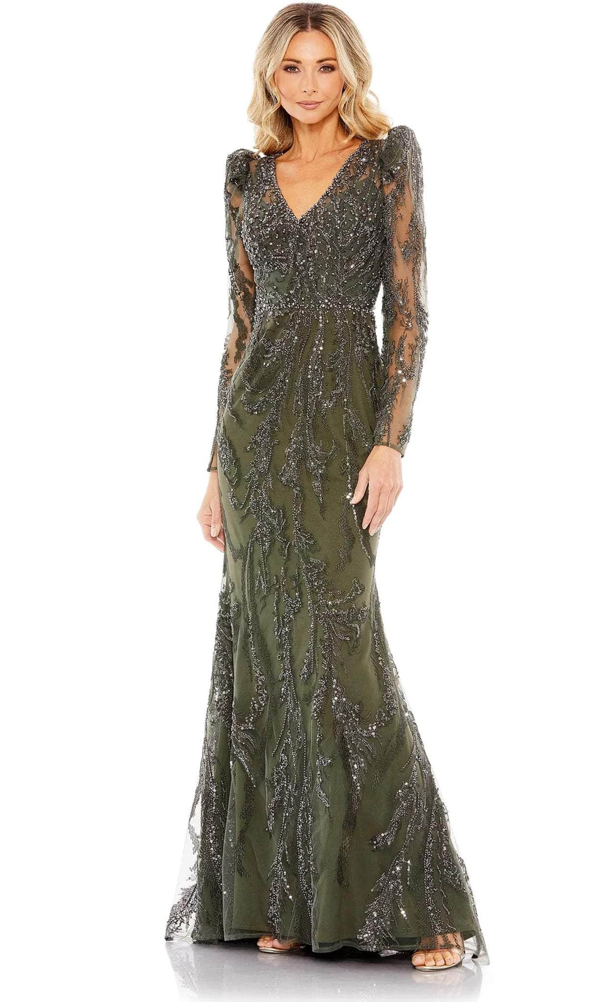 Glow with opulence while fascinating everyone in this inspired Mac Duggal 20349 creation. Exceptionally detailed with intricate beadwork streaming along its ethereal overlay, this beauty parades a v-neckline on a fully lined bodice. Detailed with puff shoulders atop its sheer long sleeves, this stunner also features a sheer back with a zipper closure. The mermaid skirt sculpts and flares into a brush of shimmering train. Be bound to steal the spotlight in this Mac Duggal masterpiece. Models are wearing the Berry, Mocha and Olive colors.