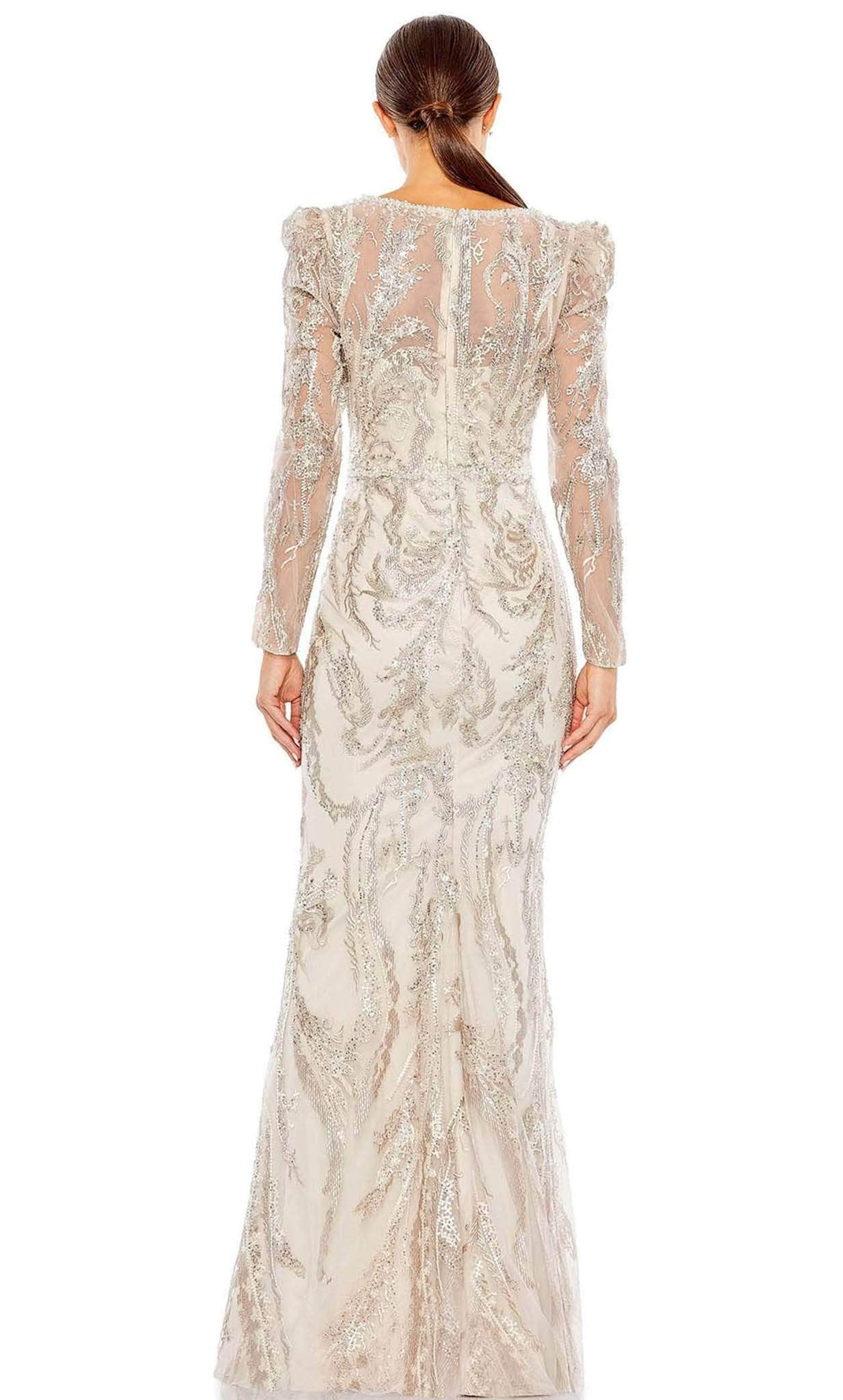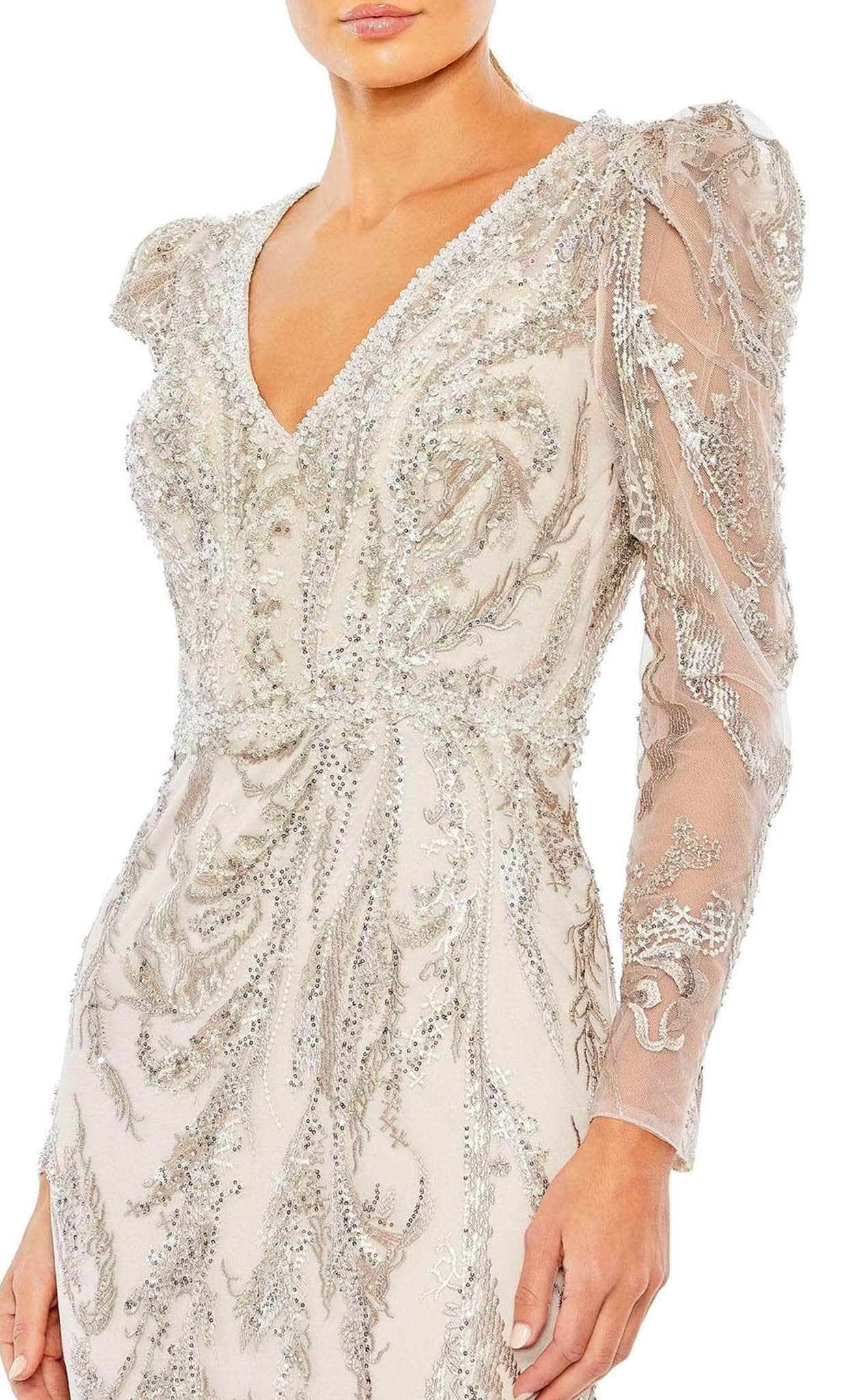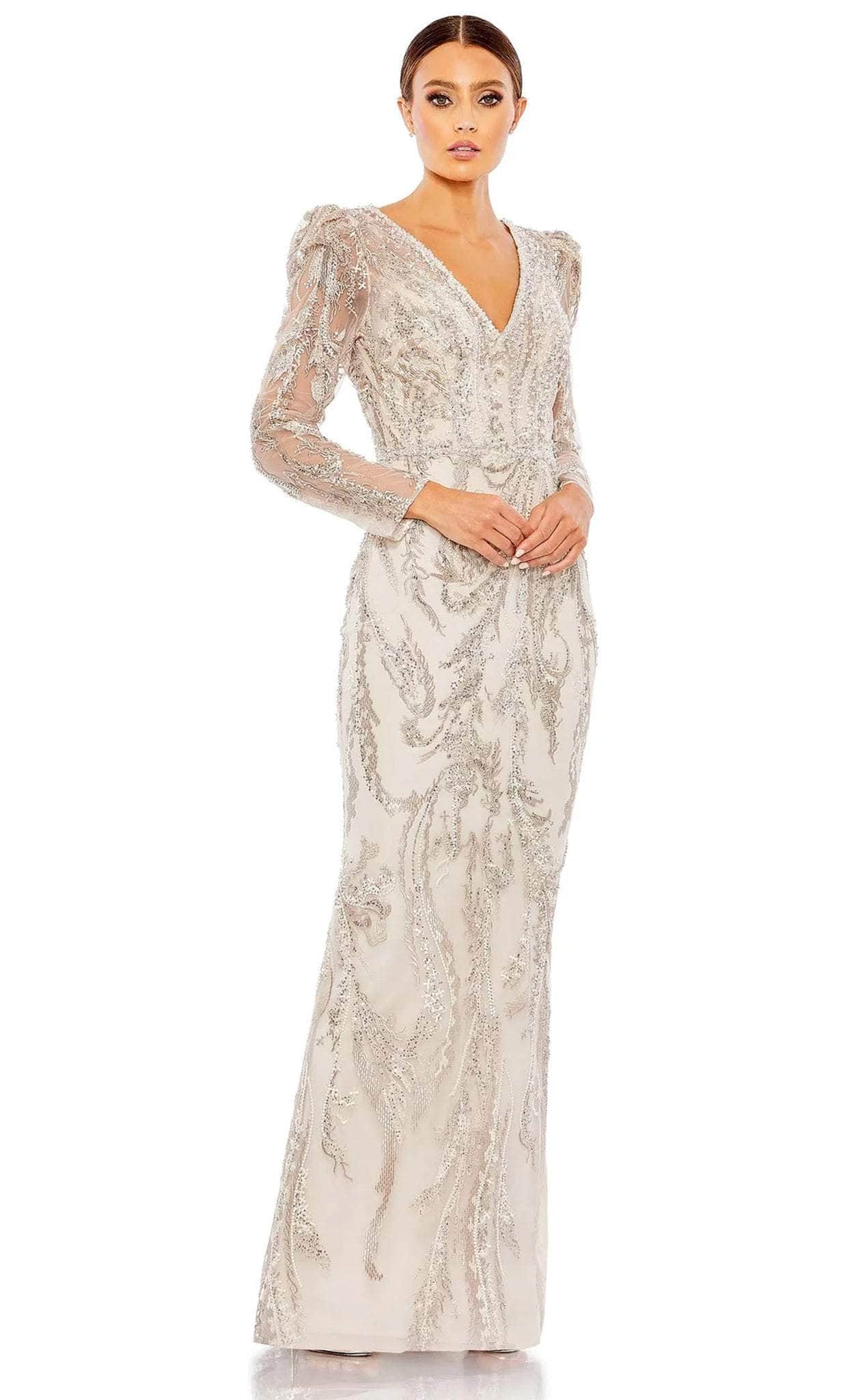Glow with opulence while fascinating everyone in this inspired Mac Duggal 20349 creation. Exceptionally detailed with intricate beadwork streaming along its ethereal overlay, this beauty parades a v-neckline on a fully lined bodice. Detailed with puff shoulders atop its sheer long sleeves, this stunner also features a sheer back with a zipper closure. The mermaid skirt sculpts and flares into a brush of shimmering train. Be bound to steal the spotlight in this Mac Duggal masterpiece. Models are wearing the Berry, Mocha and Olive colors.