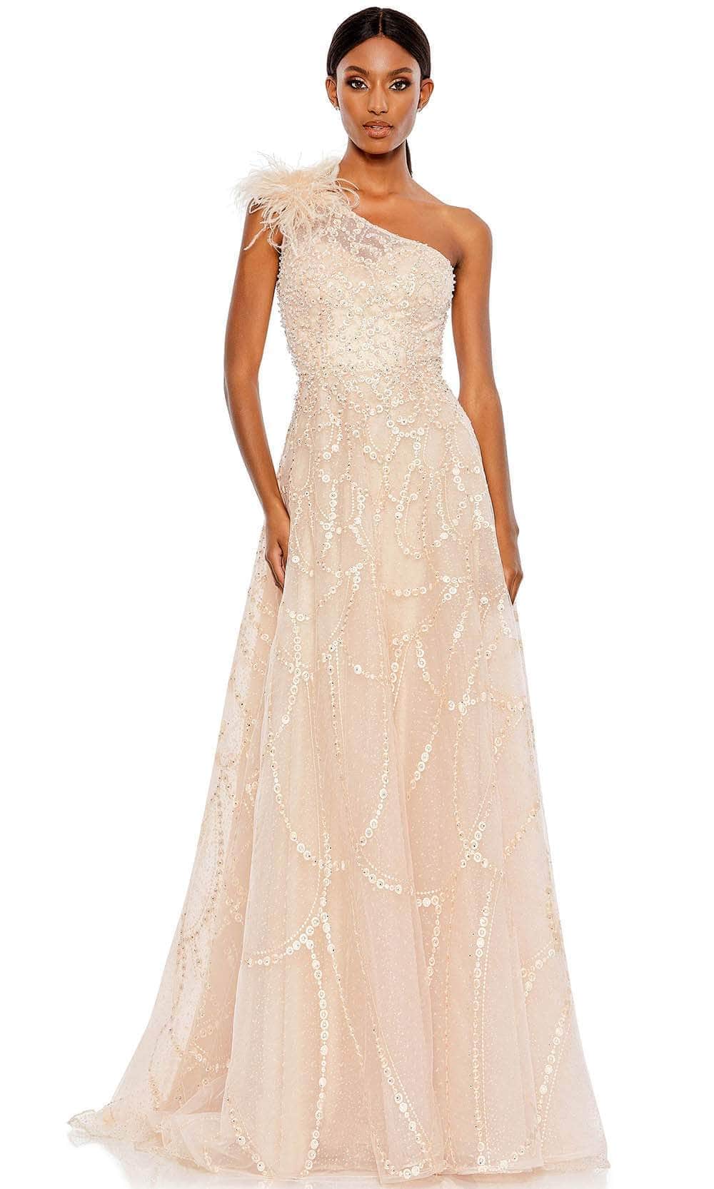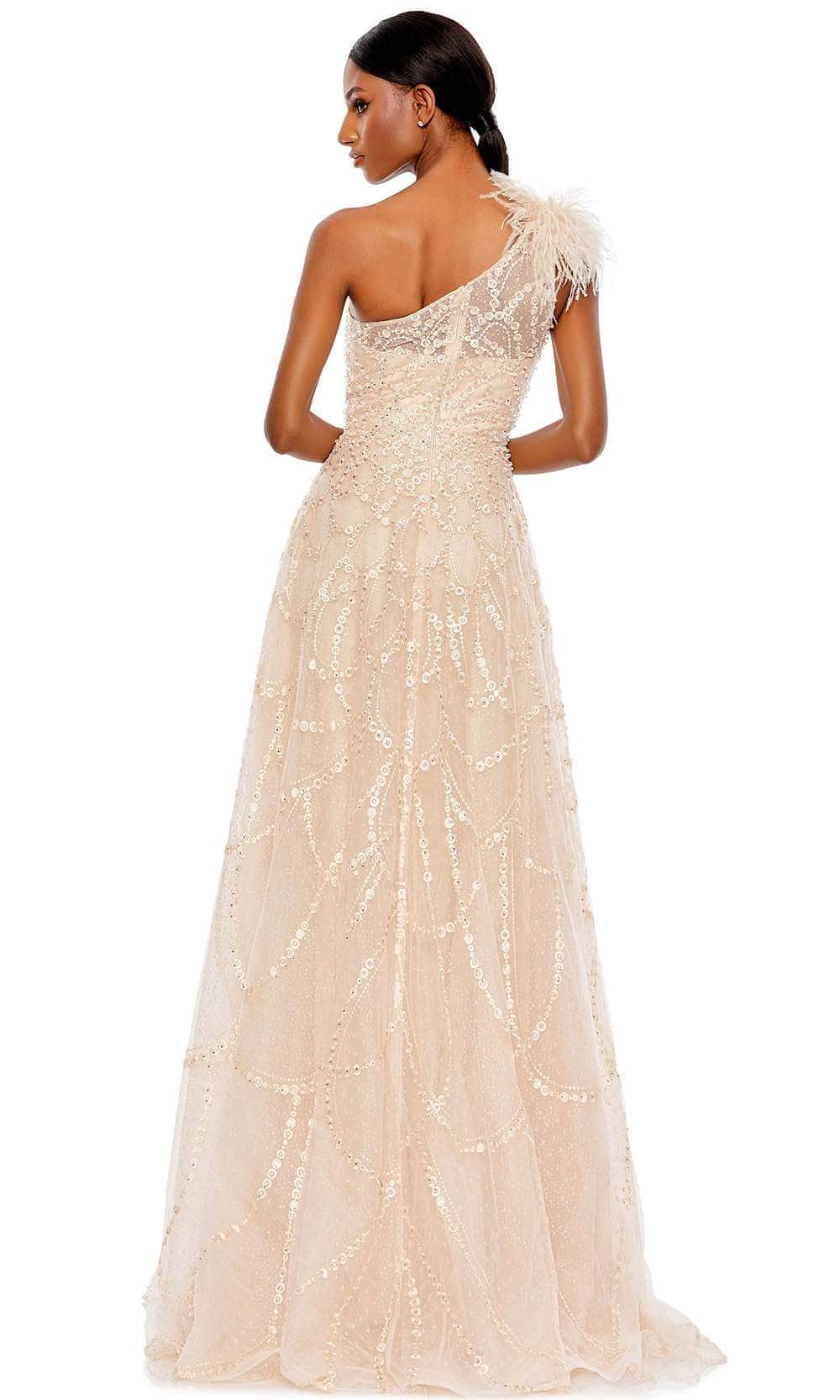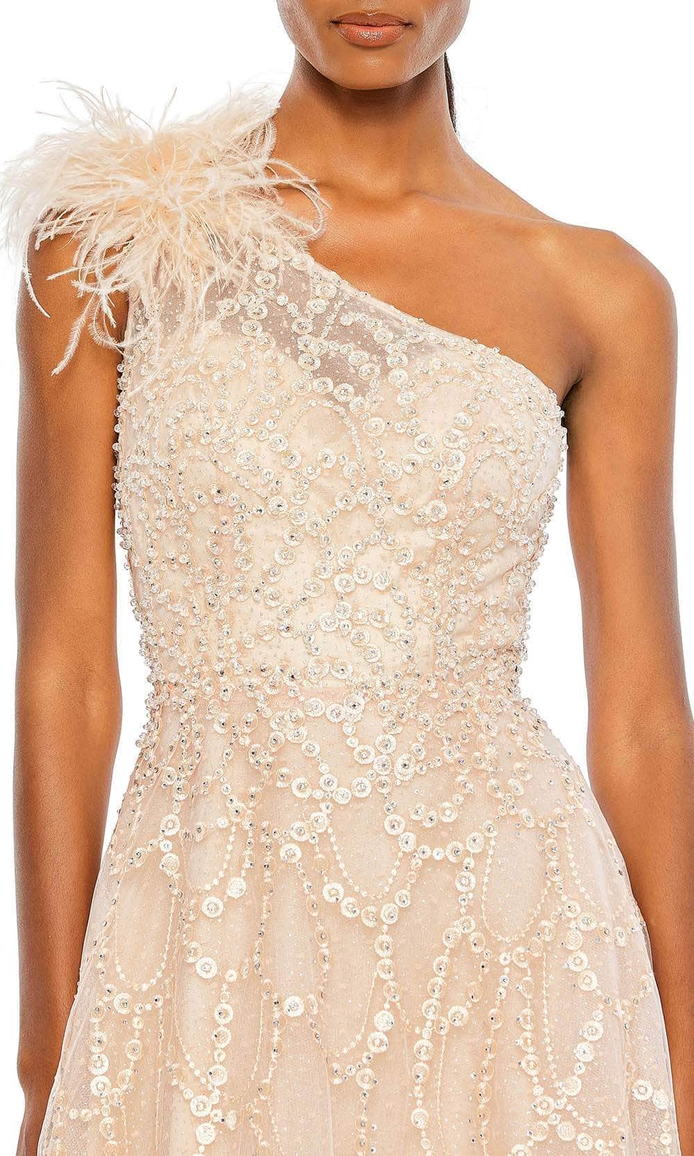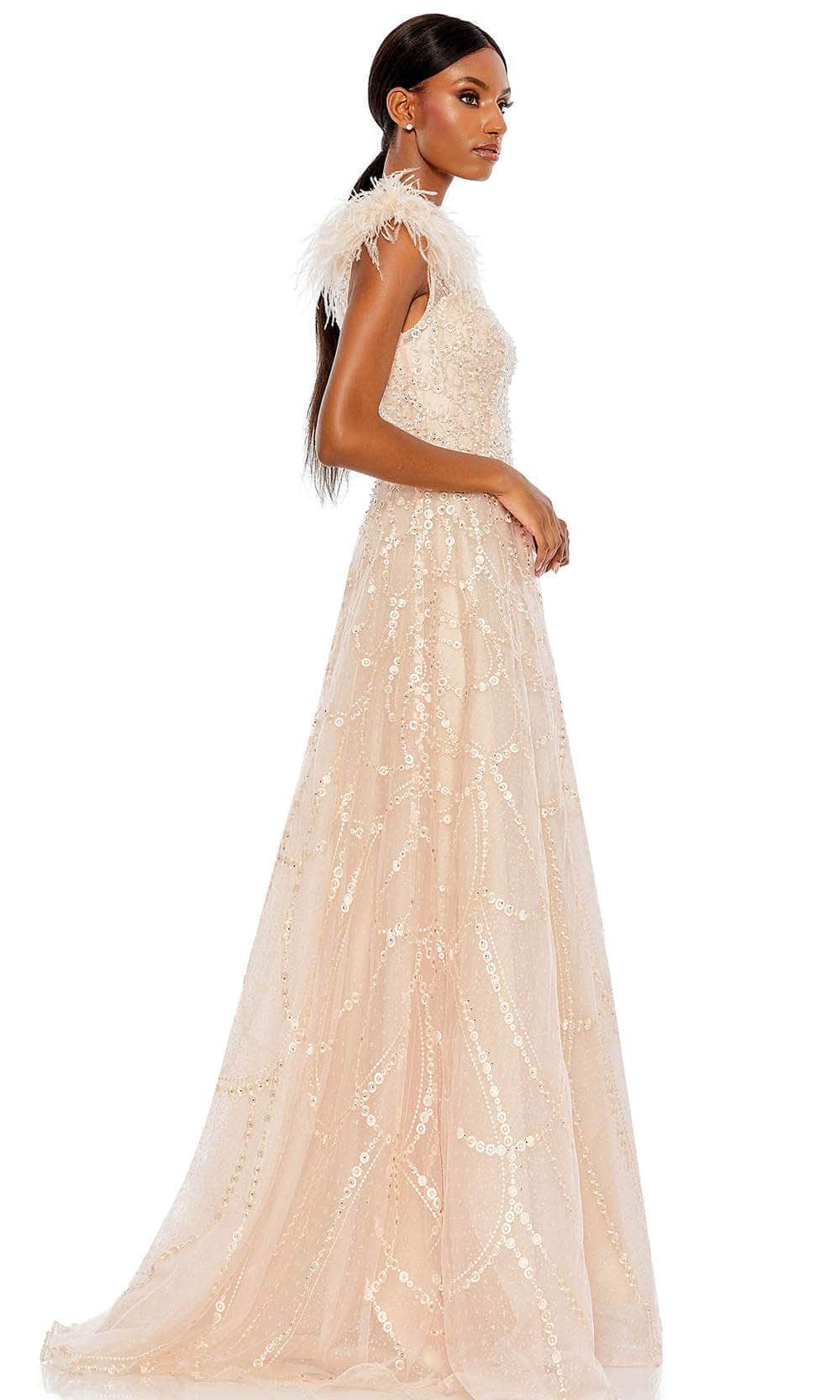Enter the party and do that walk of a regal beauty in Mac Duggal 20389 creation. Lavishly detailed with beadwork and embroidery all over the silhouette, this style features an illusion bodice with an asymmetrical neckline and a partially open back. The feathered accent on one shoulder cap sleeve gives this outfit a glam and distinctive look. The A-line skirt cascades spectacularly down to the full-length hem and sweeping train. This Mac Duggal 20389 masterpiece will sure to display your natural beauty and grace. Models are wearing the Black, Ivory and Peach colors.