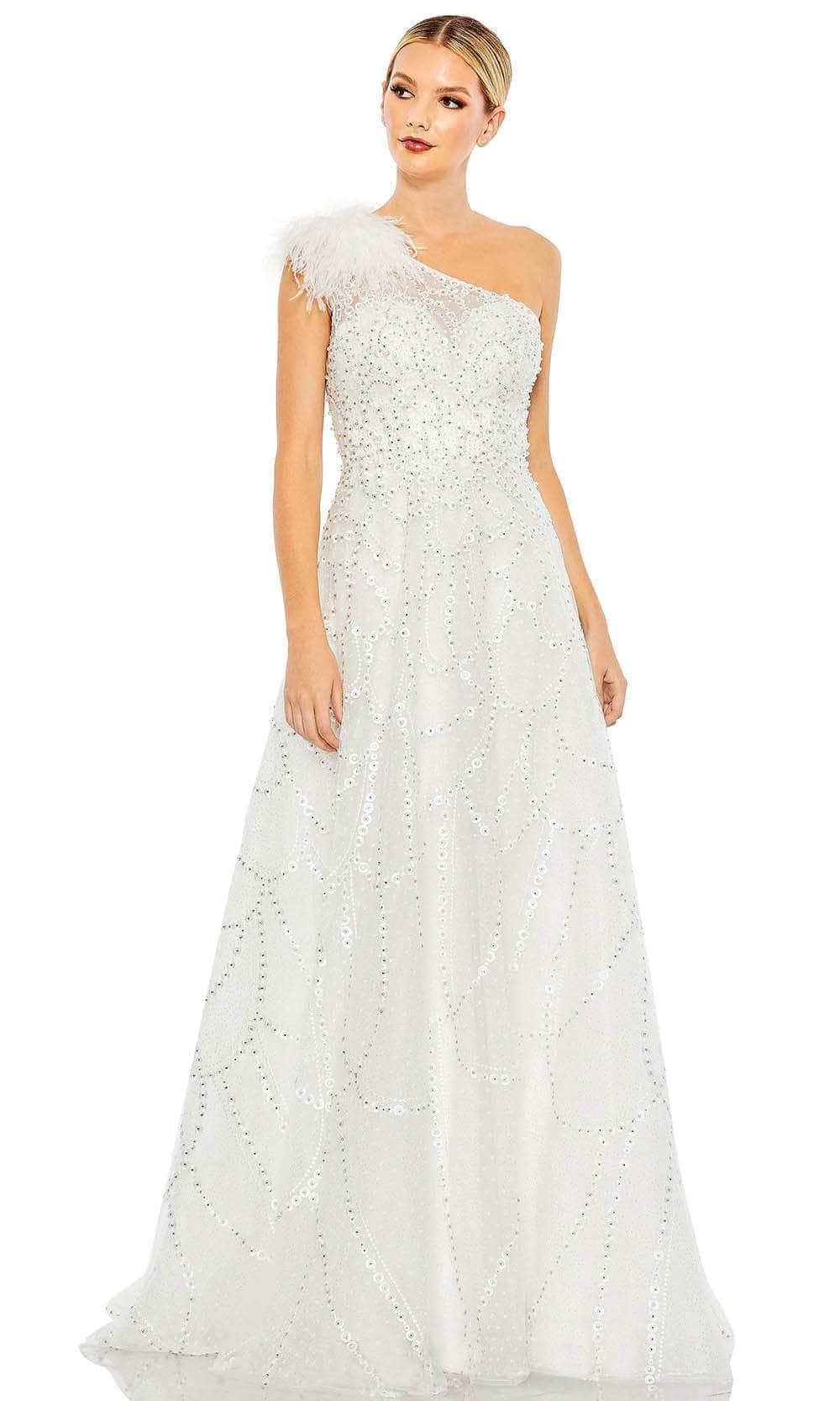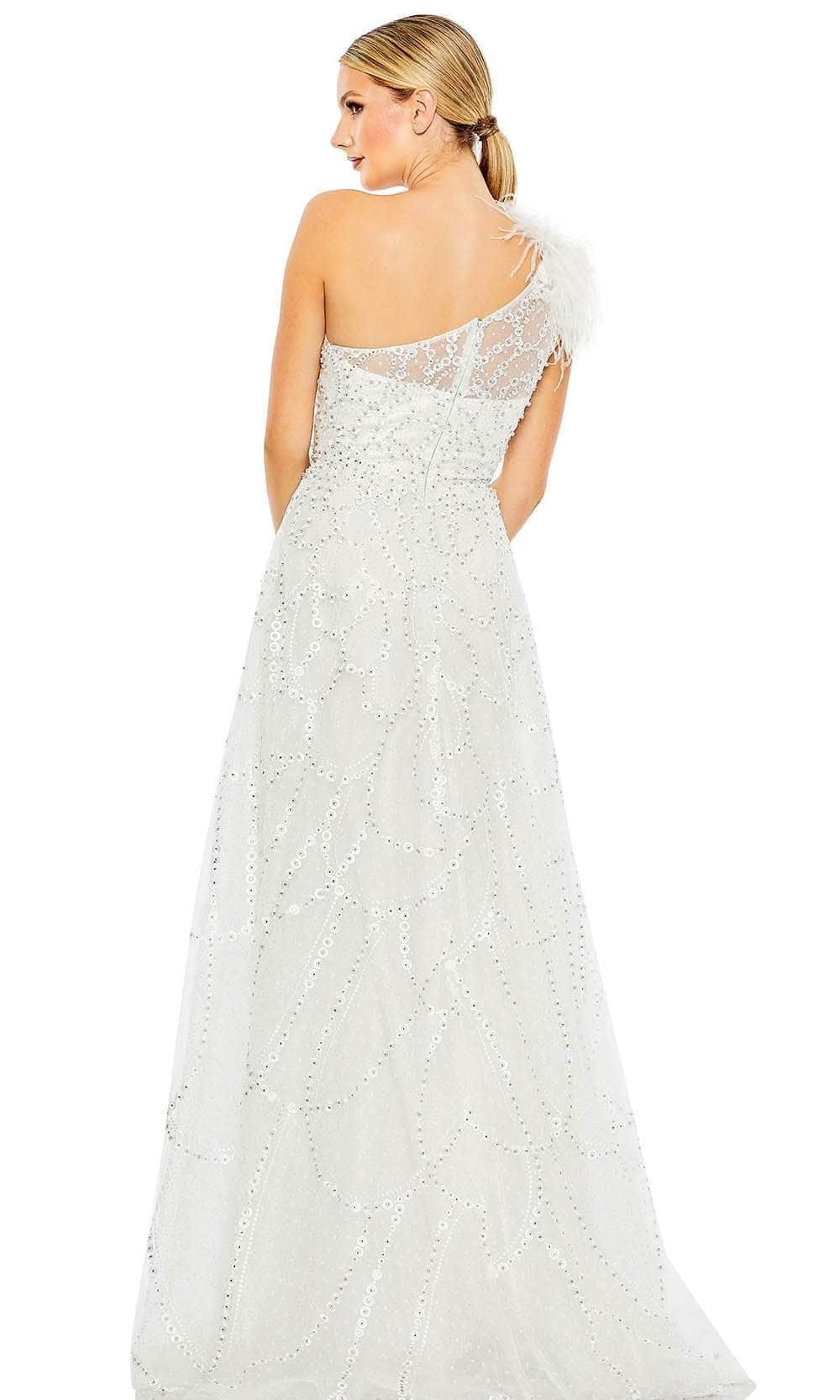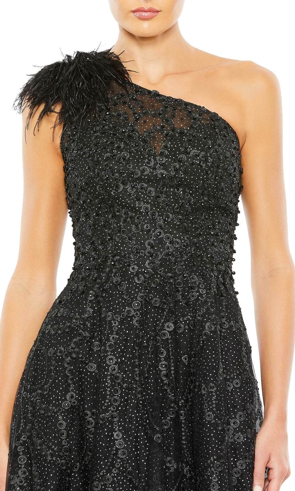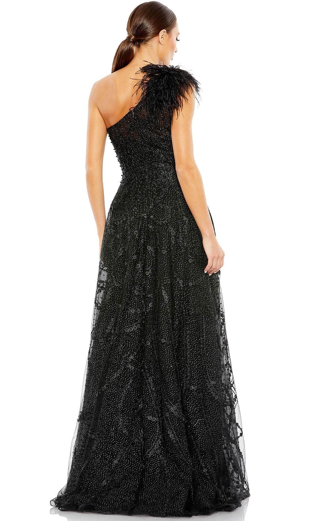 Enter the party and do that walk of a regal beauty in Mac Duggal 20389 creation. Lavishly detailed with beadwork and embroidery all over the silhouette, this style features an illusion bodice with an asymmetrical neckline and a partially open back. The feathered accent on one shoulder cap sleeve gives this outfit a glam and distinctive look. The A-line skirt cascades spectacularly down to the full-length hem and sweeping train. This Mac Duggal 20389 masterpiece will sure to display your natural beauty and grace. Models are wearing the Black, Ivory and Peach colors.