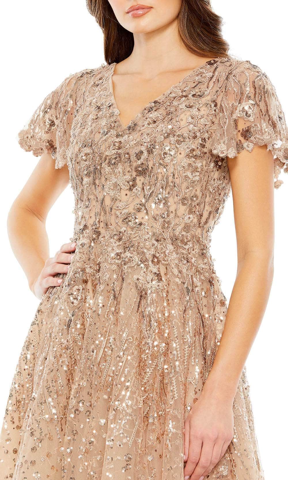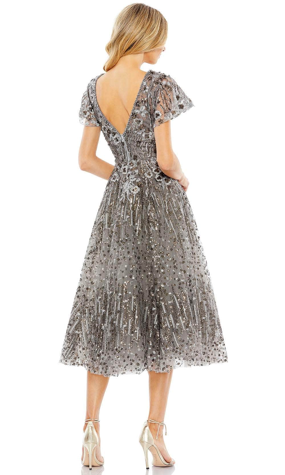 Make a memorable splash at your upscale evening in this lux cocktail dress by Mac Duggal 20392. This charming piece is entirely adorned with floral embroidery and heat-set jewel encrusted embellishments that will make you stand out at any event. It features a matching v-neckline and mid-open v-back with beautiful short butterfly sleeves. The skirt streams to the tea length A-line silhouette. Orchestrate your moment to stand out in this Mac Duggal 20392 masterpiece. Models are wearing the Gunmetal and Taupe colors.