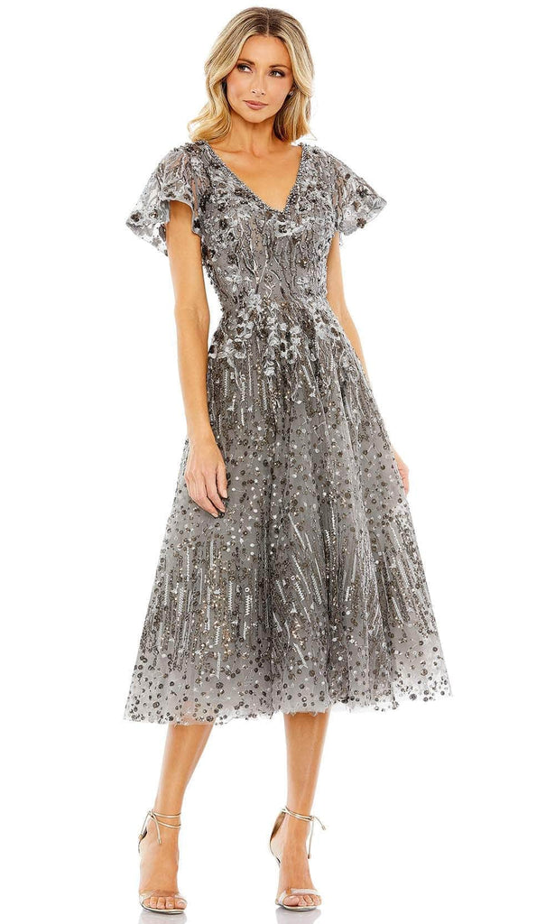Make a memorable splash at your upscale evening in this lux cocktail dress by Mac Duggal 20392. This charming piece is entirely adorned with floral embroidery and heat-set jewel encrusted embellishments that will make you stand out at any event. It features a matching v-neckline and mid-open v-back with beautiful short butterfly sleeves. The skirt streams to the tea length A-line silhouette. Orchestrate your moment to stand out in this Mac Duggal 20392 masterpiece. Models are wearing the Gunmetal and Taupe colors.