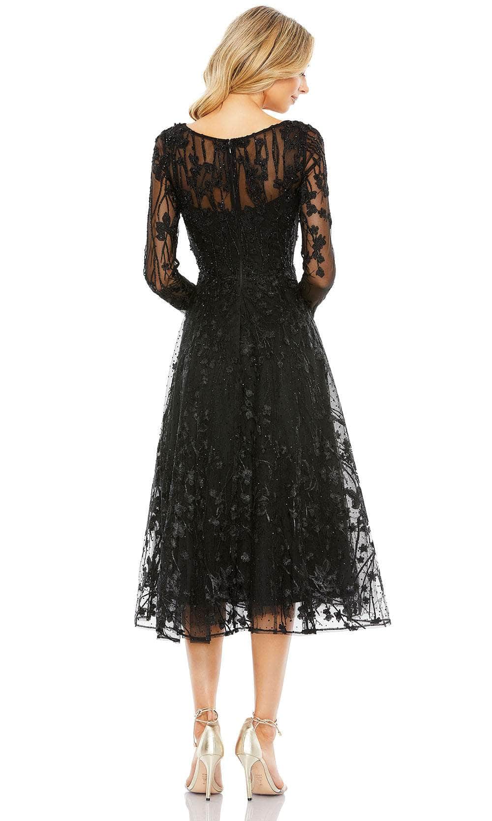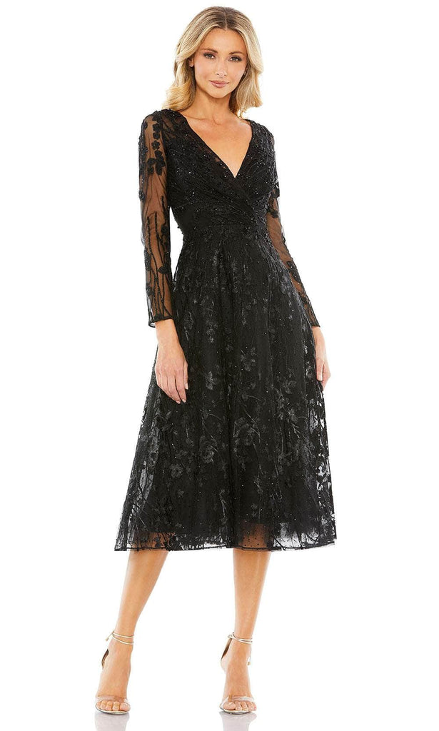 Enhance your evening attire with this Mac Duggal 204041 creation. The all-over floral embroidery and beadings decorate the dress, giving it an elegant and feminine touch. It displays a ruched faux wrap bodice that flatters your figure, and a v-neckline. The sheer long sleeves and partial illusion back add an element of sophistication. As it glides to the tea-length hemline, the skirt molds an A-line silhouette that perfectly contours every women curves. Everyone will be noticing you in this Mac Duggal 204041 dress. Model is wearing Black color.