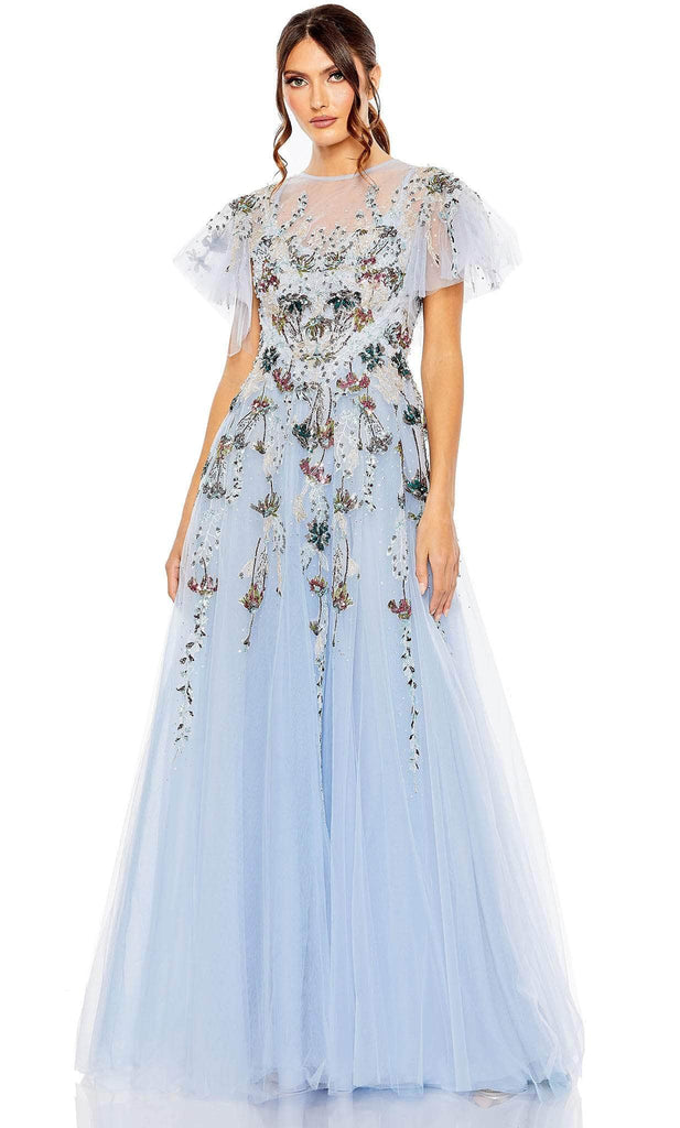 Make a stunning statement in this Prom dress by Mac Duggal 20436. With this gorgeous tulle Prom gown, you will be the picture of elegance and beauty. The completely lined body offers a comfortable fit, while the high neck and short flutter sleeves add an air of grandeur. The floral-patterned bodice spills over to the skirt, producing a stunning flow of design. The concealed back zipper completes the look, while the a-line silhouette and short train provide a graceful flow. Elevate your wardrobe with this chic and luxurious Mac Duggal 20436 dress. Model is wearing the Periwinkle color.