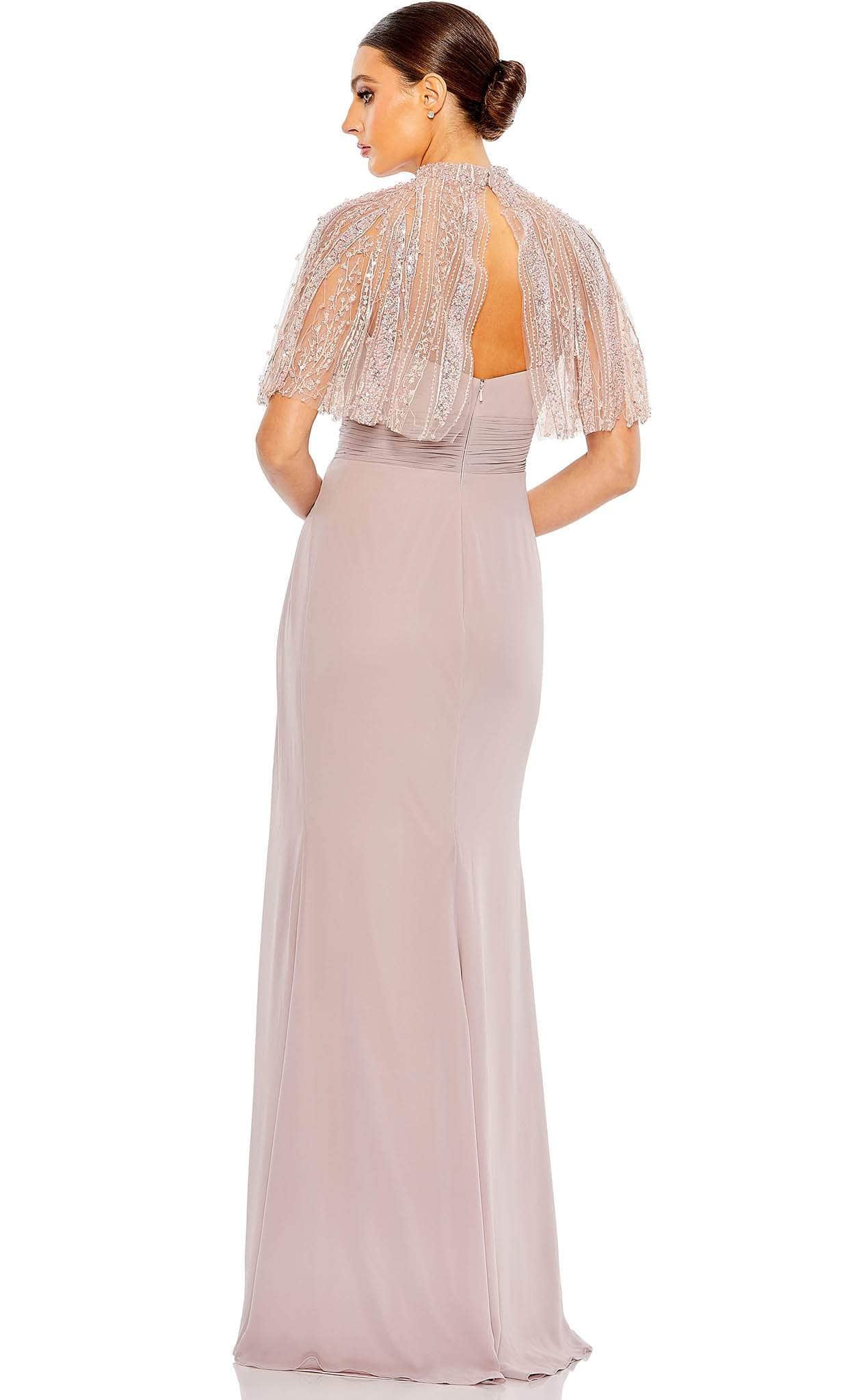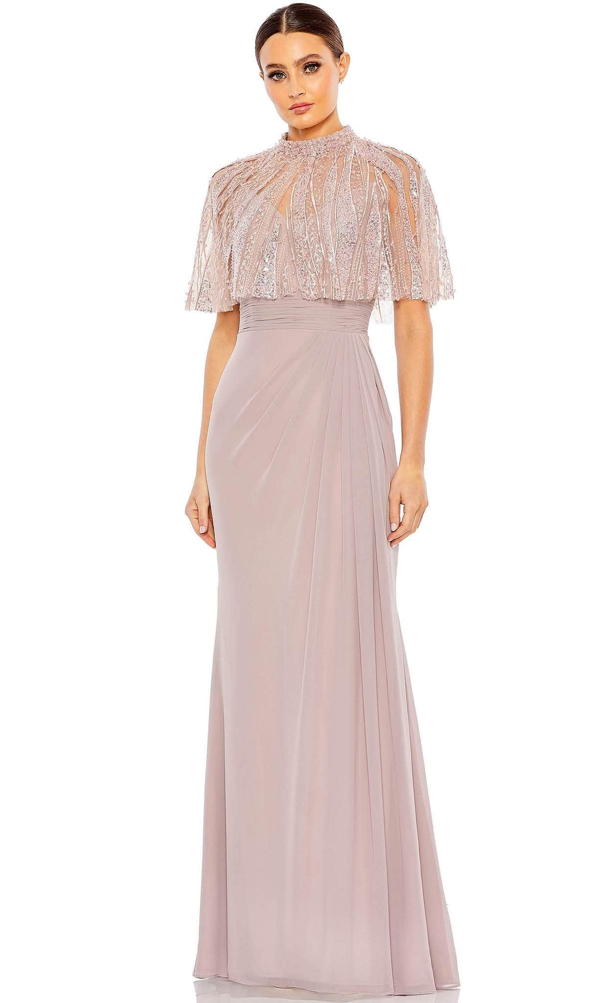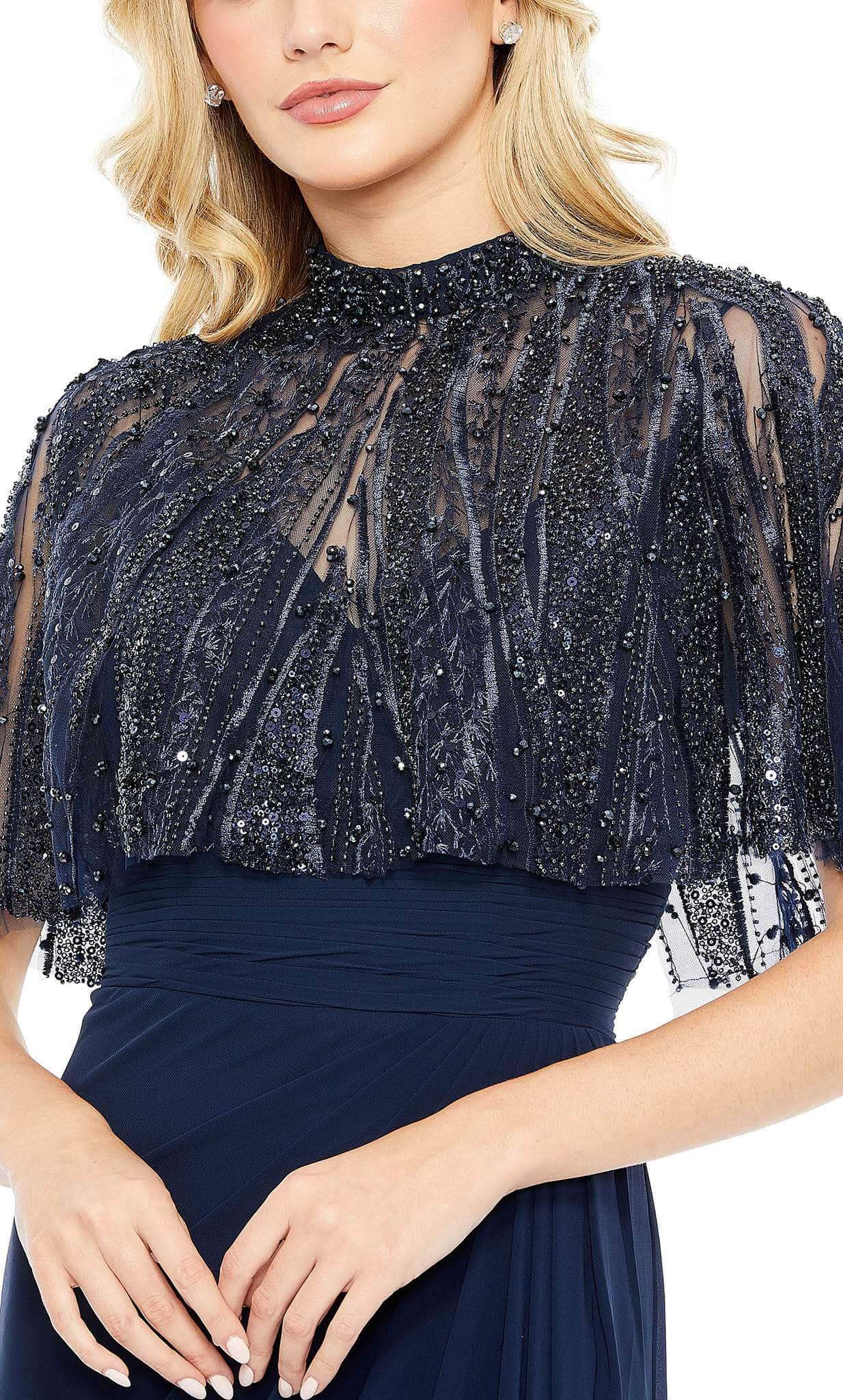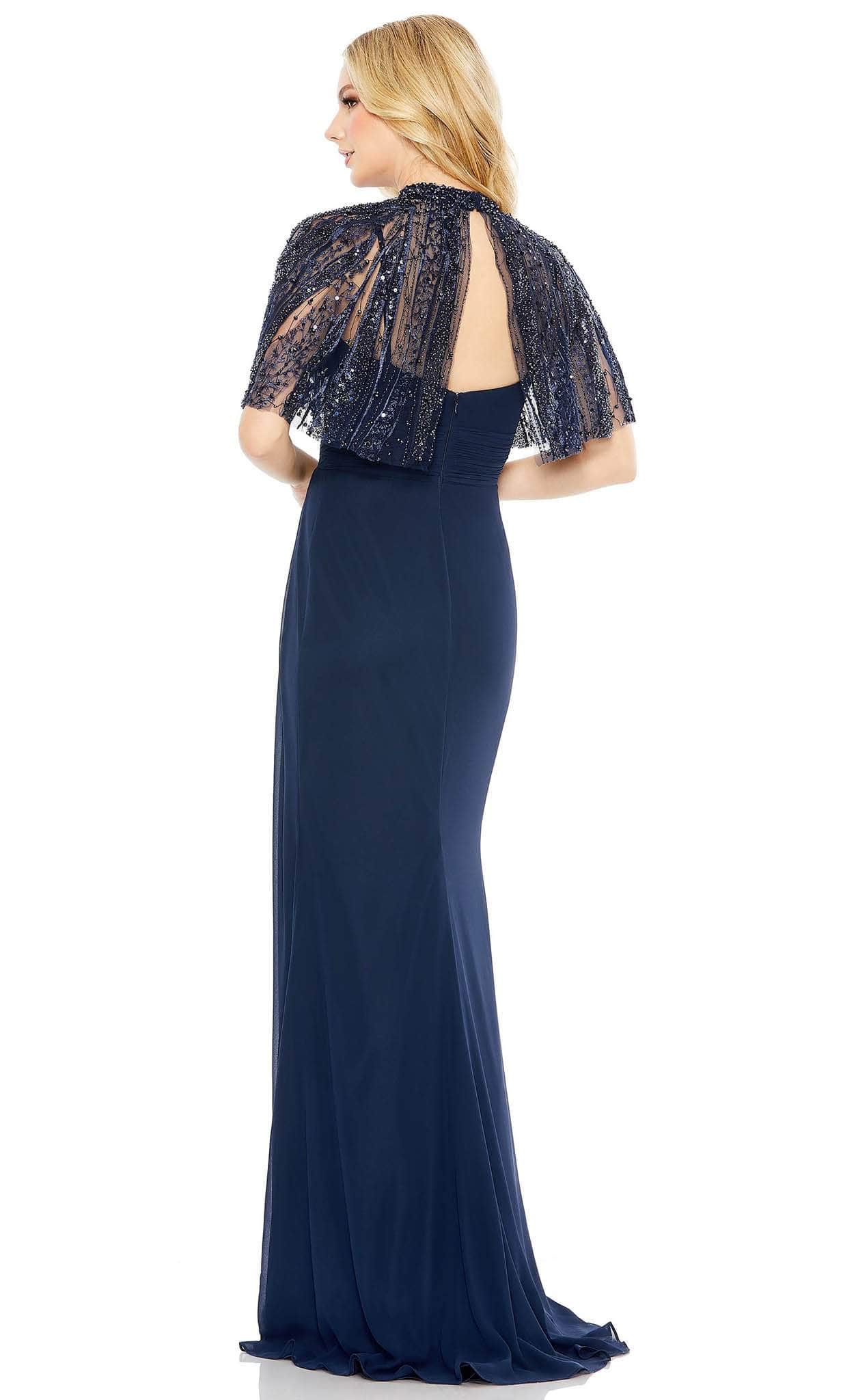 Make a flawless, alluring impression with this creation from Mac Duggal 20467. The beautiful embellishments in the cape of this sleeveless dress bring an elegant effect. The sleeveless bodice with ruched detail emphasizes the empire waistline. A back zipper closure fastens this ensemble and the full-length skirt parades in a column silhouette. Inspire and encourage the attending crowd to look breathtakingly perfect like you in this Mac Duggal 20467 masterpiece. Models are wearing Rose and Navy colors.