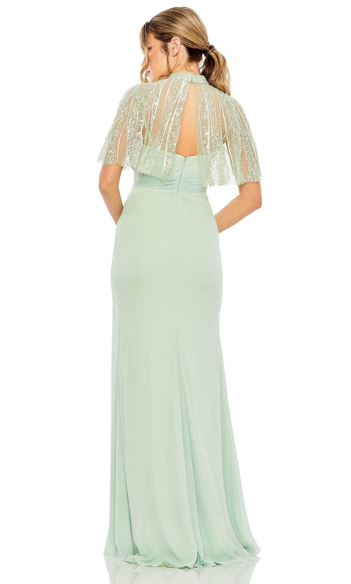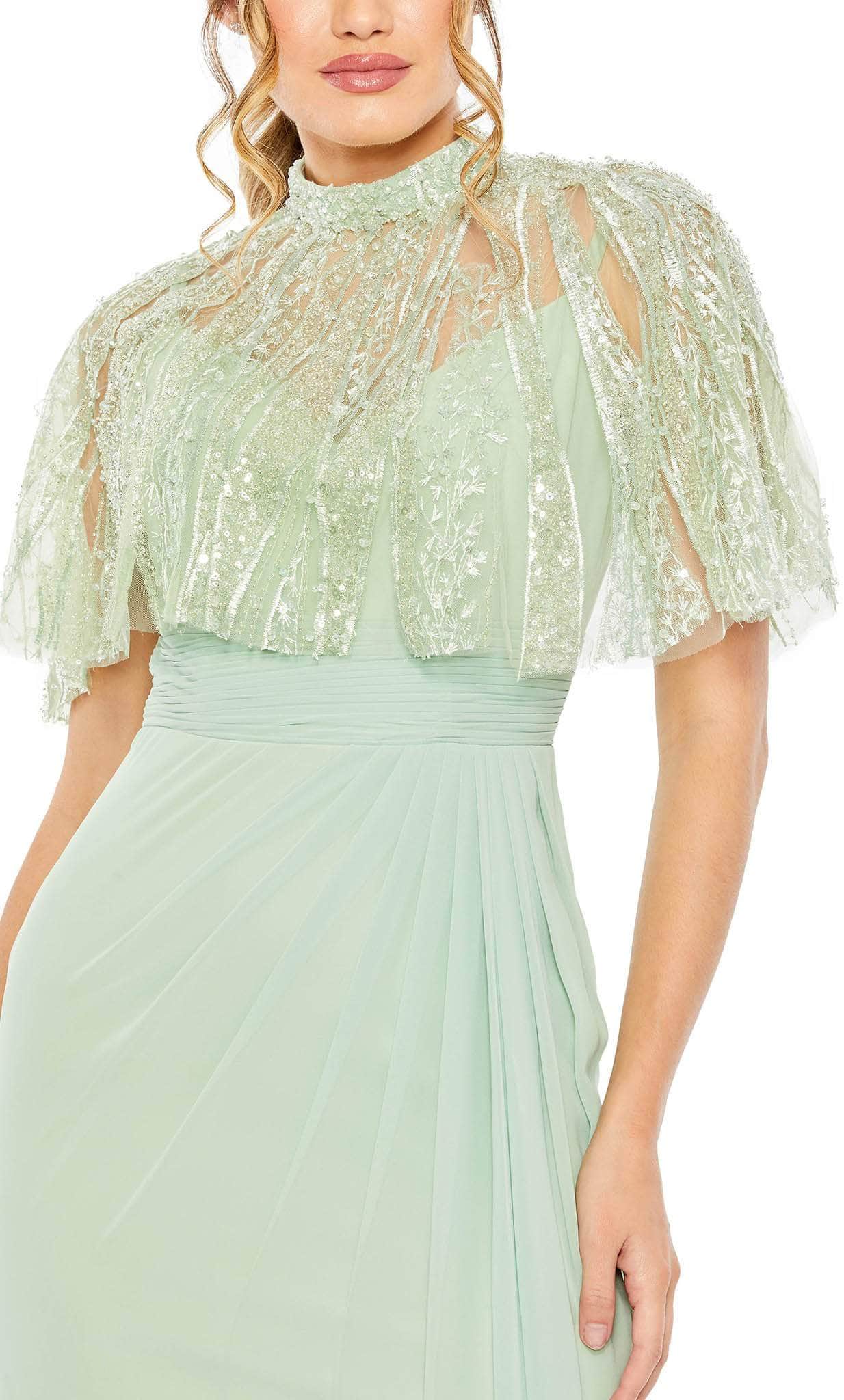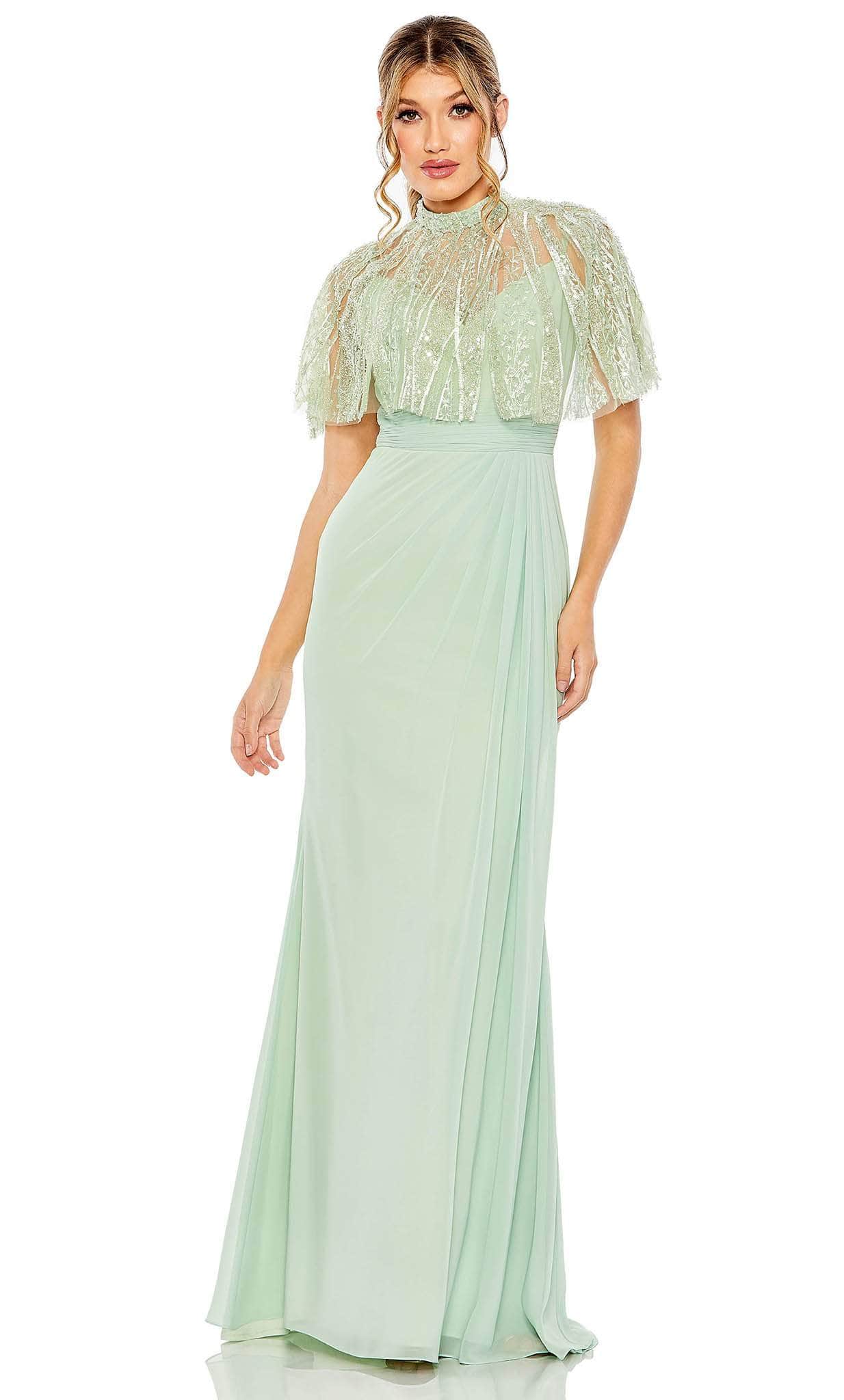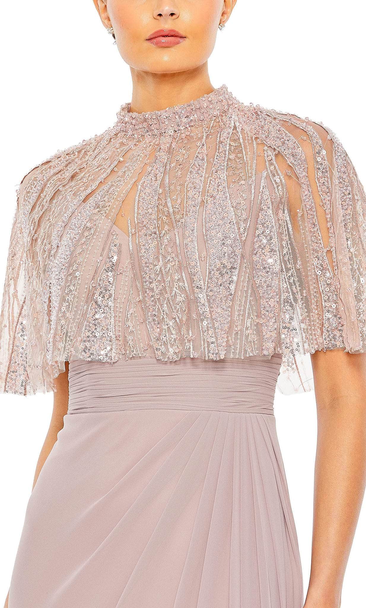 Make a flawless, alluring impression with this creation from Mac Duggal 20467. The beautiful embellishments in the cape of this sleeveless dress bring an elegant effect. The sleeveless bodice with ruched detail emphasizes the empire waistline. A back zipper closure fastens this ensemble and the full-length skirt parades in a column silhouette. Inspire and encourage the attending crowd to look breathtakingly perfect like you in this Mac Duggal 20467 masterpiece. Models are wearing Rose and Navy colors.