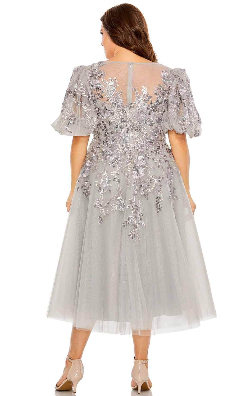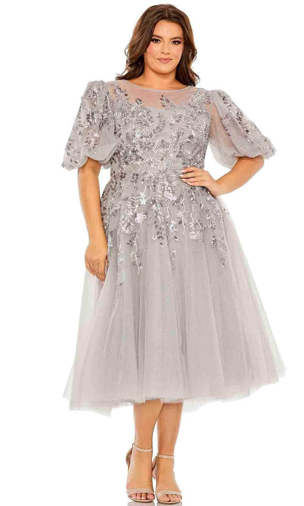 Indulge in the enchantment of Mac Duggal 20475, a dress that sparkles with every step you take. Crafted from a glittering embellished fabric, this piece radiates with celestial charm. The scoop neckline frames your décolletage with elegance, while puff short sleeves add a touch of whimsy. The full-back exudes classic sophistication, allowing the dress to shine from every angle. With a concealed back zipper, this fabulous gown ensures a seamless fit. The knee-length skirt parades in an A-line silhouette, swaying gracefully as you move. Embrace the magic and be the center of attention in this unforgettable Mac Duggal 20475 masterpiece. Model is wearing Charcoal color.