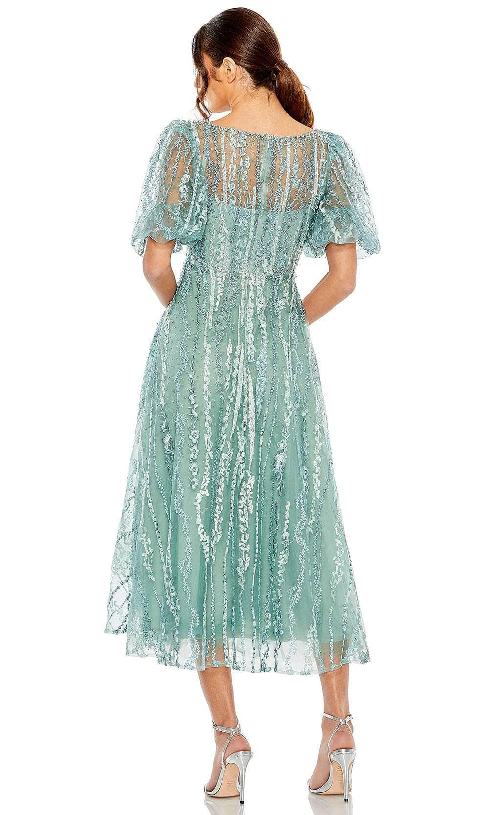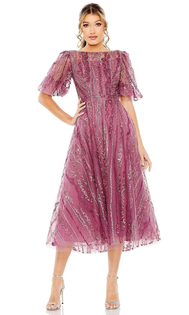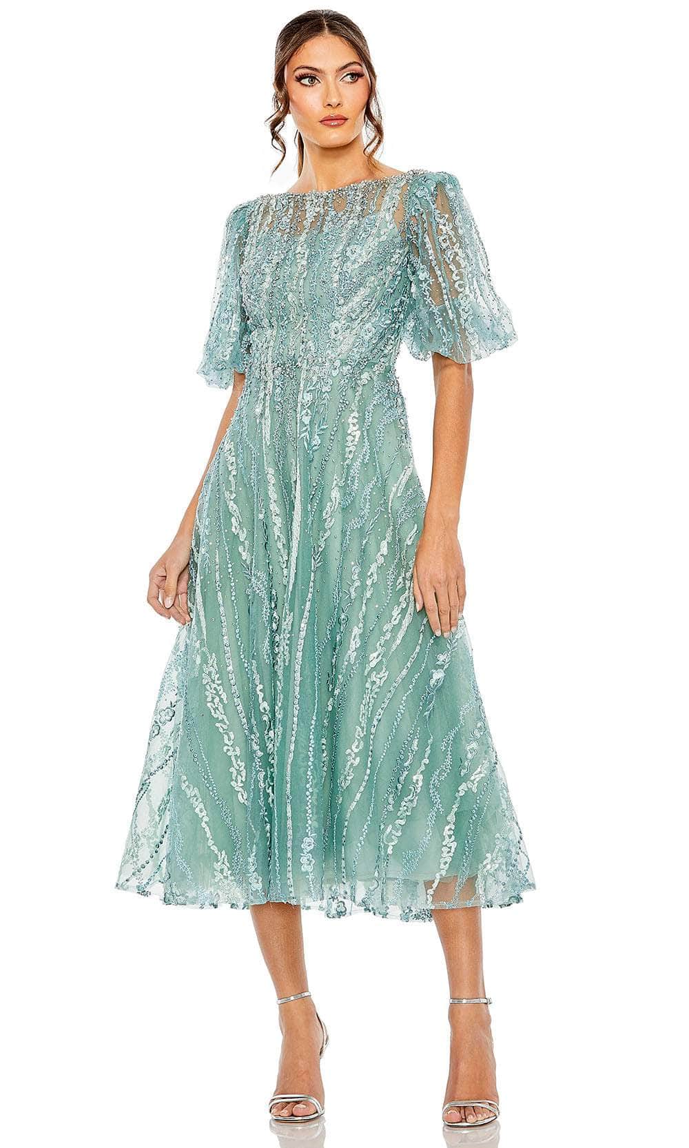 Get set to steal the spotlight in the sophisticated Mac Duggal 20485 formal dress. This exquisite piece showcases a delightful bateau neckline adorned with beautiful bead embellishments. It features charming illusion puff sleeves for added grace and support. The dress boasts a full back secured elegantly by a zipper closure, while the skirt elegantly falls into a classy A-line silhouette, cascading down to a tea-length. Elevate your presence and be the center of attention at your next occasion with this stunning Mac Duggal 20485 attire. Models are wearing Berry, and Seafoam colors.