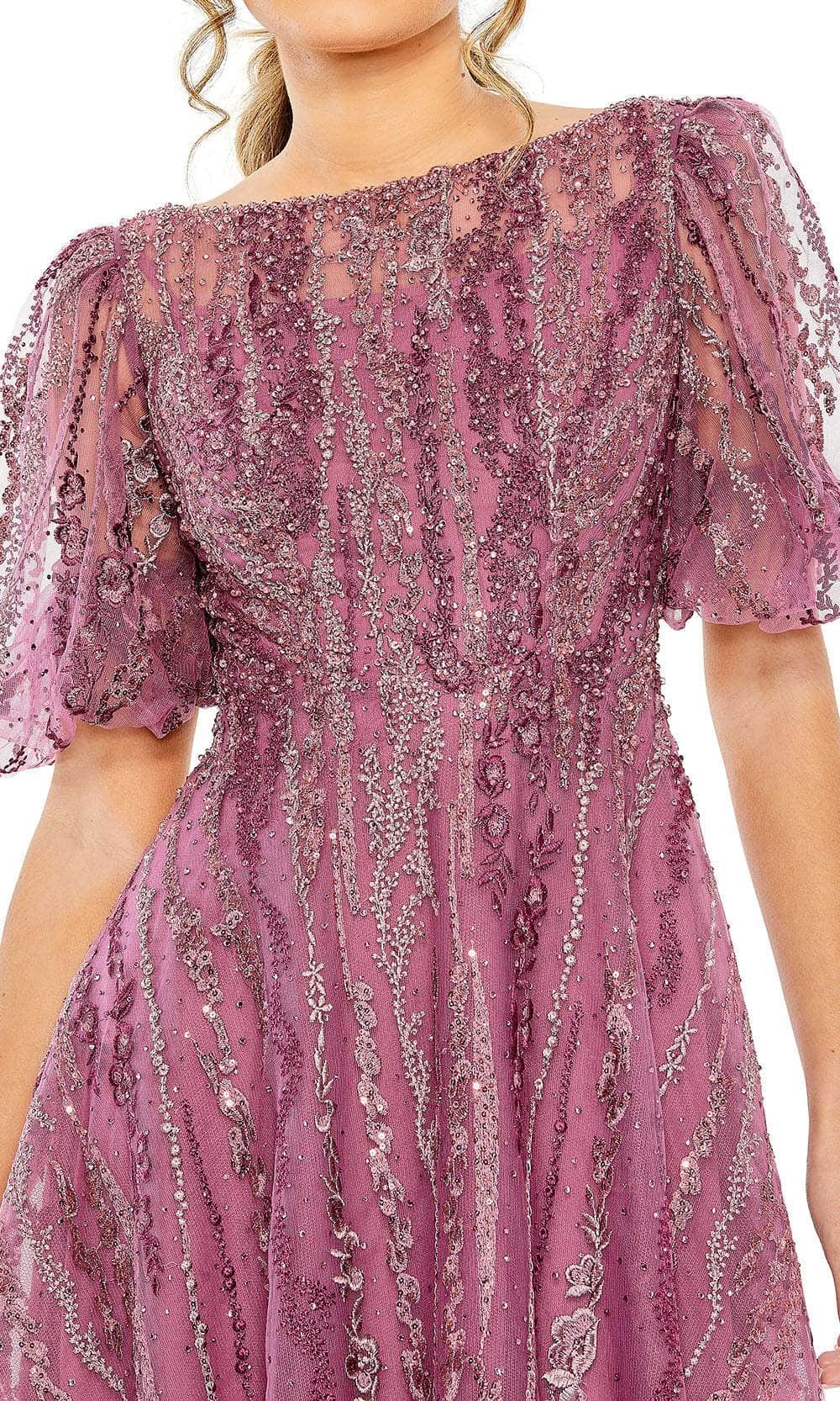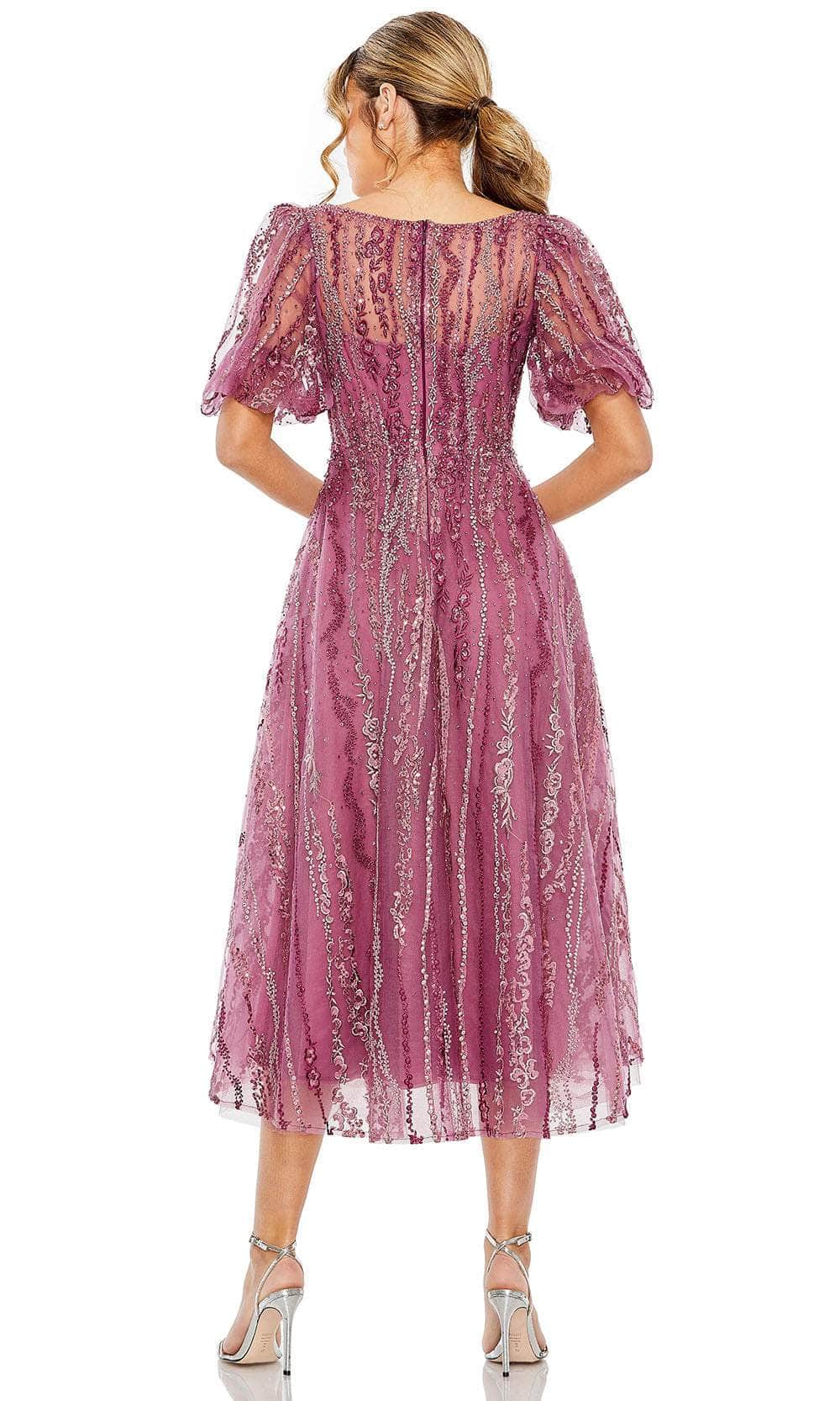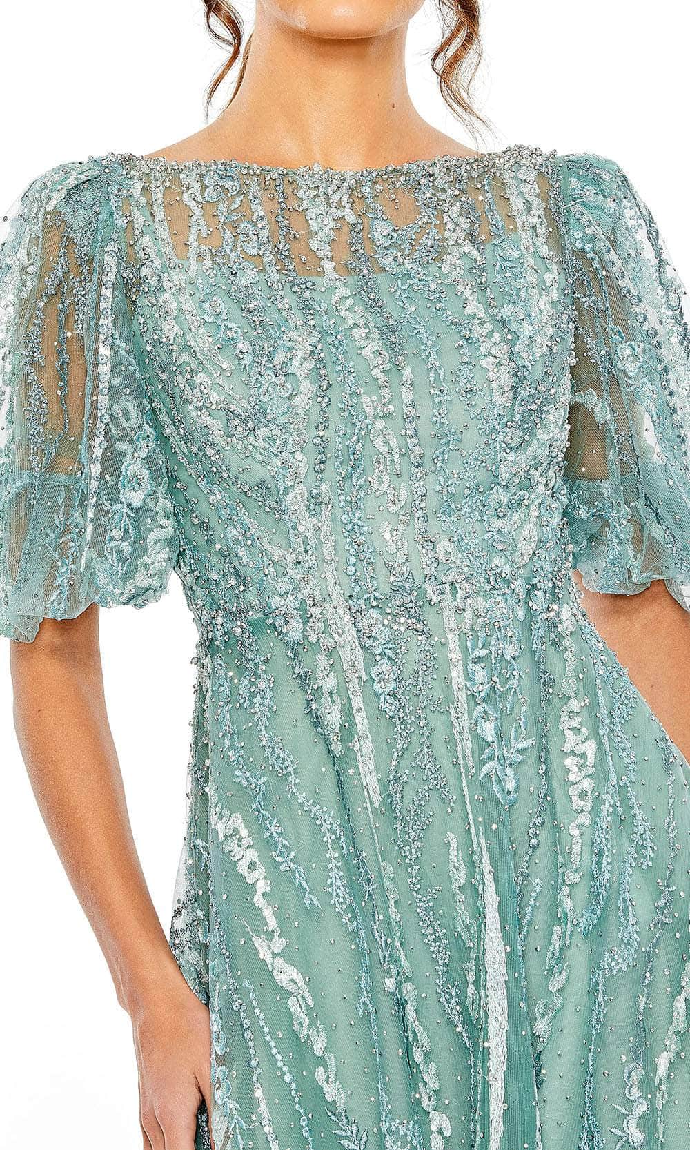 Get set to steal the spotlight in the sophisticated Mac Duggal 20485 formal dress. This exquisite piece showcases a delightful bateau neckline adorned with beautiful bead embellishments. It features charming illusion puff sleeves for added grace and support. The dress boasts a full back secured elegantly by a zipper closure, while the skirt elegantly falls into a classy A-line silhouette, cascading down to a tea-length. Elevate your presence and be the center of attention at your next occasion with this stunning Mac Duggal 20485 attire. Models are wearing Berry, and Seafoam colors.