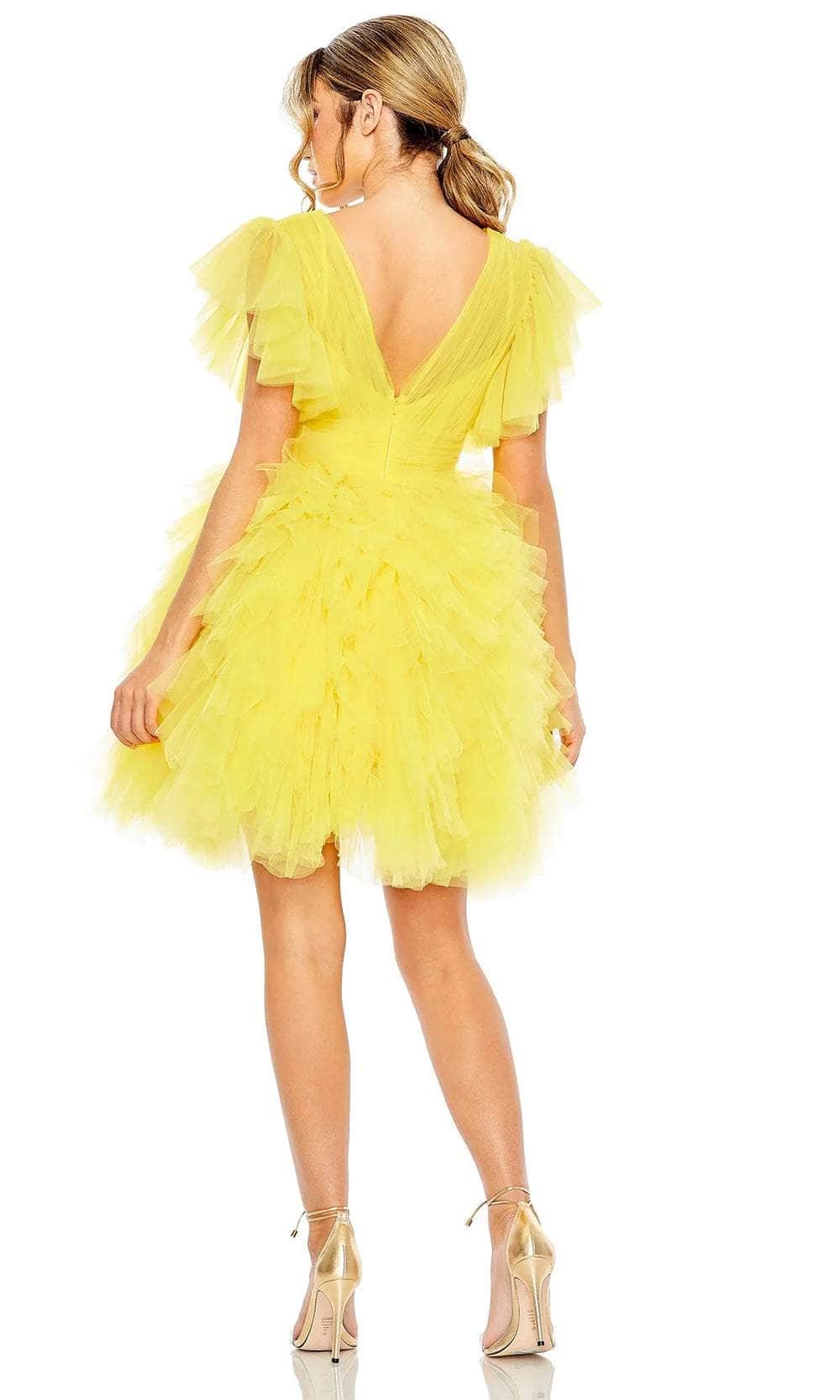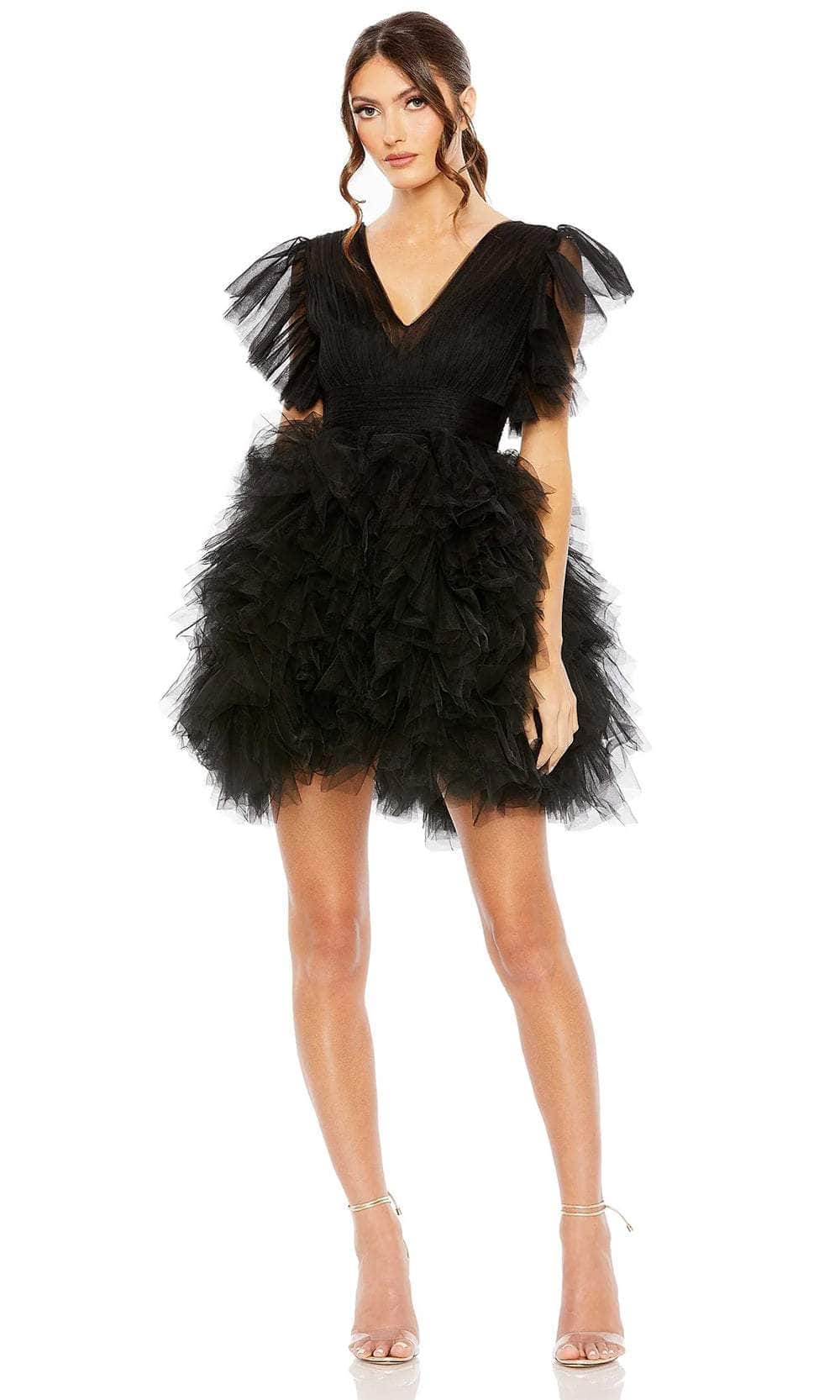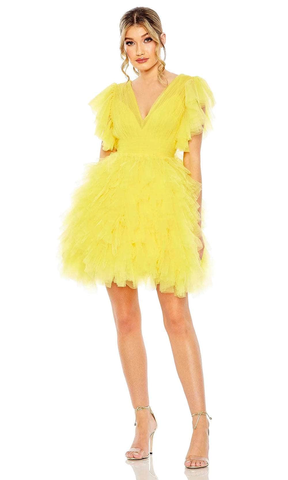 Embrace a captivating mix of romance and allure in the Mac Duggal 205051 masterpiece. This short dress transforms you into a vision of ethereal enchantment. The sheer ruche overlay cascades over a lined bodice, creating a mesmerizing textural dimension. The deep V-neckline flatters your décolletage, while the delicate flutter sleeves add a touch of whimsical charm. The nipped waist accentuates your figure, leading to a flowing A-line skirt crafted from tiers of luxurious tulle. The flirty mini hemline ensures a touch of contemporary chic. Step out in timeless elegance with our glamorous Mac Duggal 205051 creation. Models are wearing the Sunshine and Black colors.
