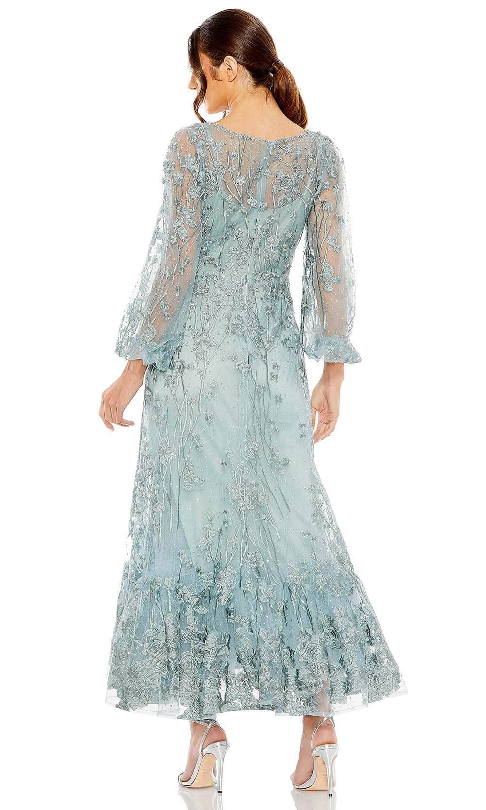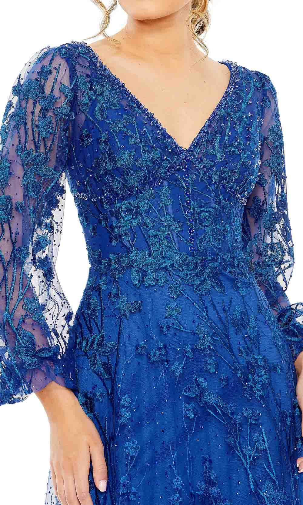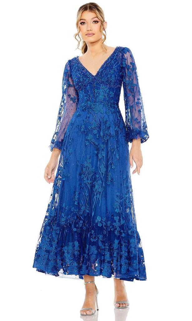 Embrace ethereal beauty brought to you by wearing this Mac Duggal 20512 creation. Captivating designed with a sheer mesh overlay detailed with floral embroidery and beadwork, this enchanting piece is designed with a fully lined bodice and skirt that bestows comfort and coverage. Adding a romantic flair, this bodice also flaunts a v-neckline and sheer bishop sleeves with puff shoulder accents. Showing off an allover floral embroidery detailed with beaded embellishments, the illusion back is complemented by a concealed back zipper. The A-line skirt flowing gracefully to a ruffled tea-length hem. Mesmerize everyone with the stunning beauty of this Mac Duggal 20512 masterpiece. Models are wearing the Royal and Seafoam colors.