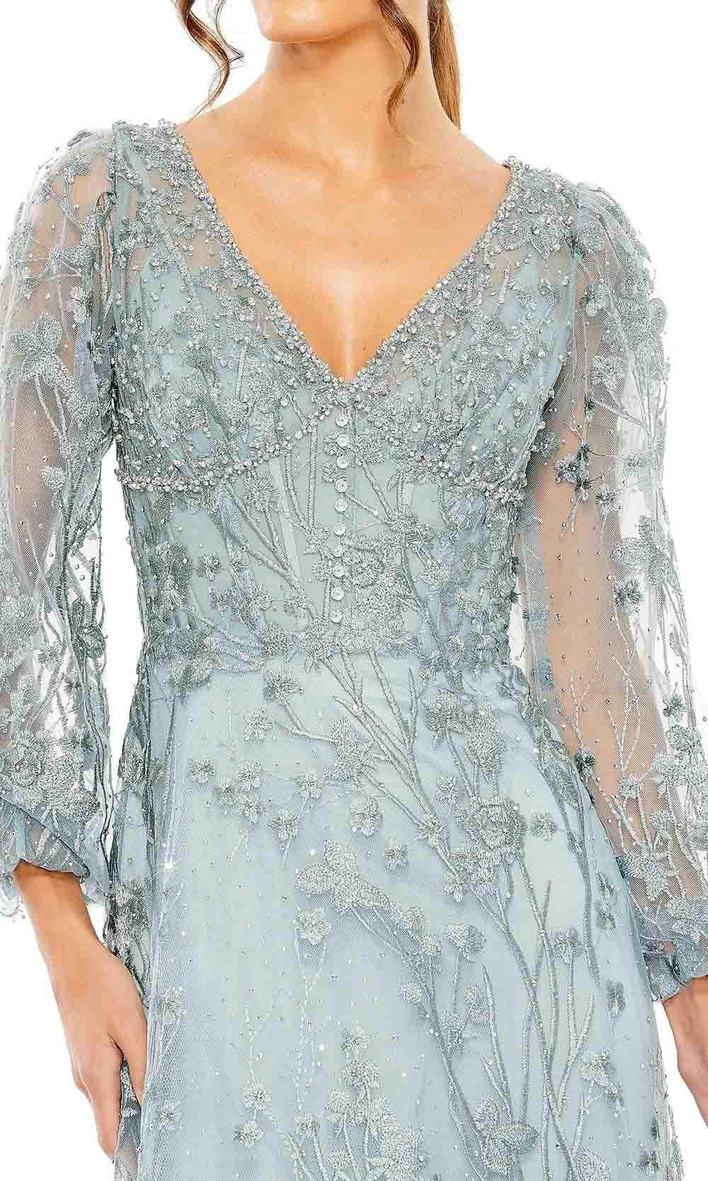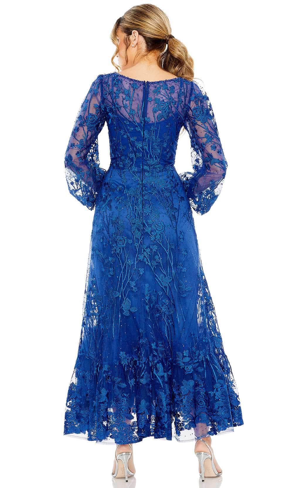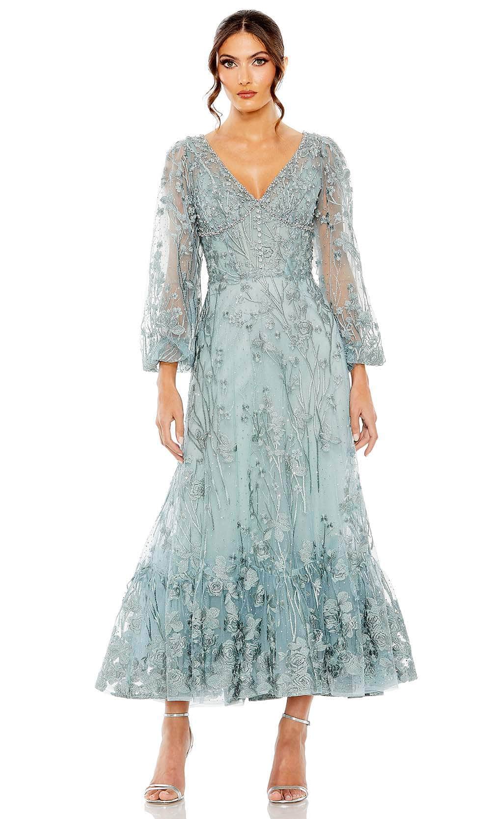 Embrace ethereal beauty brought to you by wearing this Mac Duggal 20512 creation. Captivating designed with a sheer mesh overlay detailed with floral embroidery and beadwork, this enchanting piece is designed with a fully lined bodice and skirt that bestows comfort and coverage. Adding a romantic flair, this bodice also flaunts a v-neckline and sheer bishop sleeves with puff shoulder accents. Showing off an allover floral embroidery detailed with beaded embellishments, the illusion back is complemented by a concealed back zipper. The A-line skirt flowing gracefully to a ruffled tea-length hem. Mesmerize everyone with the stunning beauty of this Mac Duggal 20512 masterpiece. Models are wearing the Royal and Seafoam colors.