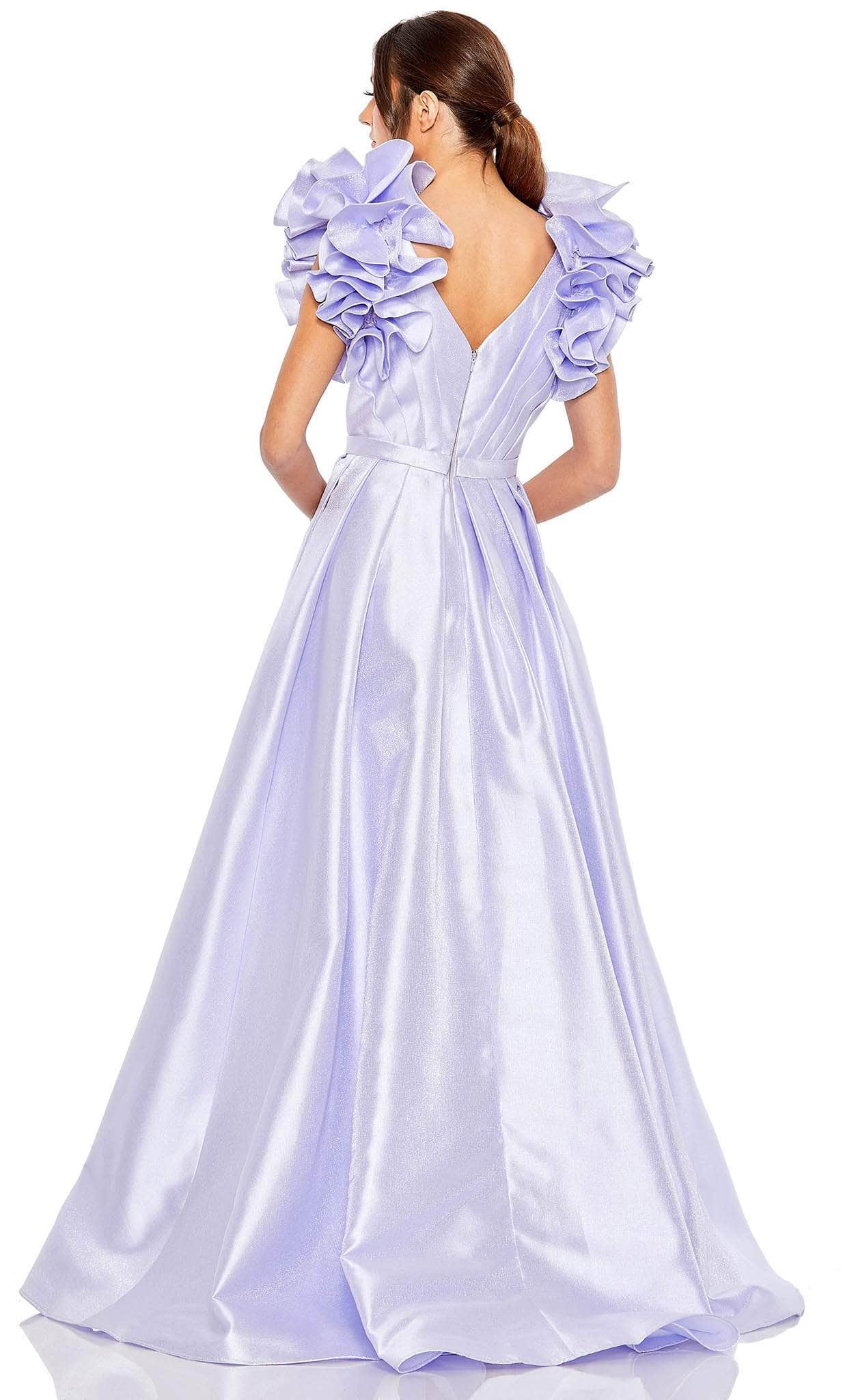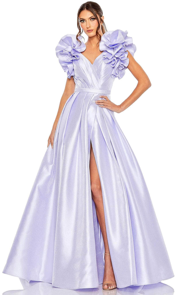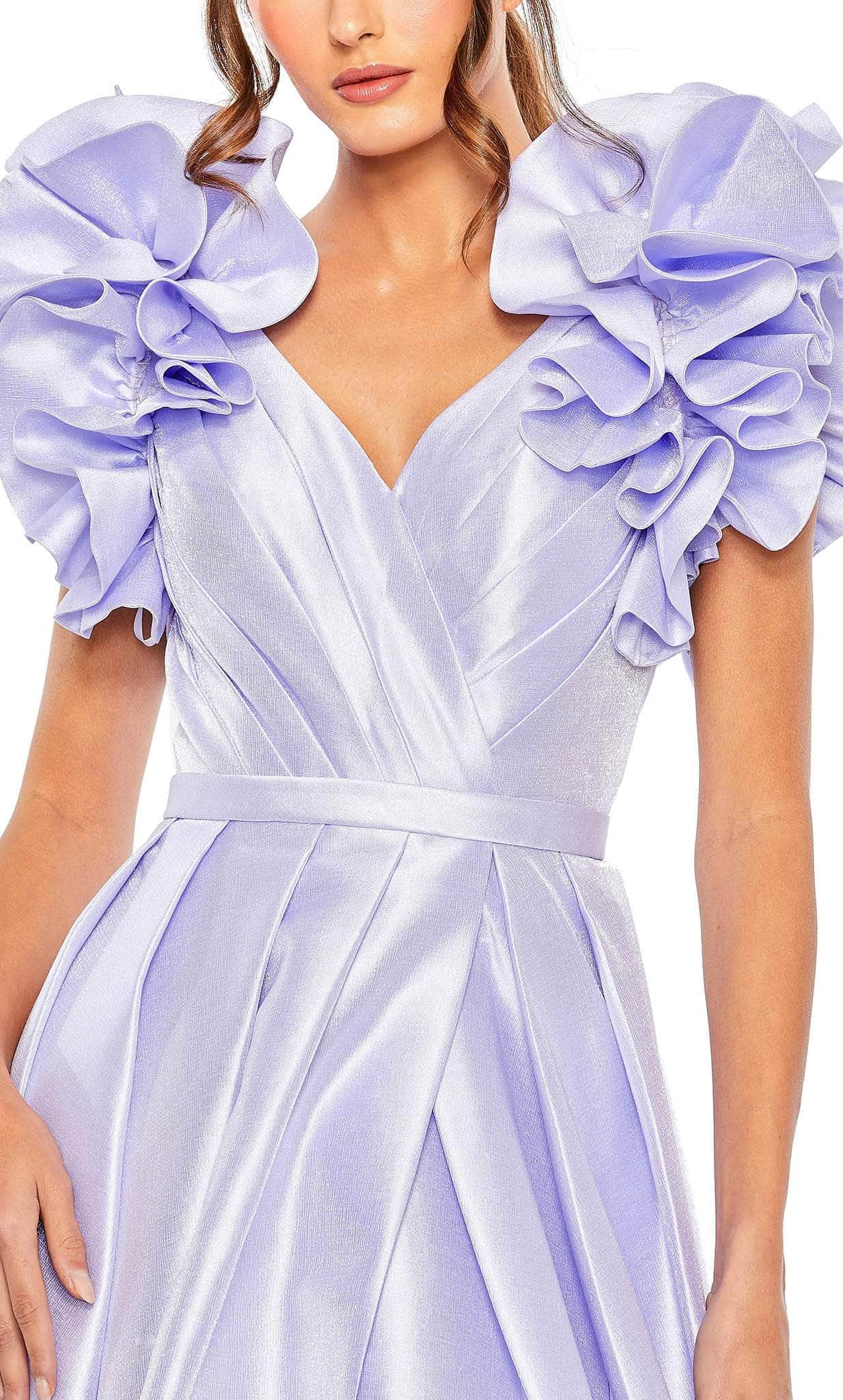 Get glamorous underneath the modern and classic detailing on the A-line silhouette of Mac Duggal 20522. This pleated satin gown enhances the wearer's royal aura. A V-neckline, V-cut back, and flutter sleeves give the dress a charming look. The dress closes with a back zipper. The floor-length skirt's elegant A-line silhouette and daring high slit exude alluring sophistication. Mac Duggal 20522 is perfect for a standout style and flawless fit. Model is wearing Periwinkle color.