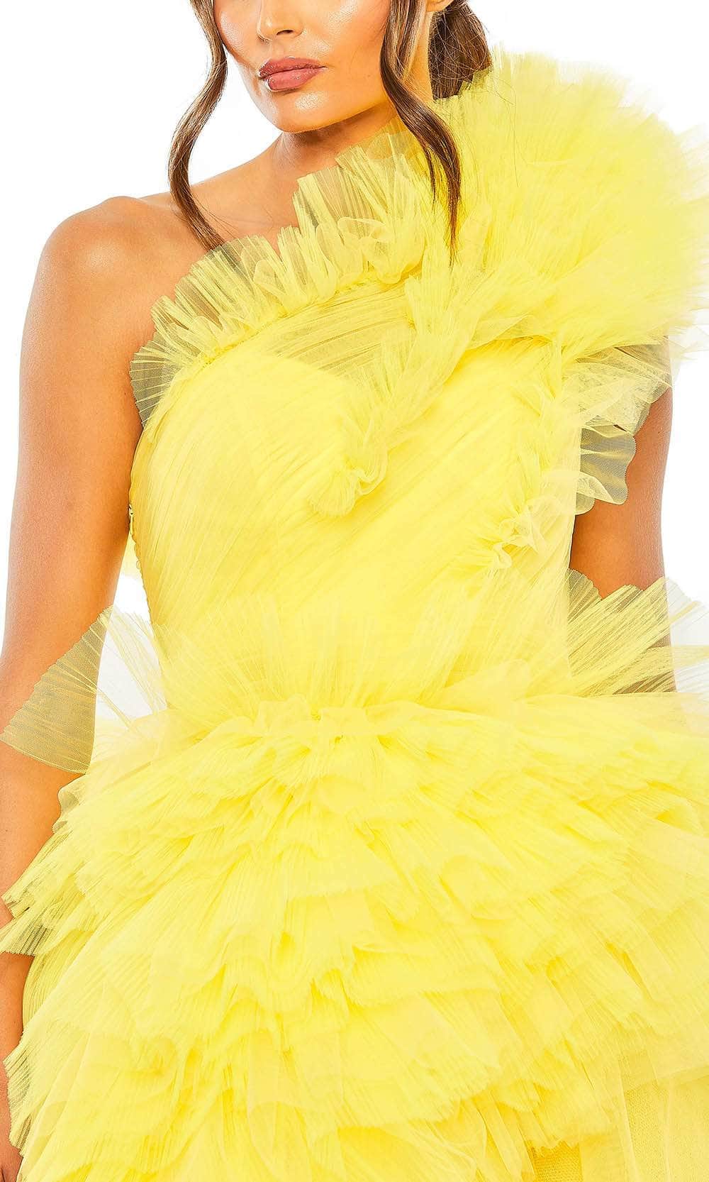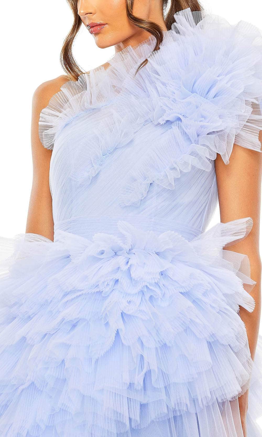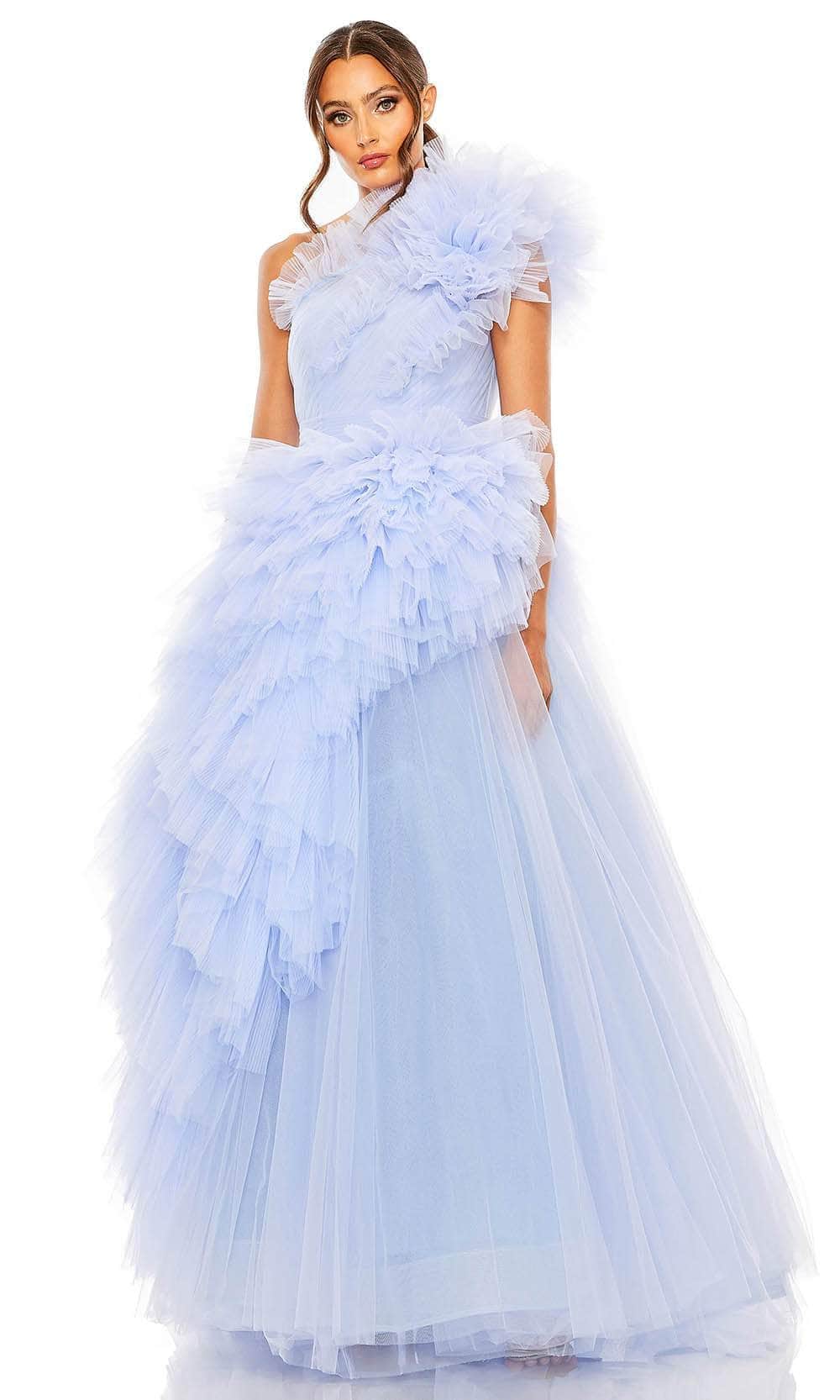 Leave everyone mesmerized with the regal beauty of this ethereally made Mac Duggal 20534 creation. Astoundingly detailed with tailoring lines while showing off a cloud of tulle, this gown parades an asymmetrical neckline with an oversized ruffled tulle on one shoulder. Showing of shirring along the bodice and styled with a partial open back and a zipper closure. The beautifully layered skirt forms a ballgown design as it flows lavishly into a sweeping denouement. Mesmerize the crowd as you make your way into the hearts of many in this Mac Duggal 20534 masterpiece. Models are wearing the Periwinkle and Sunshine colors.
