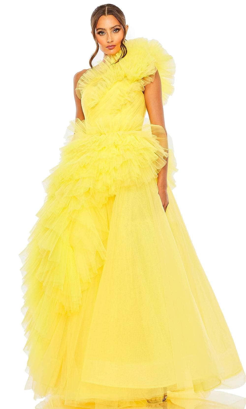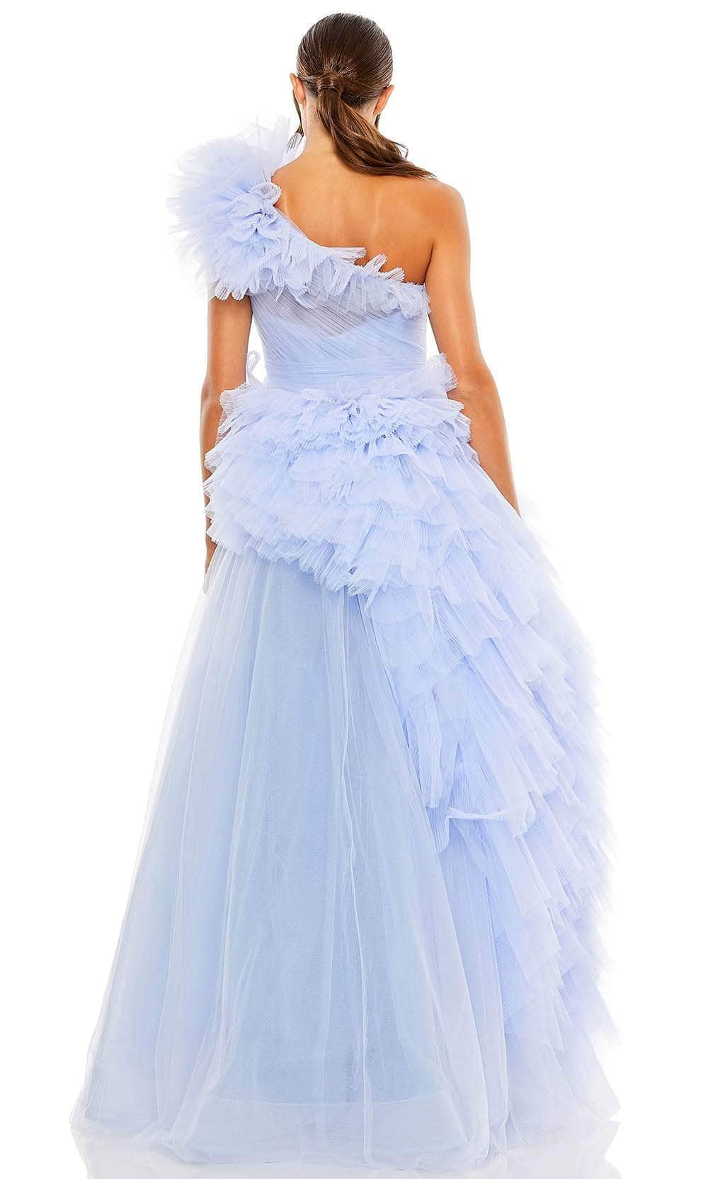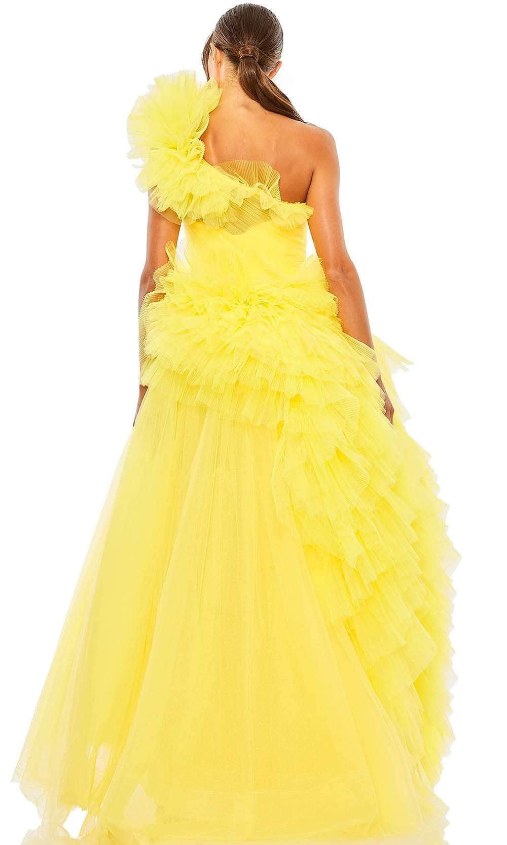 Leave everyone mesmerized with the regal beauty of this ethereally made Mac Duggal 20534 creation. Astoundingly detailed with tailoring lines while showing off a cloud of tulle, this gown parades an asymmetrical neckline with an oversized ruffled tulle on one shoulder. Showing of shirring along the bodice and styled with a partial open back and a zipper closure. The beautifully layered skirt forms a ballgown design as it flows lavishly into a sweeping denouement. Mesmerize the crowd as you make your way into the hearts of many in this Mac Duggal 20534 masterpiece. Models are wearing the Periwinkle and Sunshine colors.