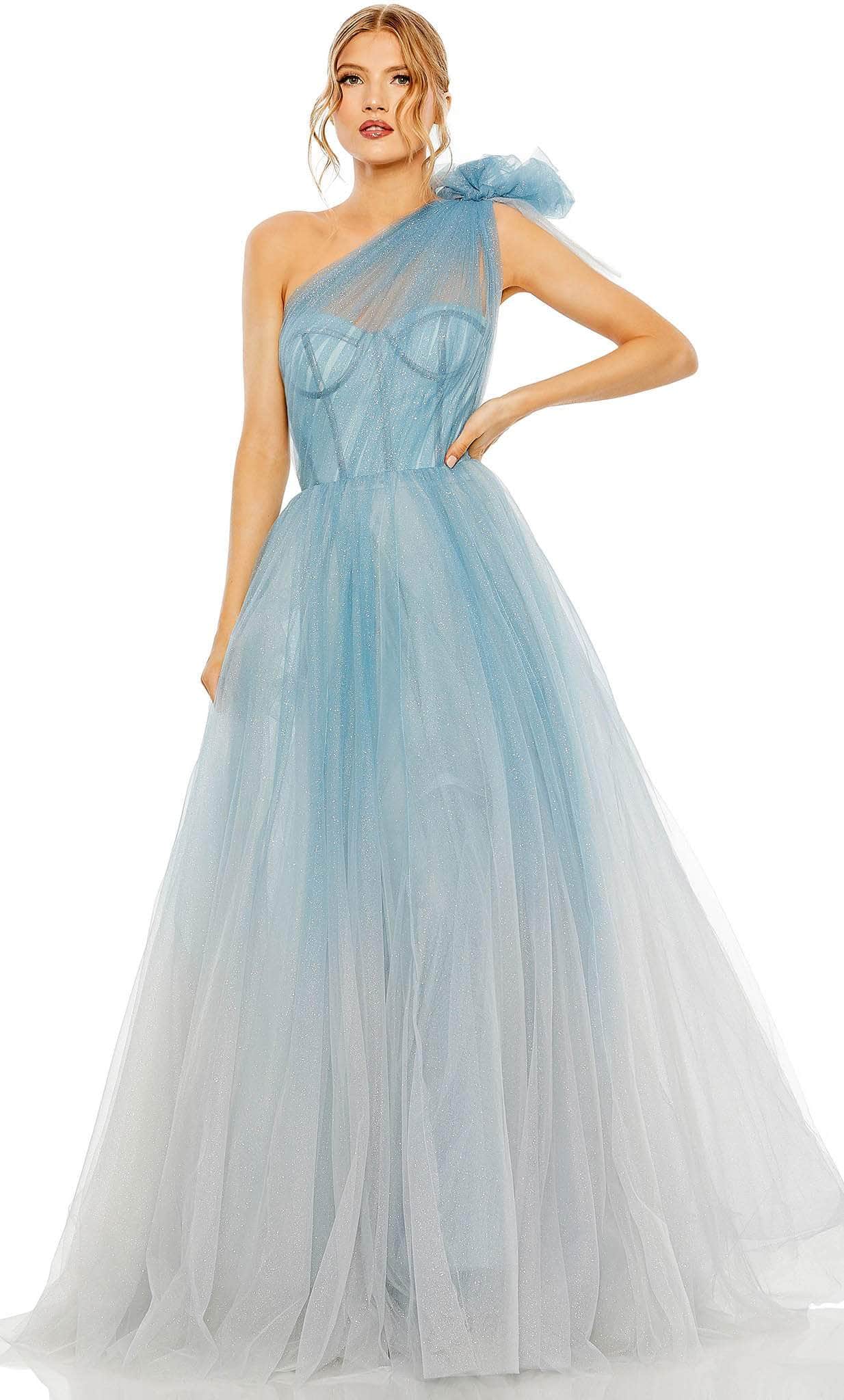 Get ready to turn heads at your next party with our stunning Mac Duggal 20552 dress. This entrancing semi-ballgown dress is a work of art crafted from soft tulle fabric. This beautiful dress is completely lined for your comfort. In addition to the illusion neckline, the one-shoulder neckline and exposed back form a stunning blend of modern and classic design. The bustier corset bodice makes the dress look more glamorous, and the zipper in the back makes sure it fits just right. The ombré skirt has a gorgeous finish that flows into a floor-sweeping complete length. Be the Queen of the Night in this Mac Duggal 20552 masterpiece. Model is wearing the Blue color.