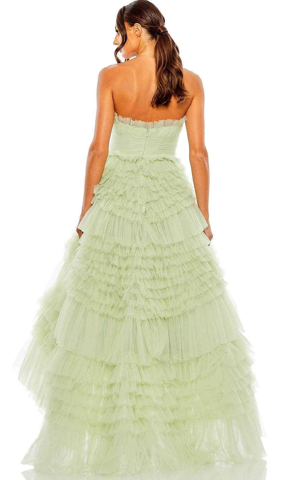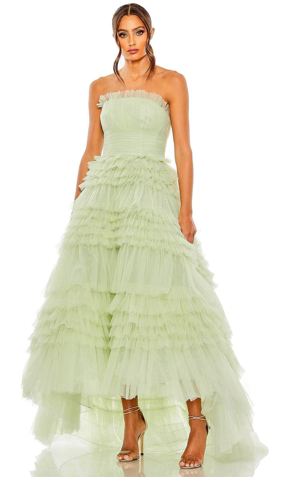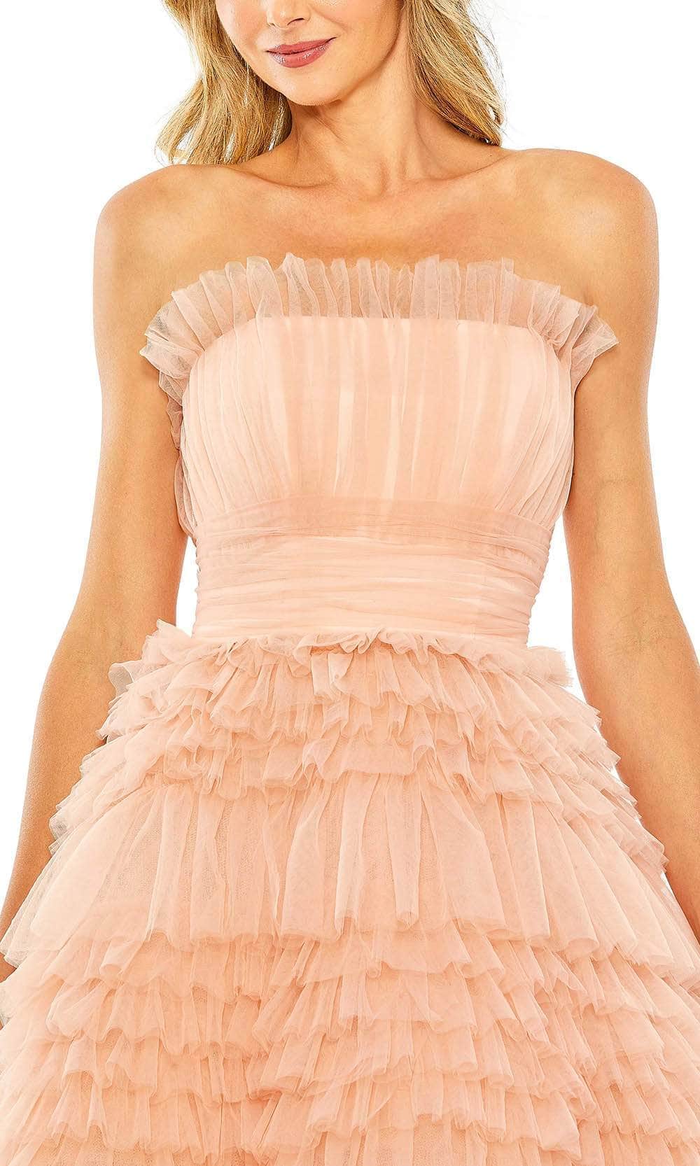 Admire the exquisite craftsmanship of this exceptionally designed Mac Duggal 20573 creation. Exceptionally tailored to conform with the feminine form, this elegant stunner features a strapless bodice and detailed with a straight-across neckline. Rendered with sheer ruffles along the neckline and a midrise back, the waist captured a wide pleated band. Beautifully layered in ethereal tulle, the skirt frames a voluminous A-line design that flows to touch the floor with a train. Enter the ballroom with the flair of a style princess in this beautiful Mac Duggal 20573 masterpiece. Models are wearing the Peach and Sage colors.
