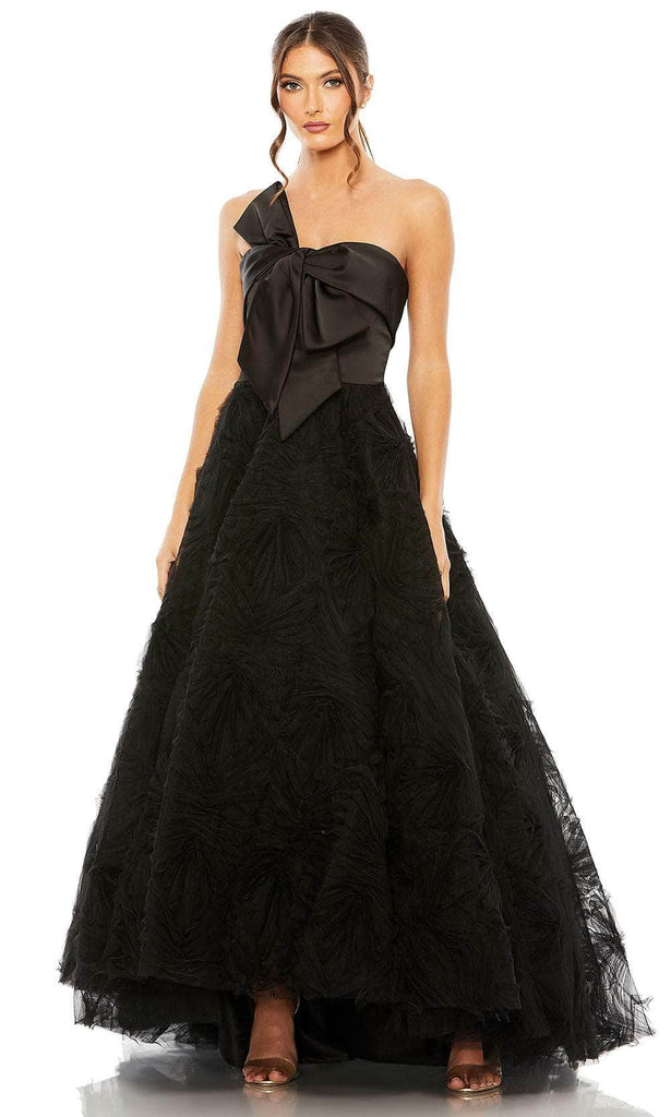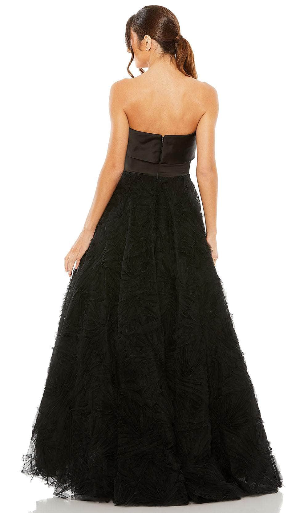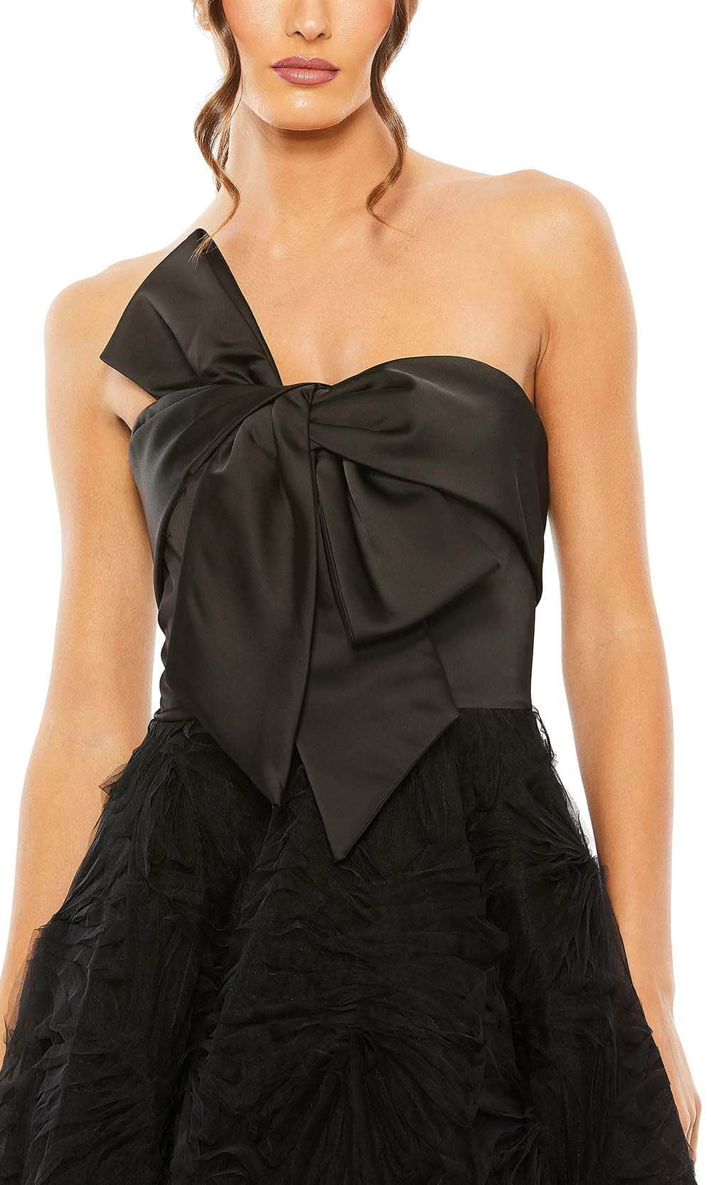 Saunter into the room with a dramatic flair in this evening gown by Mac Duggal 20584. This strapless style is detailed with a bow knot bodice for an elegant and unique touch. It comes with a sweetheart neckline and midrise back that reveals a glimpse of skin. The A-line skirt is designed with eye-catching ruffled tulle and finished with a high low hemline. Glamour gets gorgeous with this Mac Duggal 20584 masterpiece. Model is wearing the Black color.