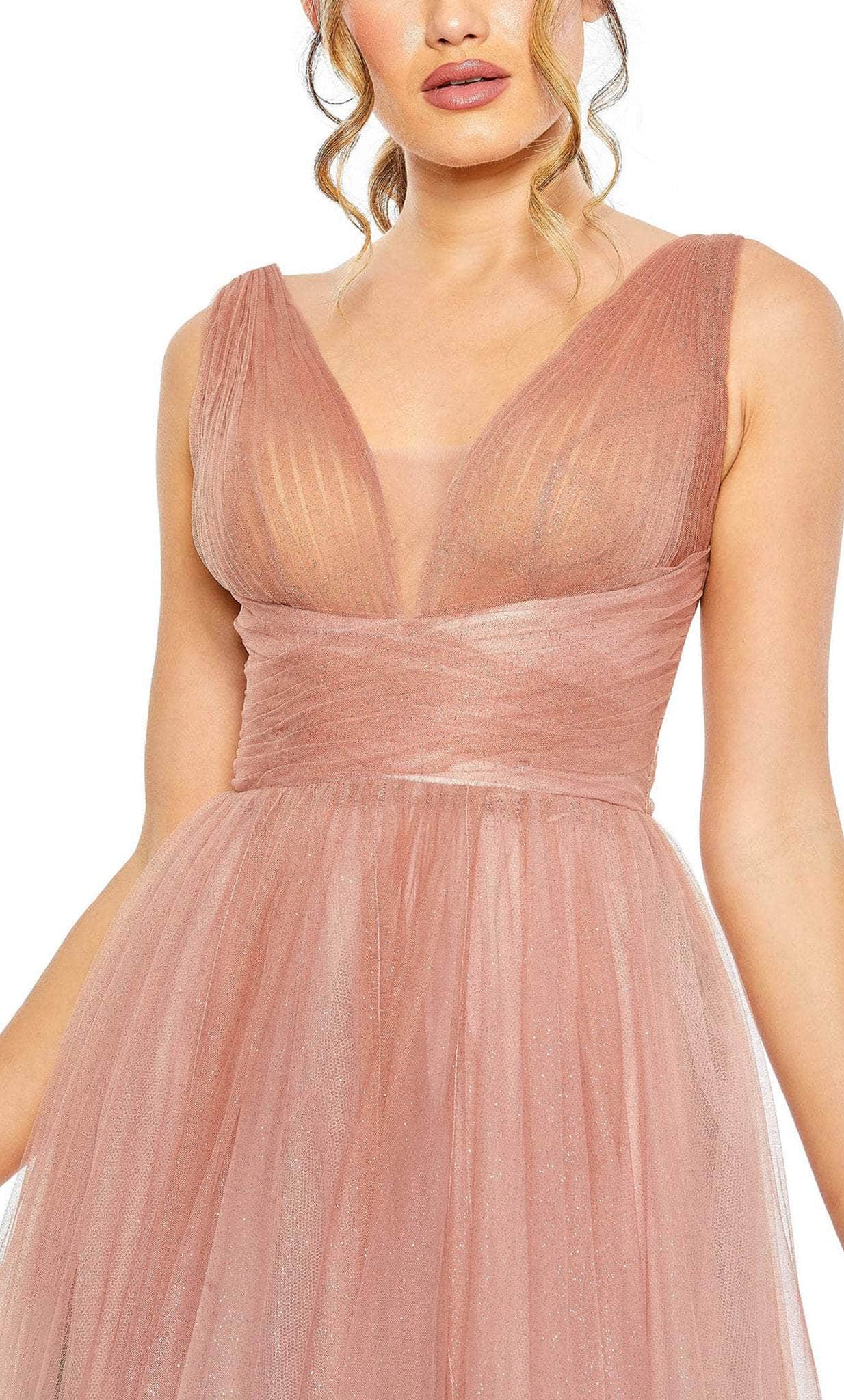 Step up your special event with our stunning Mac Duggal 20601 dress. Tailored from premium tulle fabric with glitter details. The fully lined body ensures a comfortable fit, while the V-neckline and sleeveless design exude timeless elegance. The wide waistband from the empire waist offers a flattering silhouette. The concealed back zipper ensures a sleek finish, while the A-line silhouette create graceful movement. The ombre effect adds a touch of sophistication to the dress, while the train offers a regal finish to this beautiful piece. Make a statement with this lovely dress from Mac Duggal 20601. Model is wearing the Vintage Rose color.