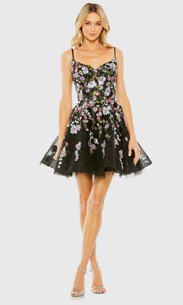 Elevate your style with the Mac Duggal 20643, a stunning creation in embroidered fabric. This dress features a sleeveless fitted bodice with delicate spaghetti straps and a flattering sweetheart neckline. The back is designed with a concealed zipper closure for a perfect fit, while the short-length A-line skirt adds a playful touch. This Mac Duggal 20643 blends intricate embroidery with a chic silhouette, making it an exquisite choice for any special occasion. Model is wearing Black Multi color.