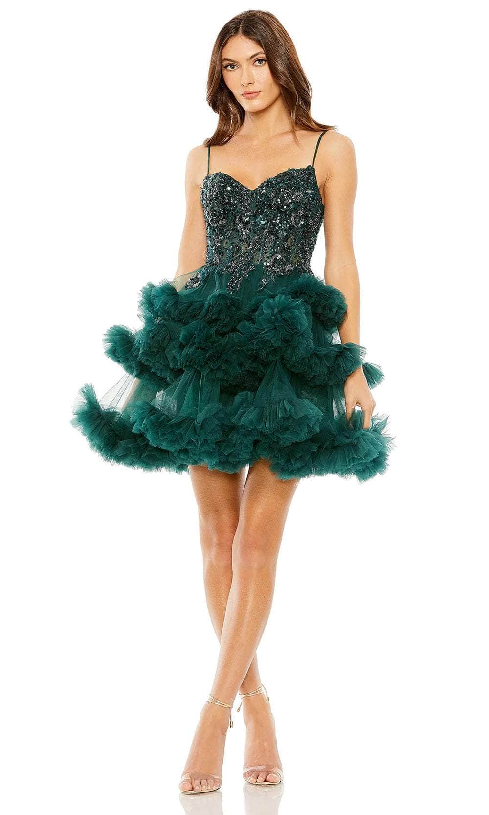 Leave everyone speechless when you enter the room in this Mac Duggal 20645 cocktail dress. This fabulous dress showcases a sweetheart neckline on a fitted and bead embellished bodice which also features spaghetti straps. Aside from that, the top has the style of an illusion and corset. The captivating skirt is layered and exhibits ruffle designs. Additionally, the back is mid-open and is secured by a back zipper. This Mac Duggal 20645 is the perfect prom dress for the girl who wants to stand out from the crowd while looking glamorous. Model is wearing Hunter Green color.