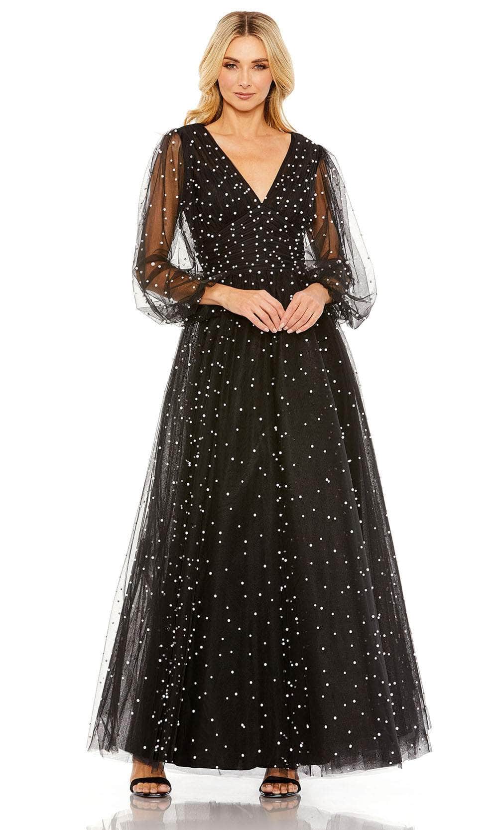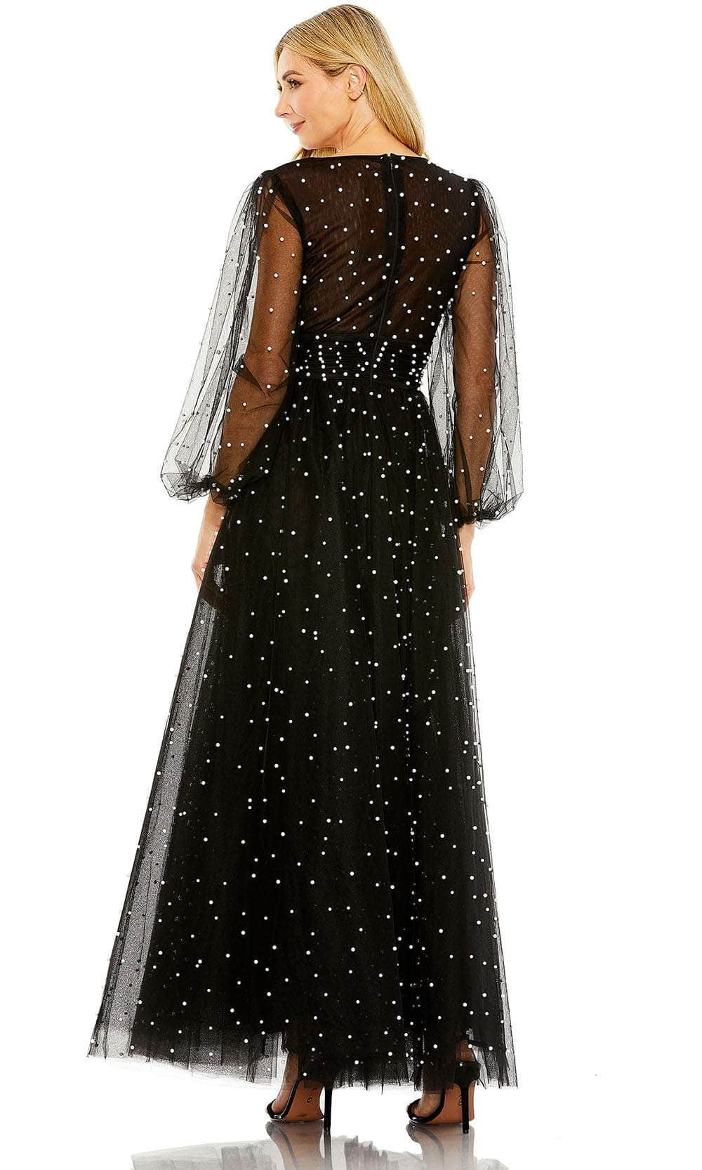 Elevate your evening with the Mac Duggal 20746 gown, adorned with exquisite pearl beading. This gown features elegant sheer long sleeves and a flattering V-neckline that complements the sheer full back, secured by a central zipper for a perfect fit. This piece also flaunts an empire waistline. The full-length skirt cascades in a graceful A-line silhouette, exuding timeless sophistication and charm. Be the delight of the eyes of everyone in this fabulous Mac Duggal 20746 masterpiece. Model is wearing Black/Ivory color.