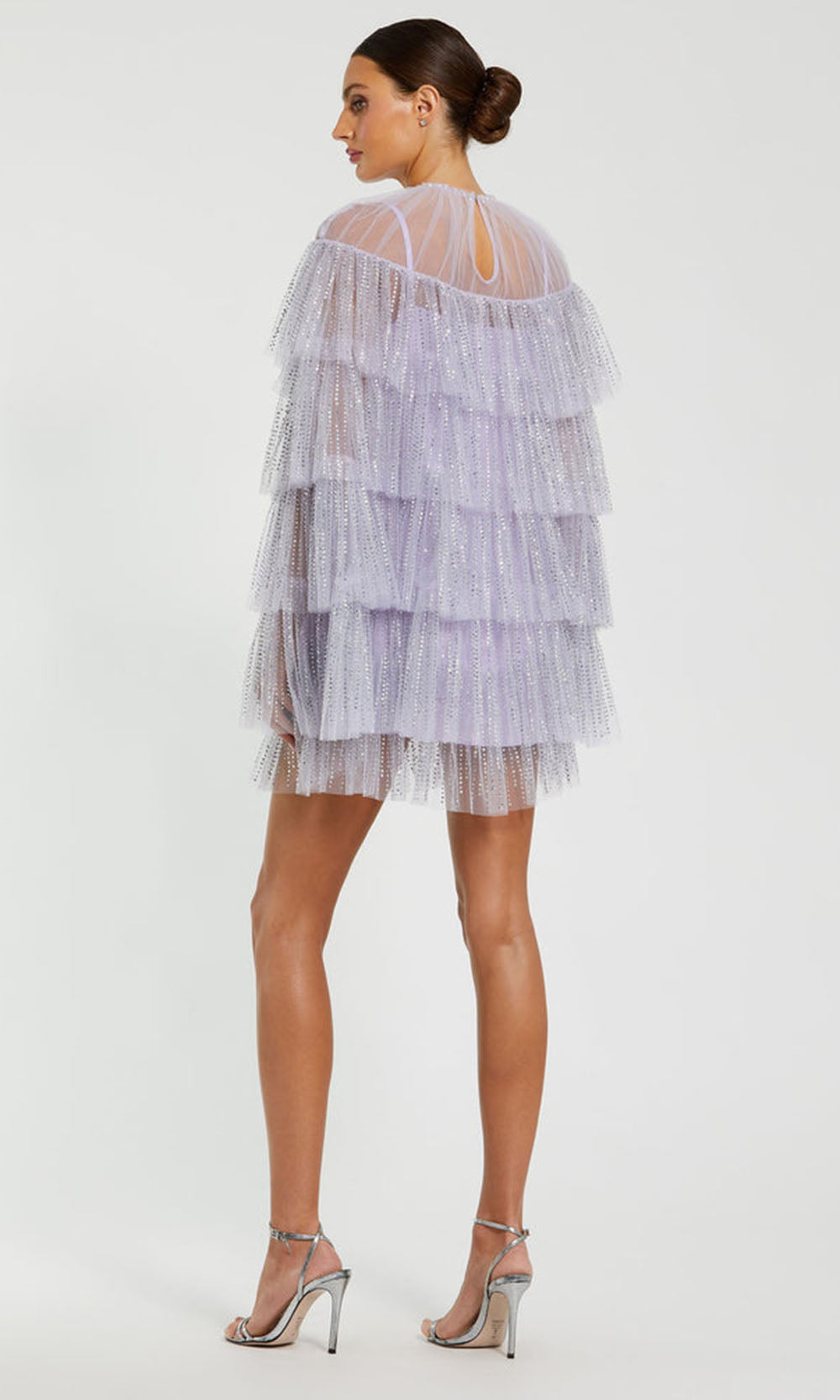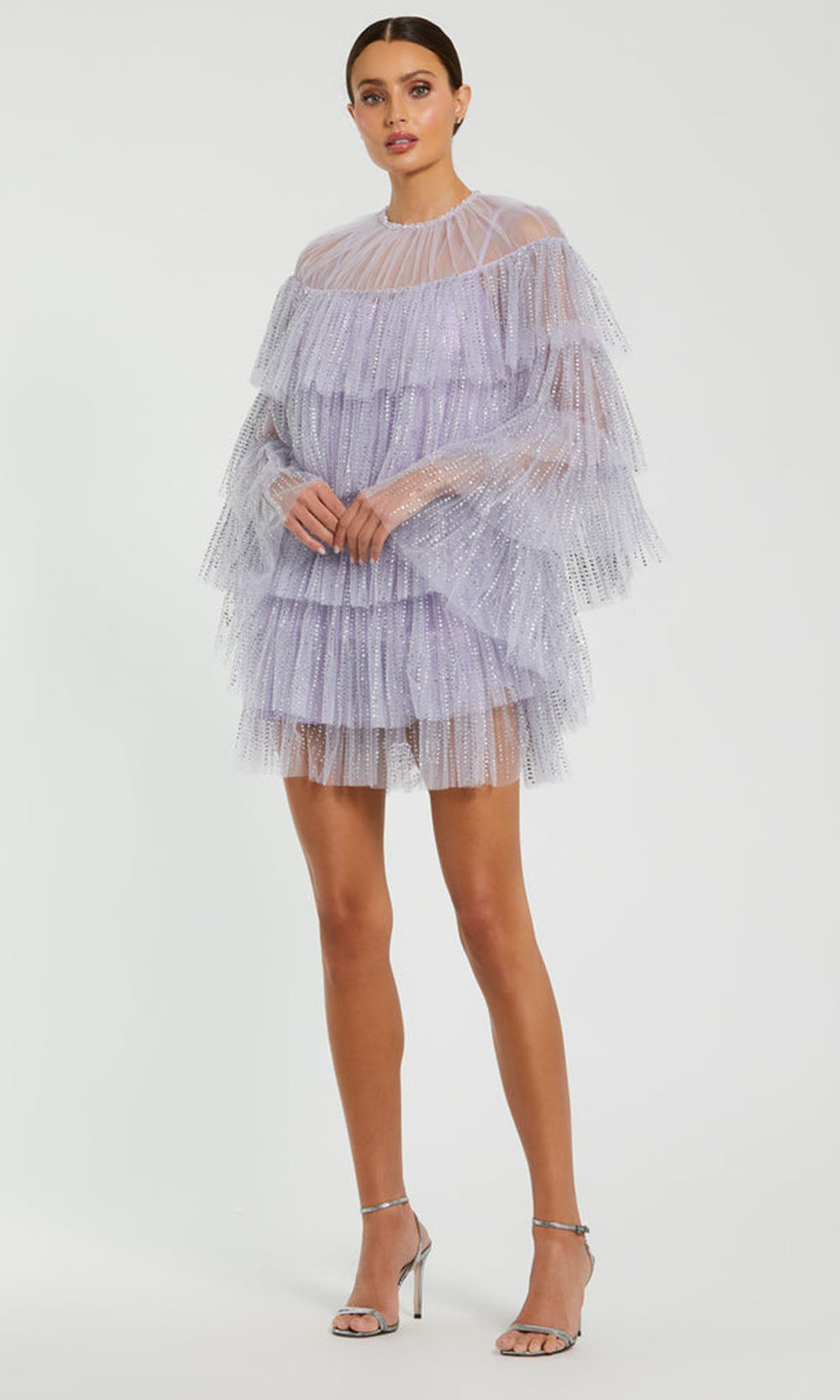 Light up the room in this stunning party-ready dress from Mac Duggal 20749. This short A-line ensemble is designed with beaded embellished mesh and ruffles, cascading in carefully placed tiers from high neckline to hem. The sheer yoke and capelet sleeves add contrast and softness to the structured volume of the body. Light catches the layers beautifully, enhancing each graceful motion. Those who appreciate innovative structure will find Mac Duggal 20749 style the perfect addition to their event wardrobe. Model is wearing Lilac color.