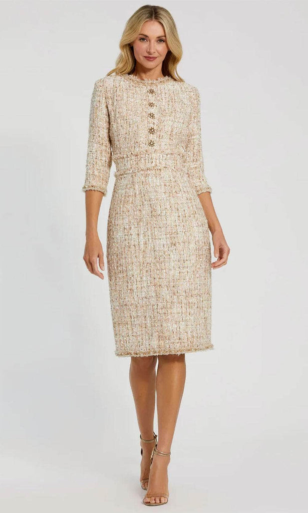 Leave an unforgettable mark by embracing the elegance and beauty of this Mac Duggal 20809 masterpiece. Fashioned from textured boucle fabric, the dress is adorned with floral beaded buttons in the front and beaded trim for a hint of sparkle. The stylish ruffles bring an undeniable charm that draws the eye. Additional features are a jewel neckline, full back design, quarter-length sleeves, and wide waistband. The sheath skirt falls to a graceful knee-length hemline and culminates in a center-back slit. This Mac Duggal 20809 dress is perfect for a standout style and flawless fit. Model is wearing Blush color.