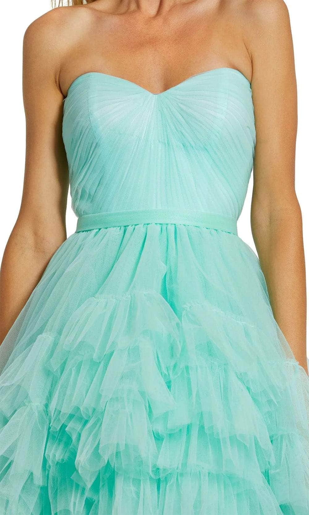 Enchant everyone with the ethereal beauty of the Mac Duggal 20892 gown. Crafted from delicate tulle adorned with fine ruching, this mesmerizing creation features a silhouette accentuated by tailoring lines. The strapless bodice boasts a sweetheart neckline, framing the décolletage with grace. A satin band cinches the waist to perfection, while a concealed zipper closure ensures a seamless fit along the midrise back. The layered A-line skirt adds dimension, adorned with ruffled accents and a high-low hem. Elevate your allure with the exquisite charm of the Mac Duggal 20892 masterpiece. Model is wearing the Aqua color.