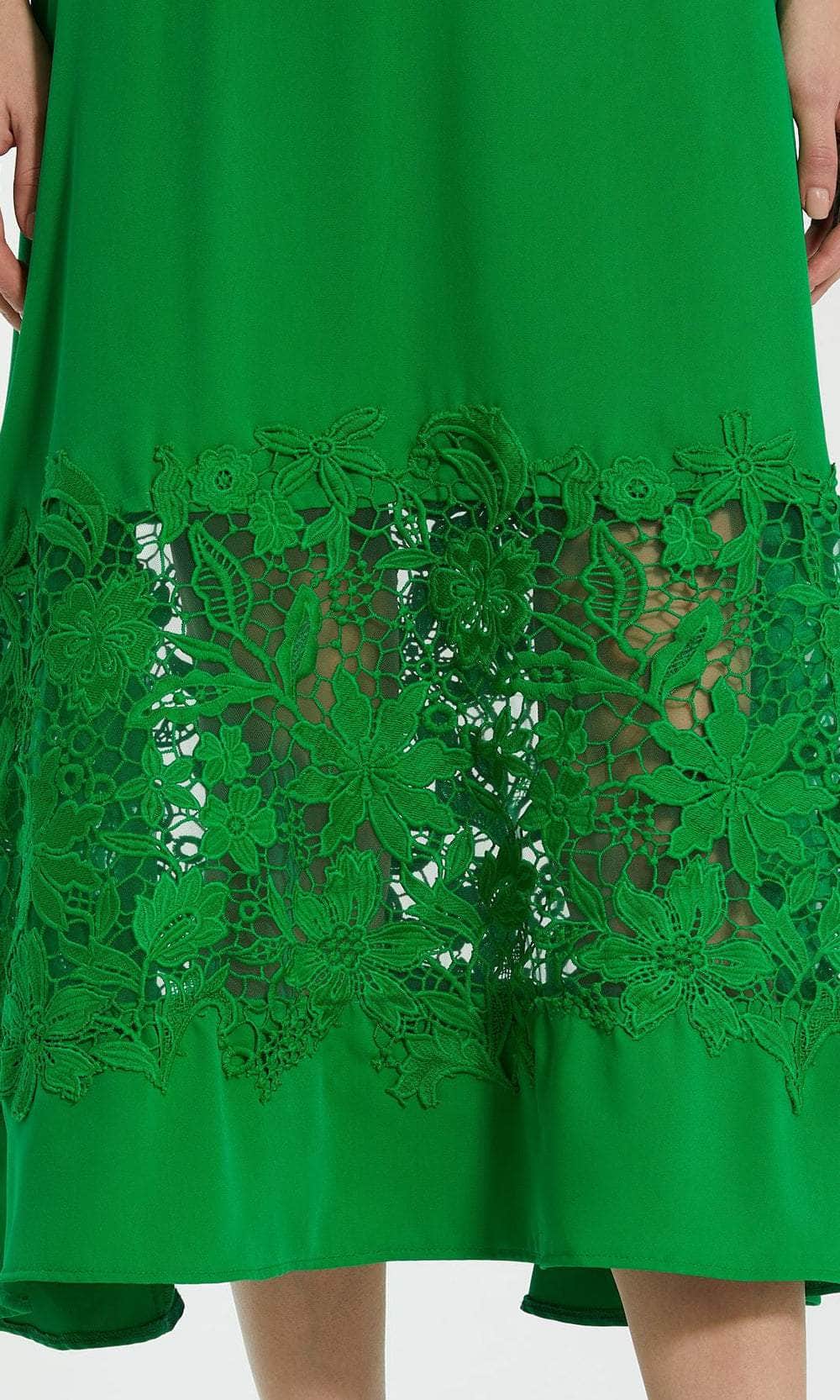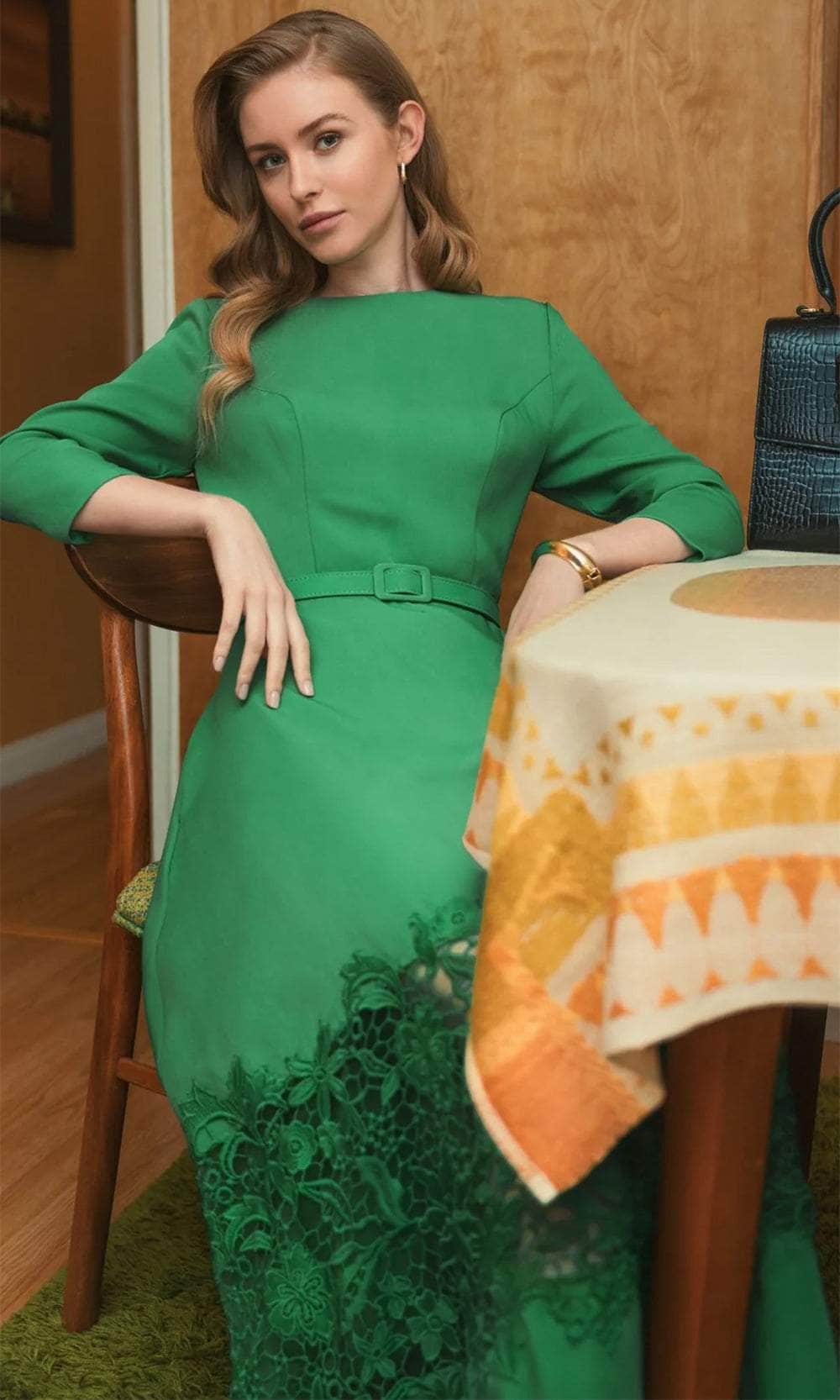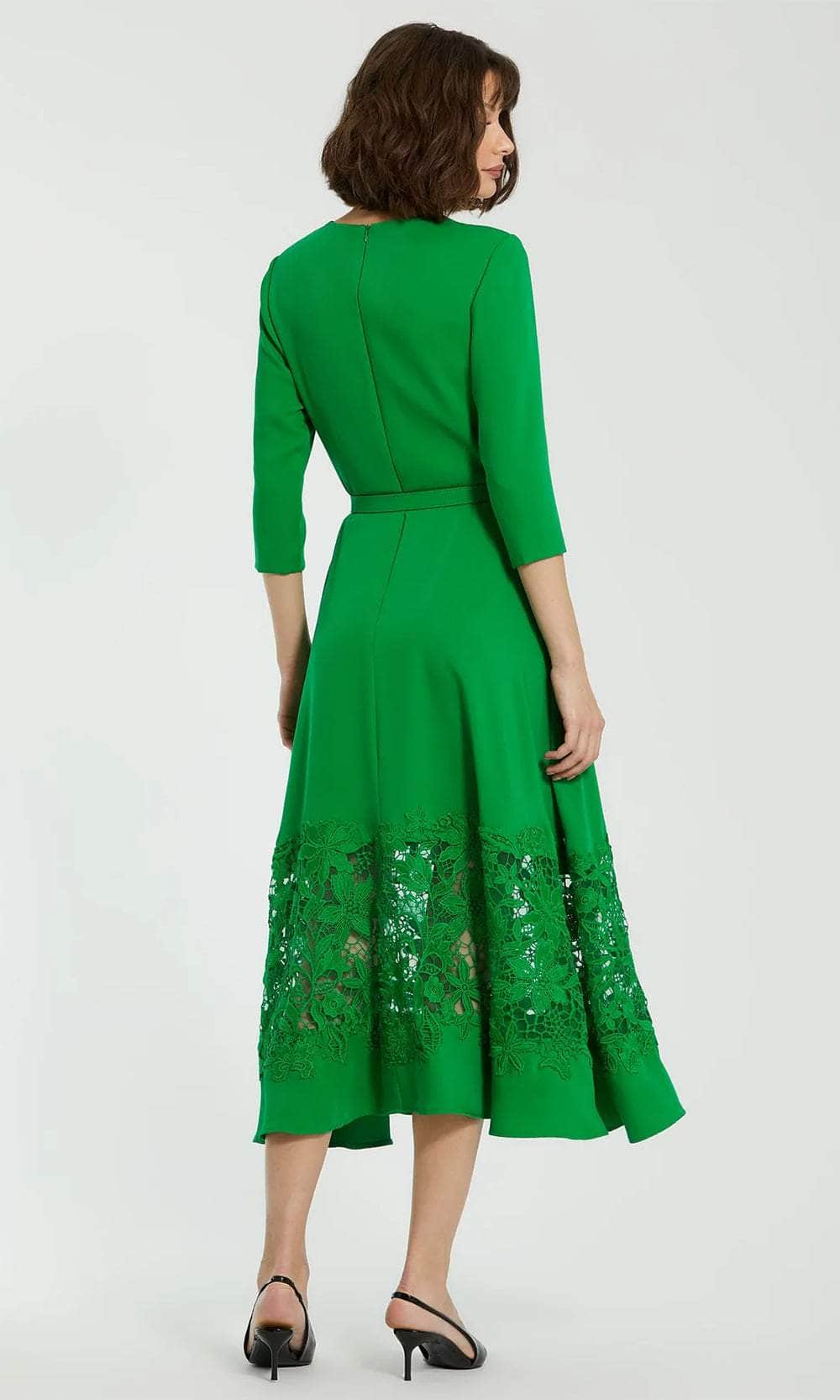 Turn yourself into a head turning sensation with this Mac Duggal 21001 dress, tailored from luxurious crepe fabric, showcases meticulous seams. It features flattering quarter sleeves and a jewel neckline for a timeless look. The tea-length skirt flows in an elegant A-line silhouette, adorned with delicate lace applique for added charm and elegance. Perfect for various formal events, this Mac Duggal 21001 combines classic design with modern accents, ensuring a refined and captivating appearance that stands out effortlessly. Model is wearing Spring Green color.