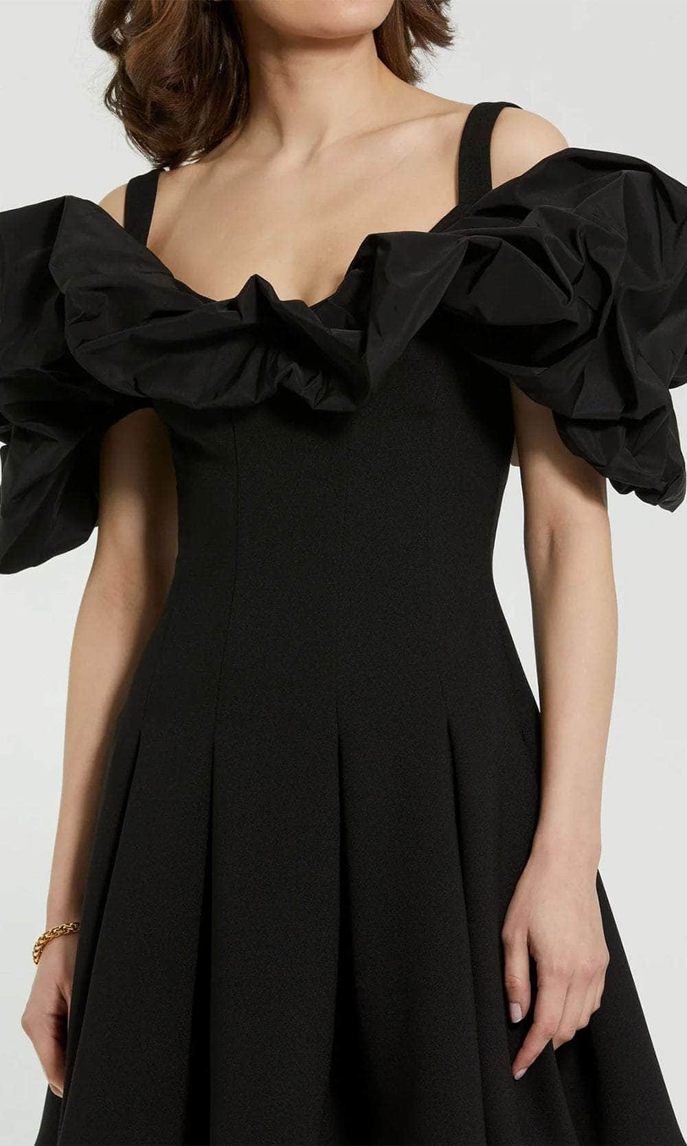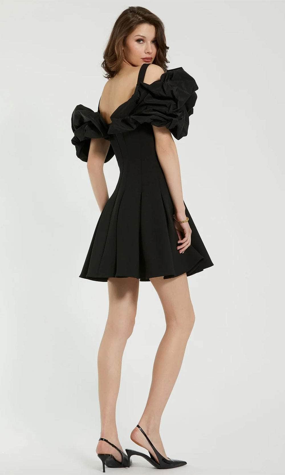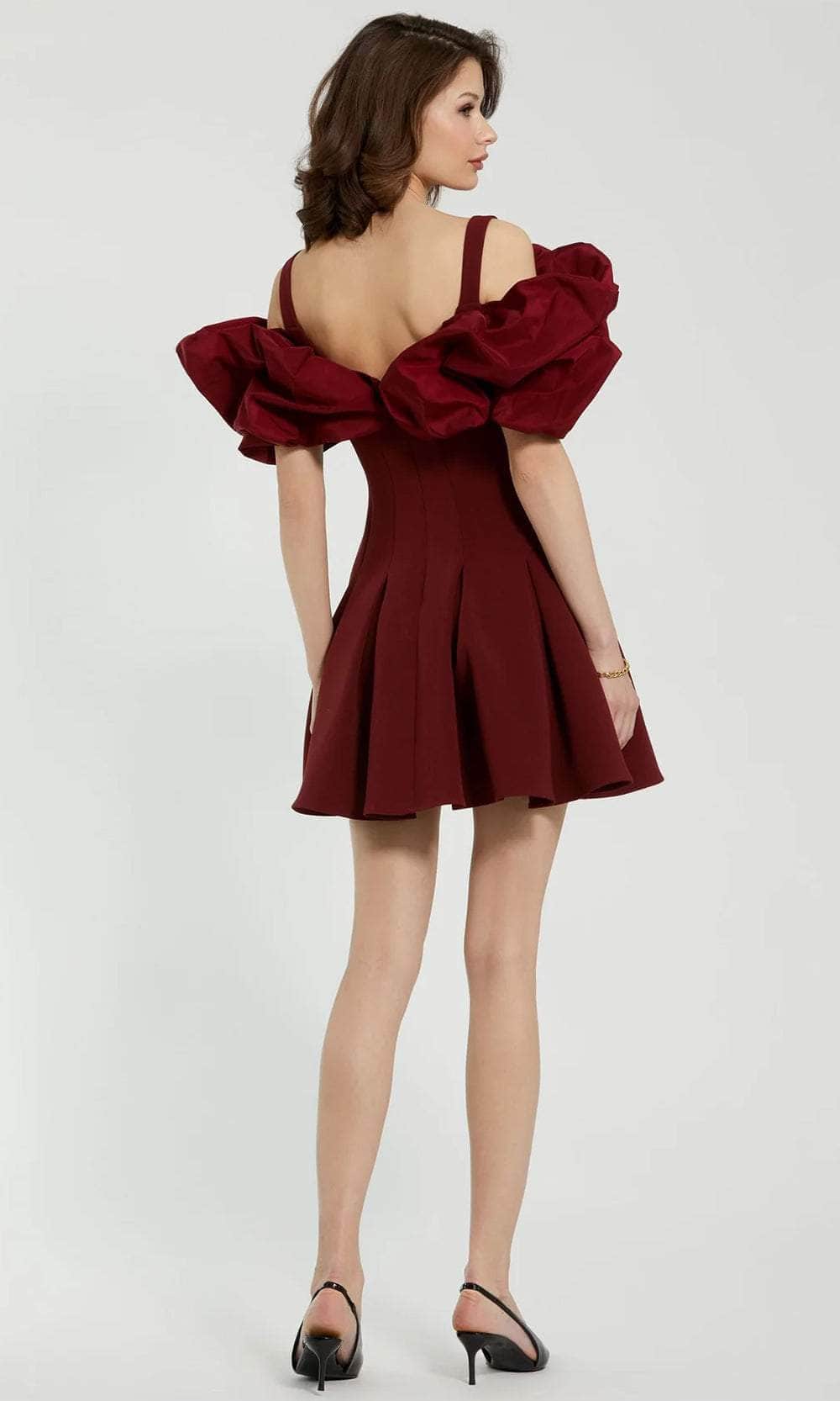 Have the crowd stop and stare when you wear this Mac Duggal 21025 masterpiece. This ensemble will make you look stylishly spectacular with its dramatic faille ruffles detailing on the off-shoulder neckline and short sleeves. The wide straps are included for extra support, and the mid-open cut in the back exudes allure. Sculpted seams are designed to elevate and flatter your fit. Flowing to the mid-thigh to perfectly show off your legs, the skirt finishes in an A-line silhouette with a playful godet insert. This Mac Duggal 21025 dress is perfect for any occasion, especially for a party or a special event. Models are wearing Black, and Oxblood colors.