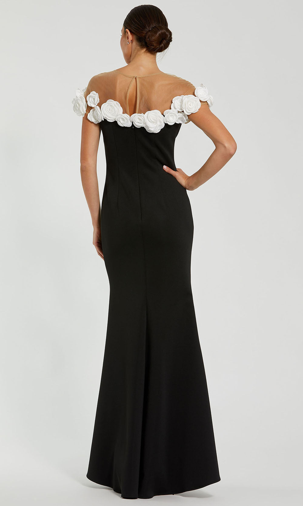 Mac Duggal 21041 dress combines sculptural beauty with striking simplicity, offering a design that is equal parts graceful and bold. The off-shoulder design reveals a stunning illusion jewel neckline and sculpted 3D floral embellishments that frame the collarbone. A tailored fit through the bodice flares gently into a mermaid skirt, creating an elongated and elegant profile. With its structured construction and classic shape, this ensemble becomes an instant statement. For sophisticated evenings that call for a balance of subtle drama and refined style, Mac Duggal 21041 delivers with poise and originality. Model is wearing Black Cream color.