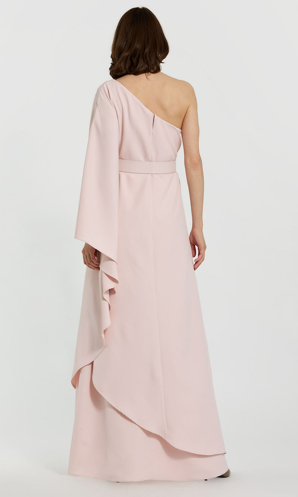 | Details: | One Shoulder Sleeve, Belted Waist, Mid-Open Back, Wrap Skirt |