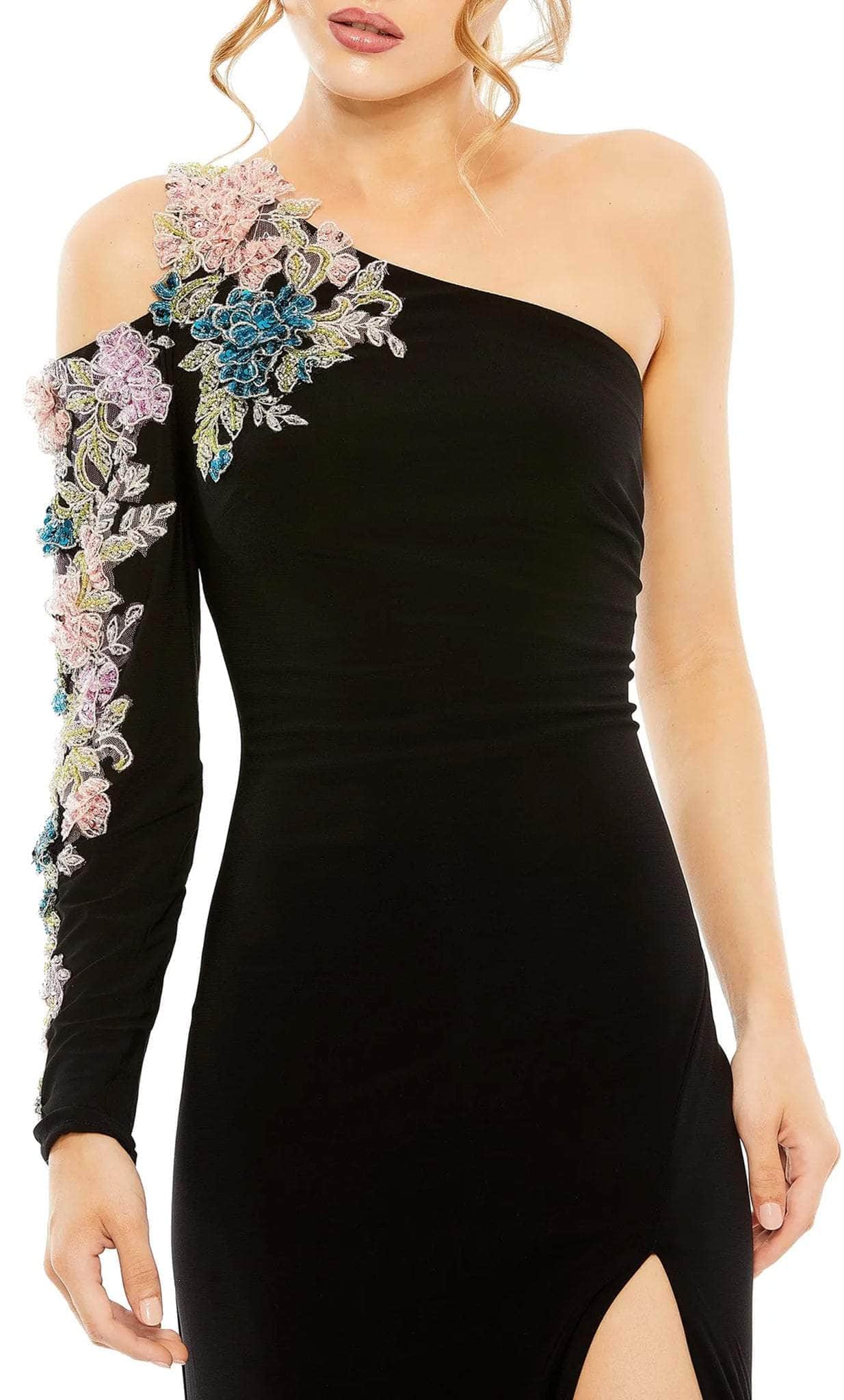 Embrace the stunning perfection bestowed by this Mac Duggal 2204 creation. Eloquently embroidered with a spectacle of beaded blossoms, this crepe sculpted silhouette features an asymmetrical neckline with a cold shoulder cutout and long sleeve design. Styled with a partial open back and a zipper closure, the sheath skirt is highlighted with a sexy slit as it waterfalls to the floor with its hemline. Lavish in the opulence and beauty of this inspired Mac Duggal masterpiece. Models are wearing the Black Multi and Peach Multi colors.
