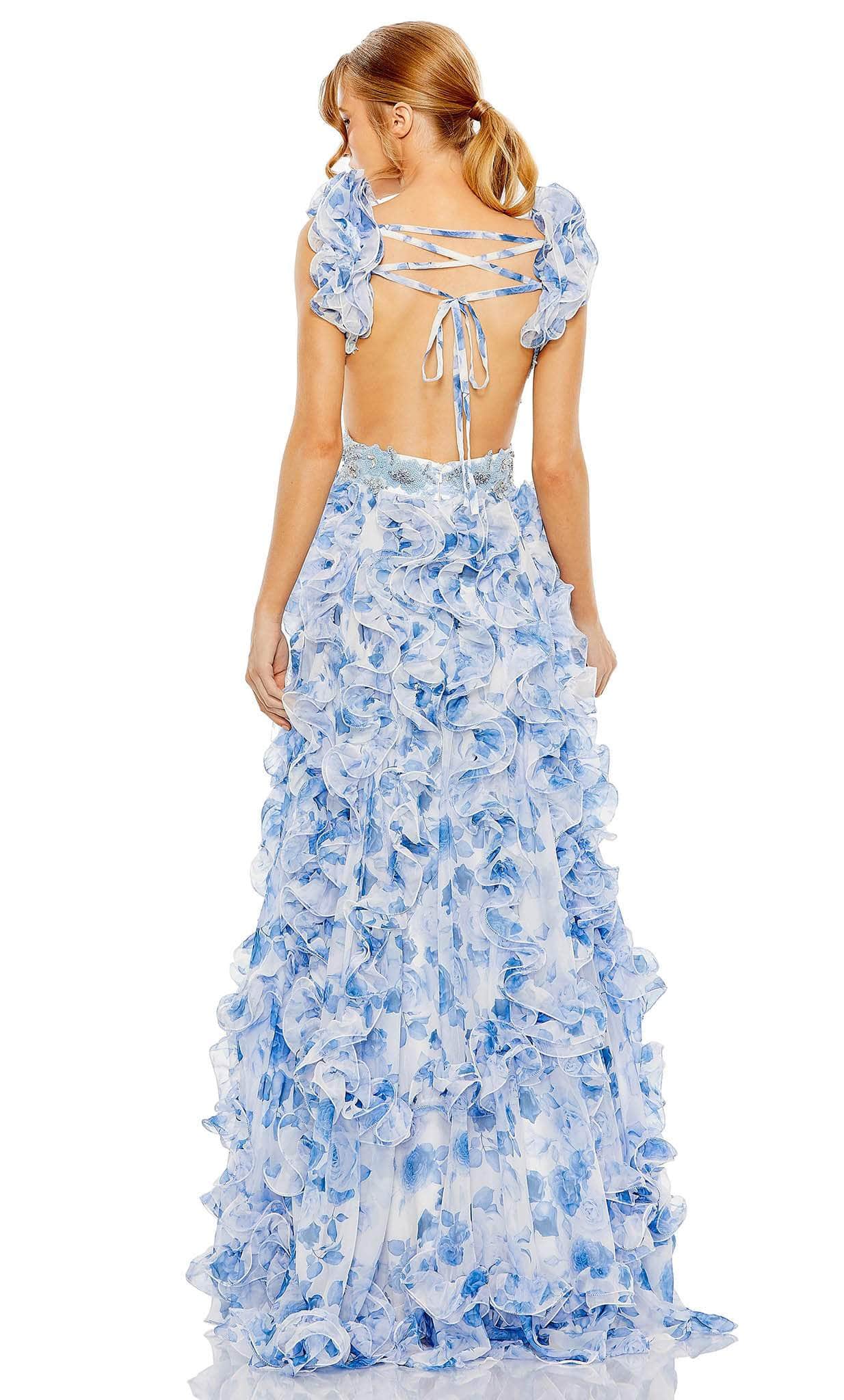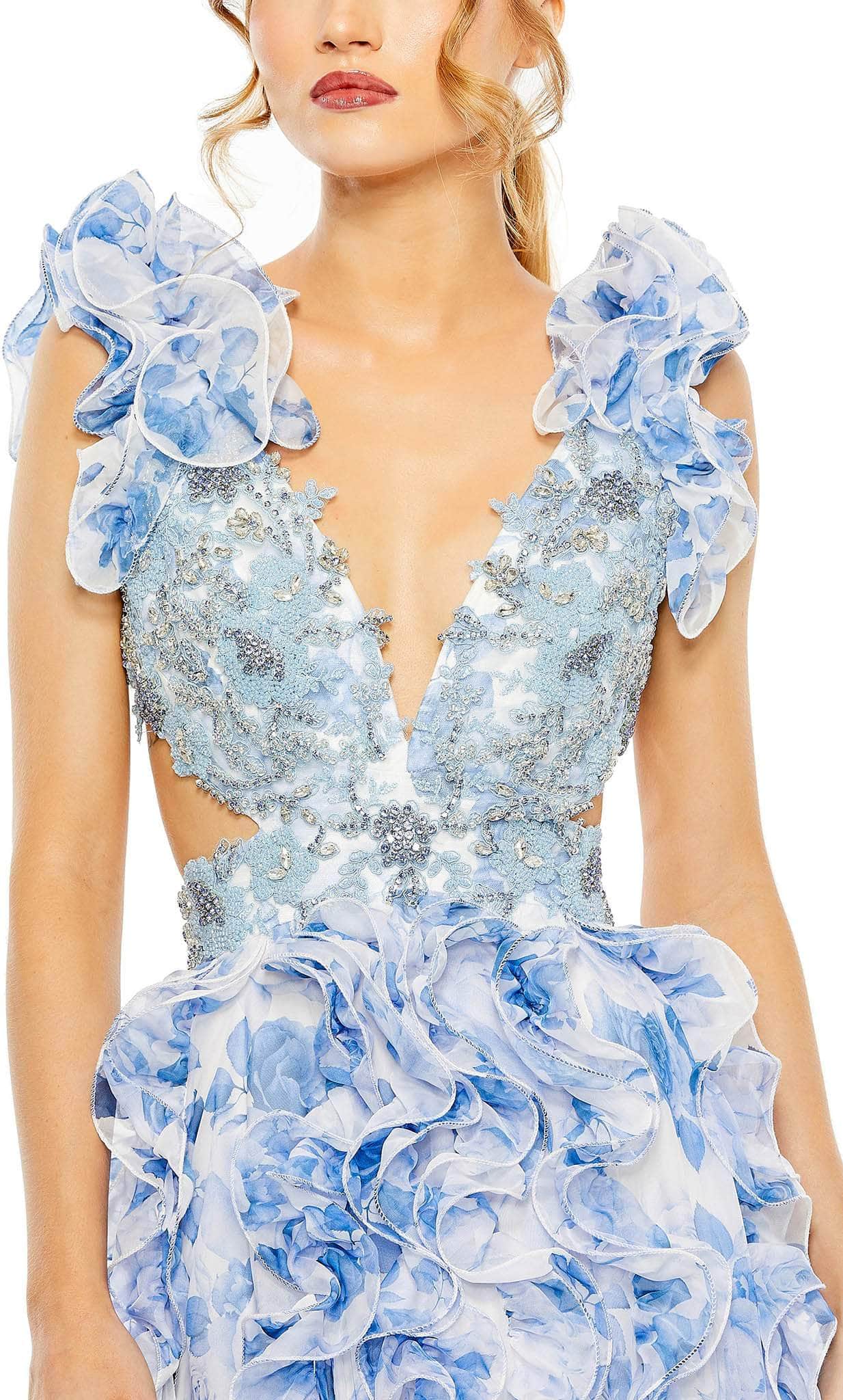 Mac Duggal 2220 gives you a feminine look fit for any special occasion. This multi-colored printed dress is a marvel. A deep V-neckline and side cutouts give seductive sophistication to the sleeveless bodice. Floral beadwork decorates this bodice. The skirt's delicate flower print and floor-length hemline create a graceful A-line silhouette. The airy, flowing material is great for formal occasions. You will definitely make a statement in every occasion with Mac Duggal 2220. Model is wearing Blue color.