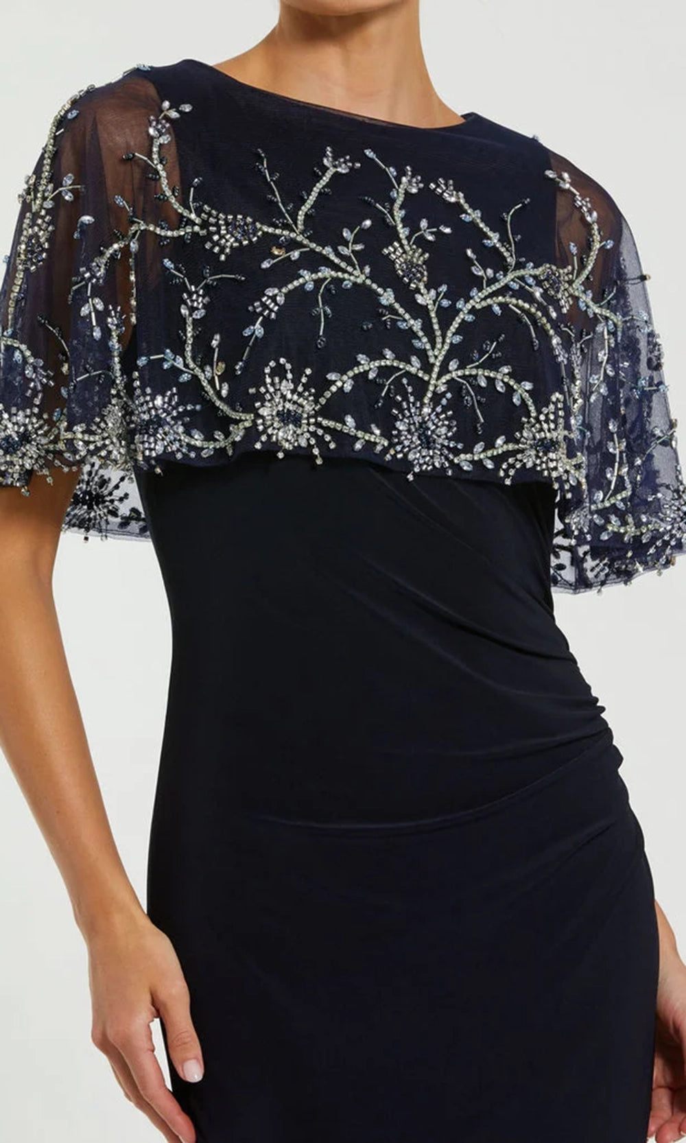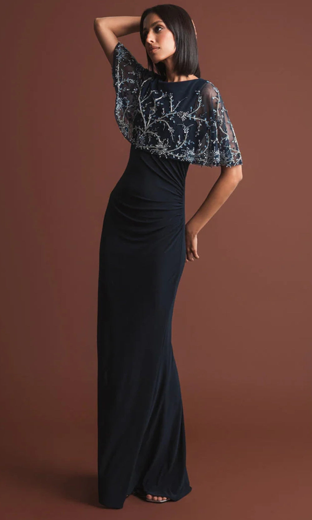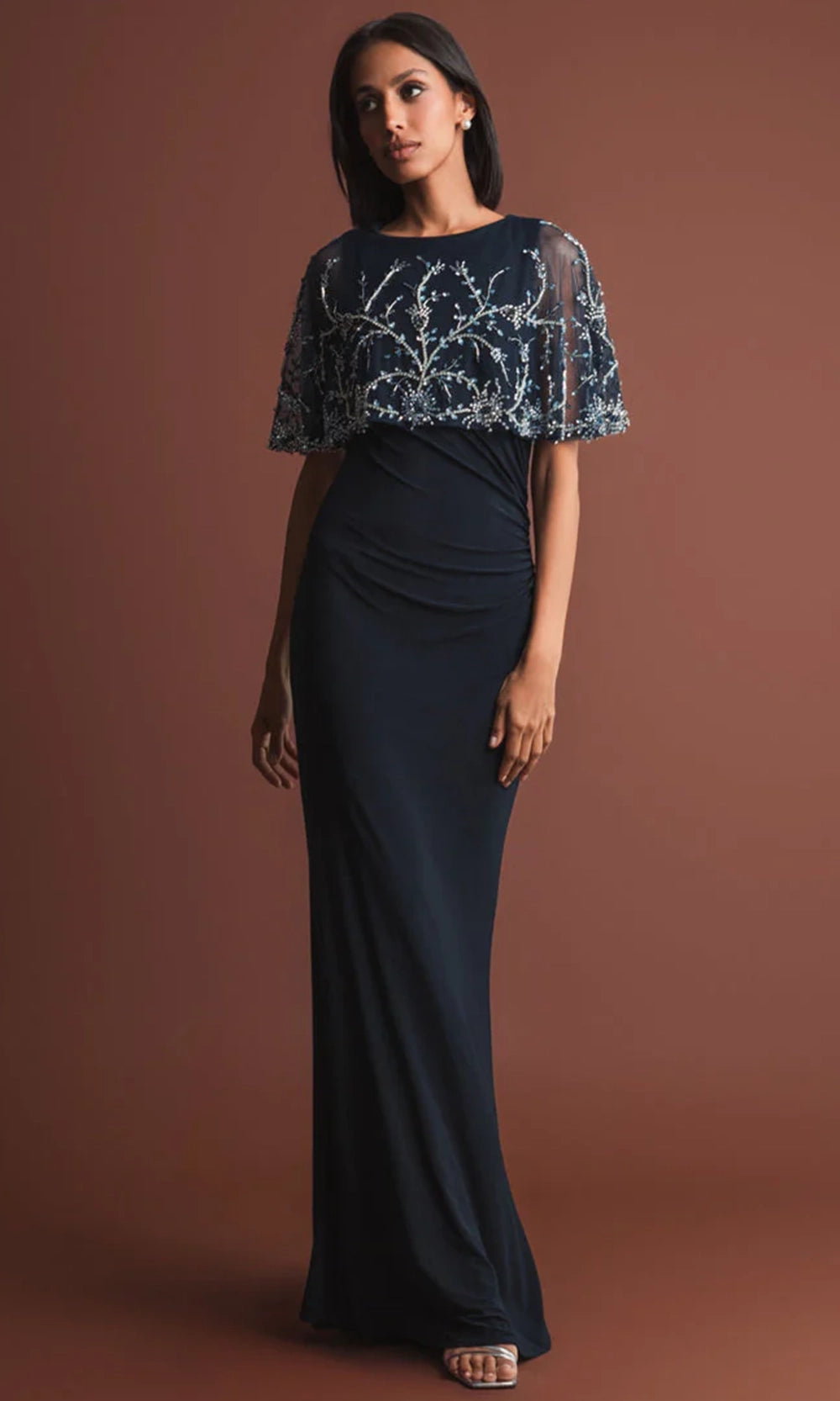 | Details: | Beaded Cape Overlay, Fitted Silhouette, Ruched Detail, Full Back |