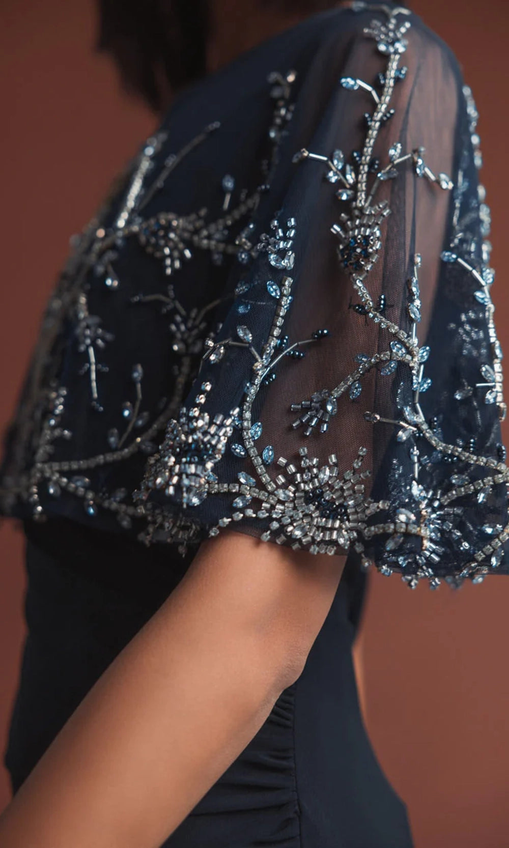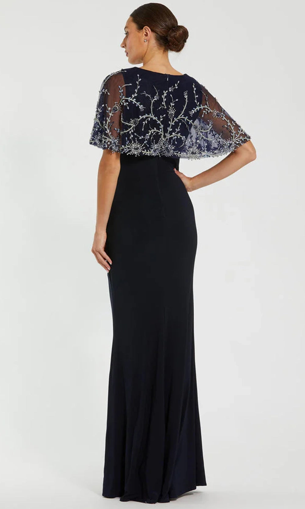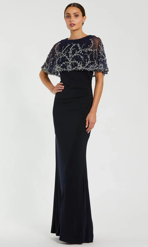 | Details: | Beaded Cape Overlay, Fitted Silhouette, Ruched Detail, Full Back |