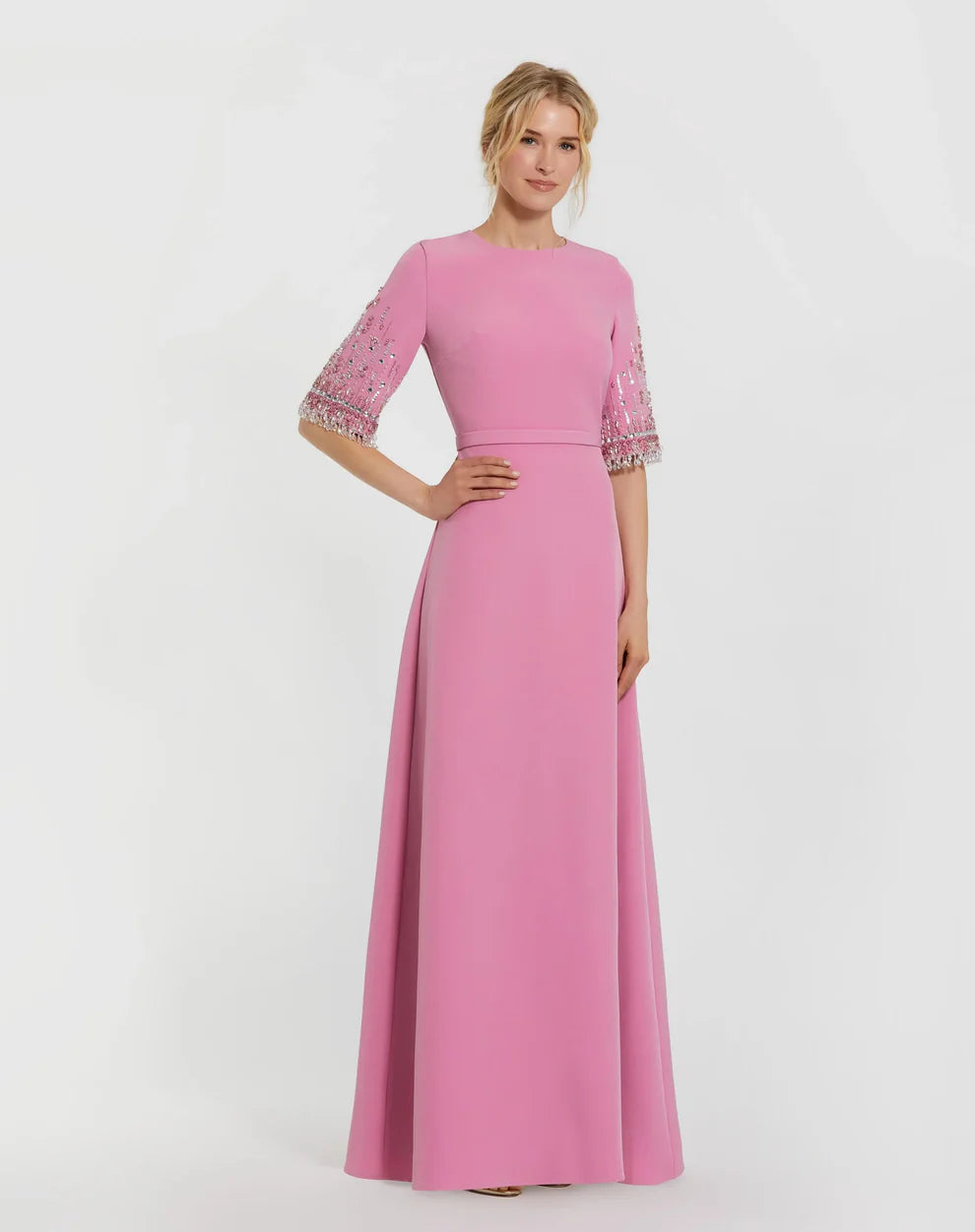 | Details: | Sleeveless, Beaded Sleeve Detail, Fitted Bodice, Concealed Back Zipper |