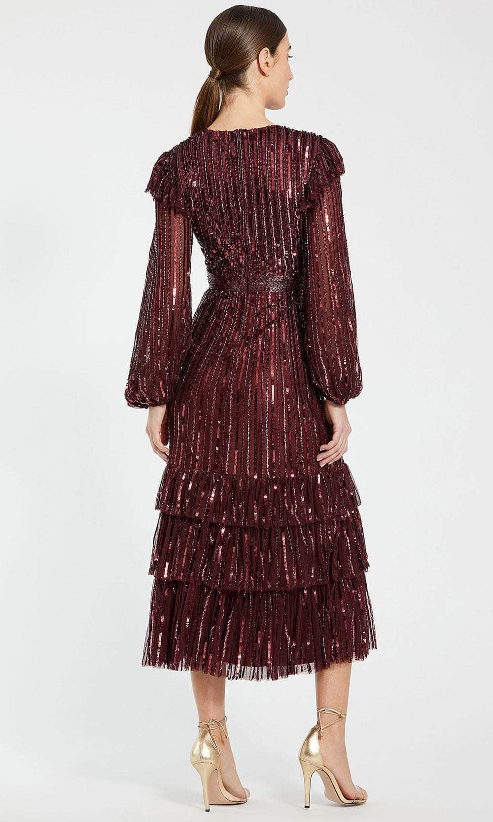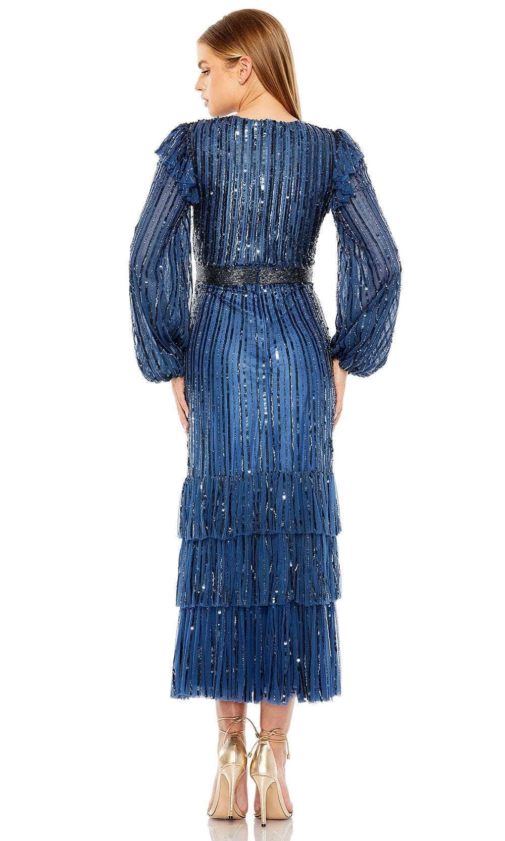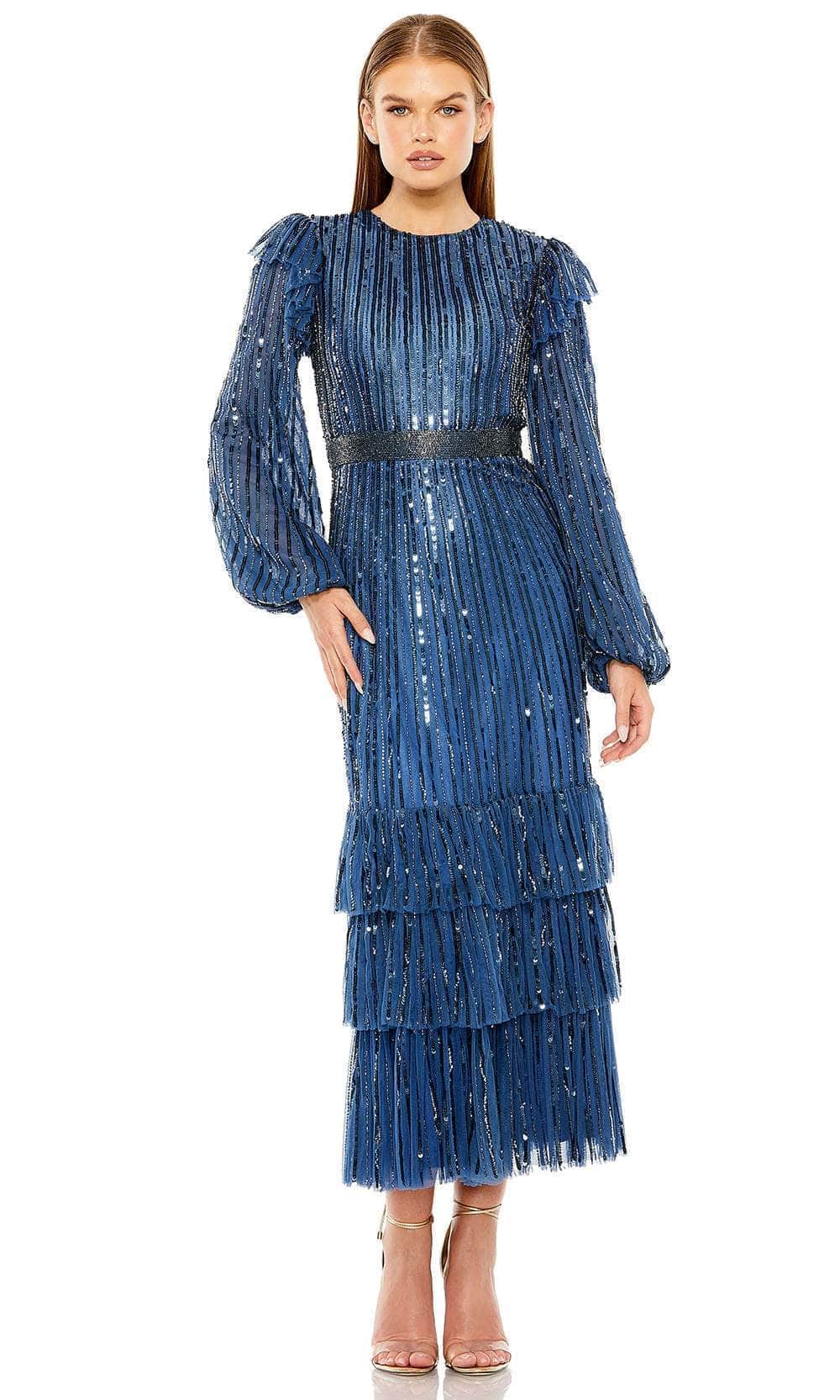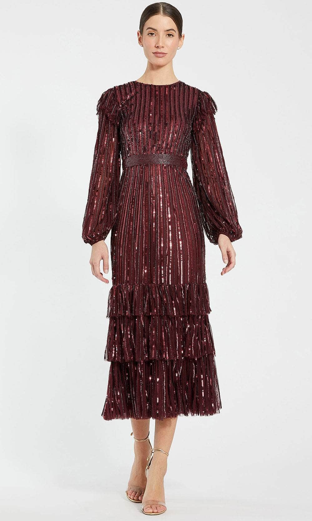 Create a captivating style that will captivate all in this enchanting evening with the Mac Duggal 23003 evening gown. Featuring an elegant jewel neckline and supported by charming long puff sleeves, the fitted bodice exudes grace. Adorned entirely with sequin embellishments and a beaded waist for added allure, this dress boasts a refined full back enclosed by a zipper. The tiered skirt showcases a sheath silhouette flowing down to its full length, embodying sheer elegance. Fall in love with the ethereal beauty of this stunning Mac Duggal 23003 masterpiece. Models are wearing Burgundy, and Midnight colors.