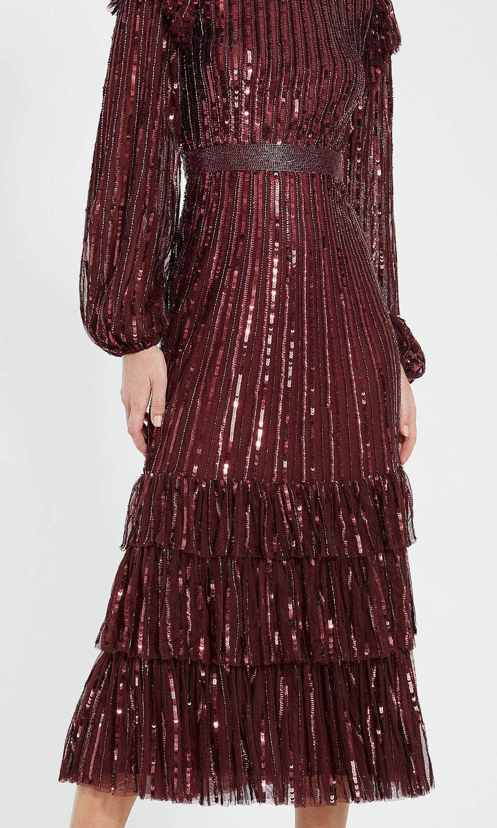 | Details: | Sequin Embellished, Beaded Waist, Long Puff Sleeves, Tiered Skirt, Full Back, Back Zipper |