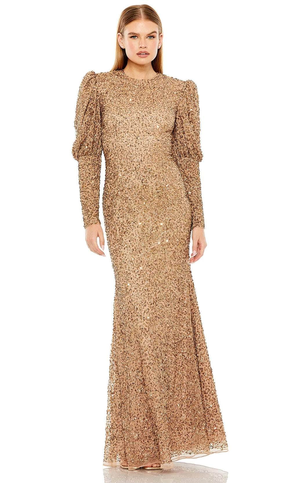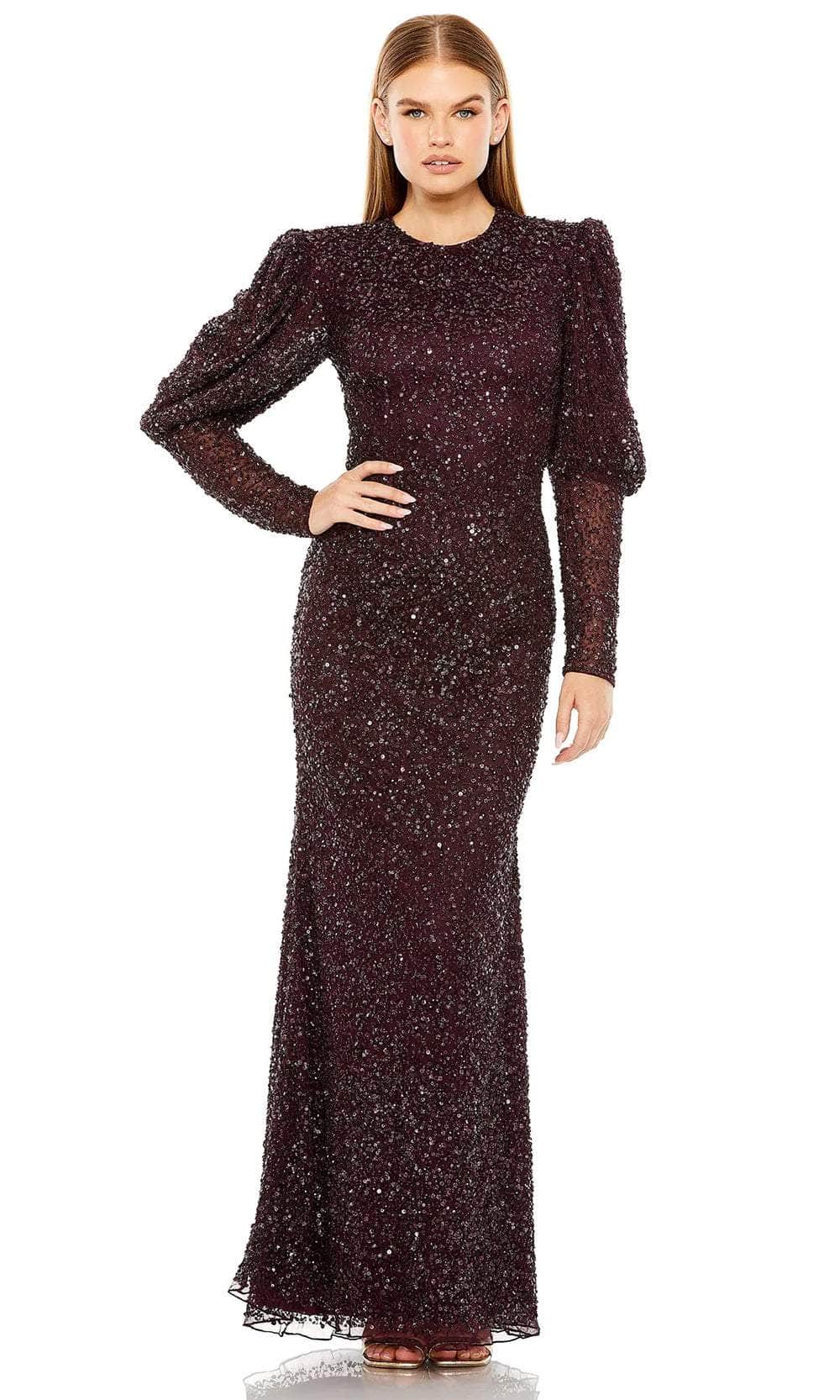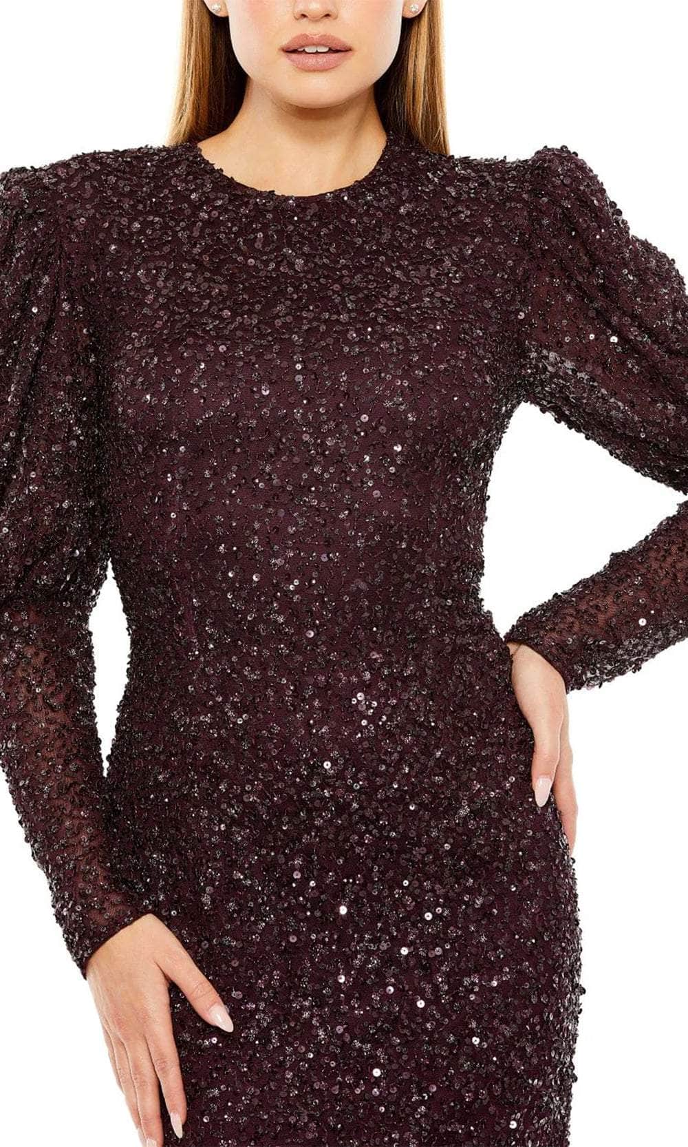 Radiate timeless elegance in the Mac Duggal 24000 masterpiece. This exquisite evening dress shimmers with an air of effortless sophistication. Crafted from gorgeous sequined mesh fabric, it sculpts your figure with a flattering jewel neckline. Delicate gathered long puff sleeves add a touch of romantic charm, while the fully lined trumpet skirt cascades into a dramatic full-length hem. The result? A silhouette that is both universally flattering and effortlessly glamorous. Ideal for weddings, galas, or any formal event demanding a touch of red-carpet allure, this Mac Duggal creation guarantees you'll be a vision of sophisticated beauty. Models are wearing the Blackberry and Copper colors.