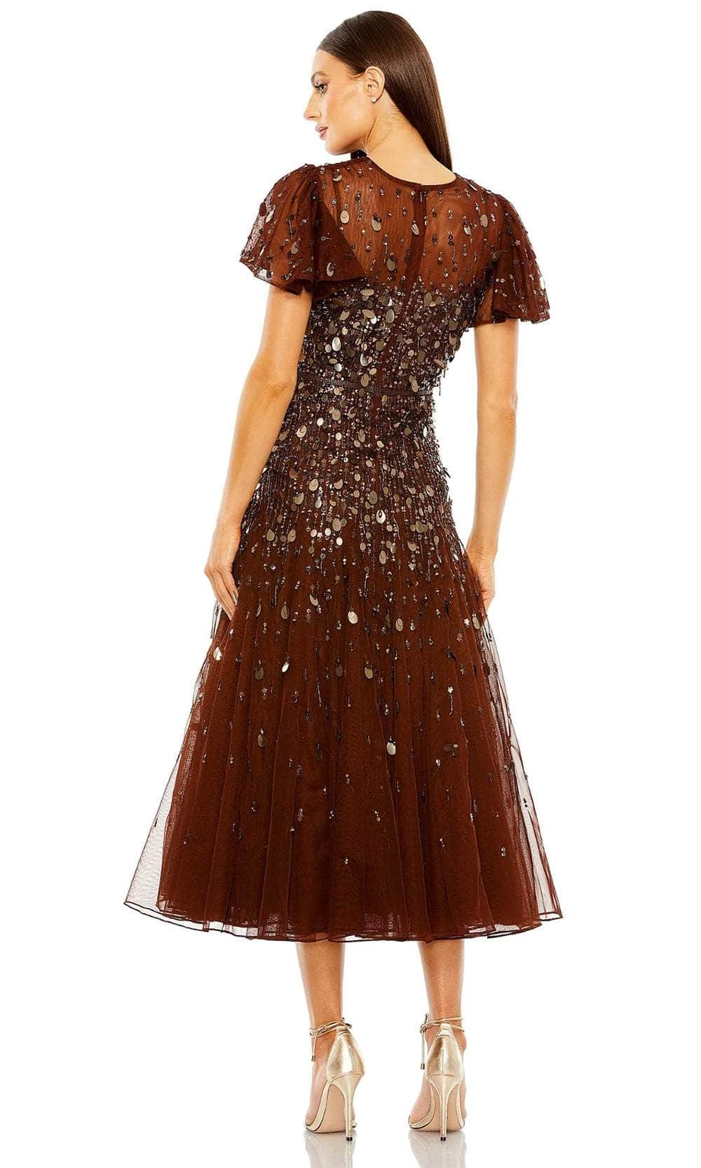 Beguile any gathering with timeless sophistication in the Mac Duggal 24018 masterpiece. This captivating tea-length dress flatters the figure with a beautifully beaded waist and an A-line skirt that cascades into a chic tea-length hem. The illusion jewel neckline adds a touch of regal elegance, while the delicate flutter sleeves offer a hint of romantic charm. Shimmering with hand-applied paillette sequins throughout, this dress is guaranteed to catch the light and turn heads wherever you go. From wedding guest appearances to afternoon soirees, the Mac Duggal 24018 creation ensures you'll radiate confidence and unforgettable glamour on any occasion. Model is wearing the Espresso color.