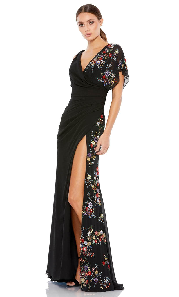 | Details: | Short sleeves, Floral beads, Faux wrap, Fitted bodice, Formal, Deep neckline, High slit, Open cowl back, Floor length |