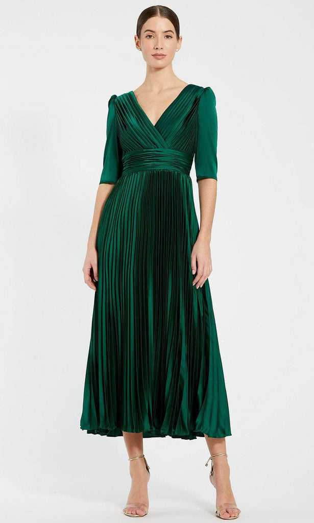 Achieve the epitome of grace and beauty in this Mac Duggal 27341 creation. The dress is made of opulent satin charmeuse fabric and features attention-grabbing pleated detailing all over the bodice. It also displays a surplice v-neckline that beautifully highlights your collarbones, while the quarter-length sleeves add a touch of modesty. The A-line skirt gracefully flows down to a tea-length hemline. It is completed with a wide waistband and full zippered back. This Mac Duggal 27341 dress is perfect for your next formal or evening event! Model is wearing Emerald color.